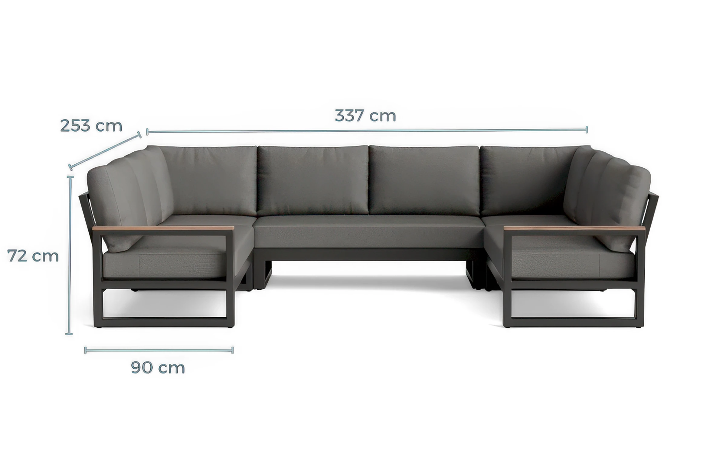 Szkielet mebli bazuje na surowej, geometrycznej formie wykonanej z aluminium malowanego proszkowo w kolorze głębokiego antracytu. Materiał ten zapewnia konstrukcji pełną niewrażliwość na wilgoć i korozję, pozostając jednocześnie wizualnie lekkim elementem otoczenia. Ciemna rama stanowi idealne tło dla obszernych poduszek w odcieniu "Mist Grey", które zostały wykończone techniczną tkaniną Soltex. Hybrydowa struktura materiału sprawia, że jest on niezwykle odporny na promieniowanie UV, a jednocześnie zachowuje miękkość i "domowy charakter" tekstyliów wnętrzarskich.