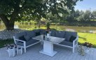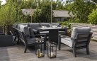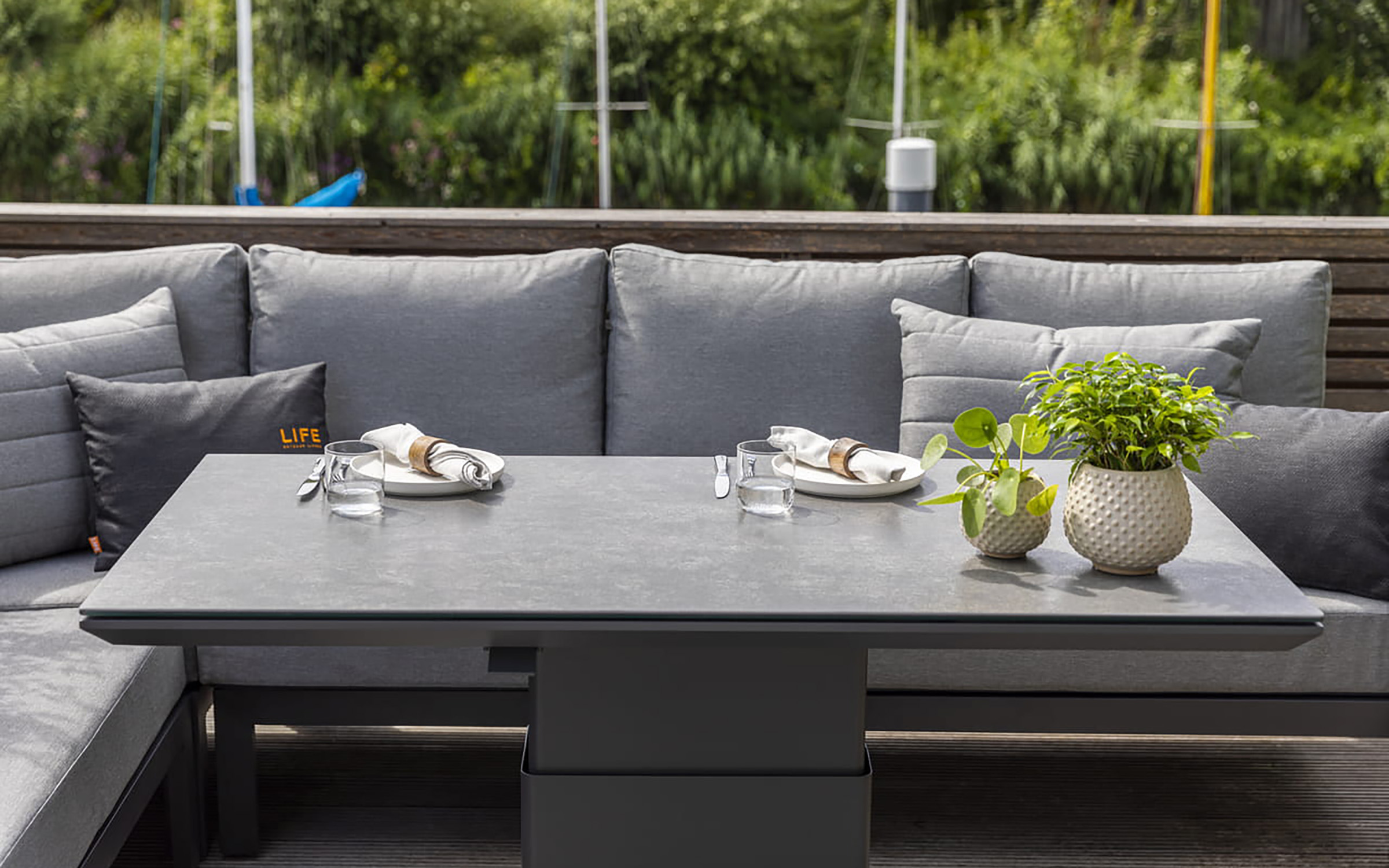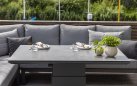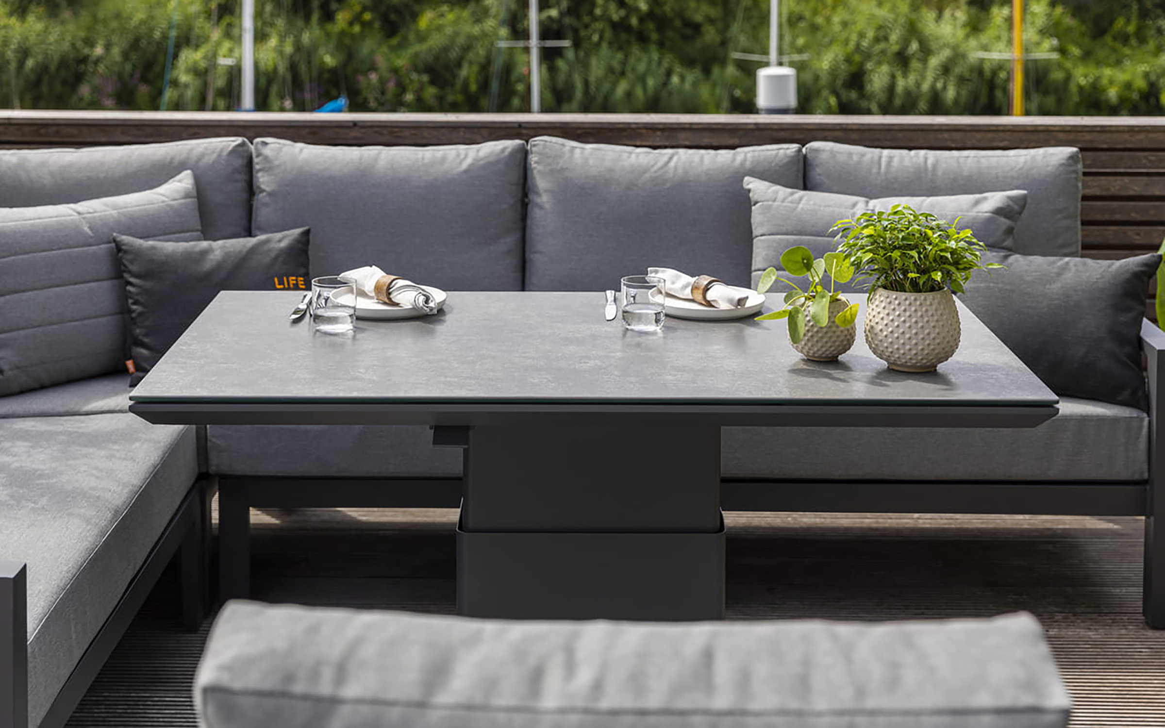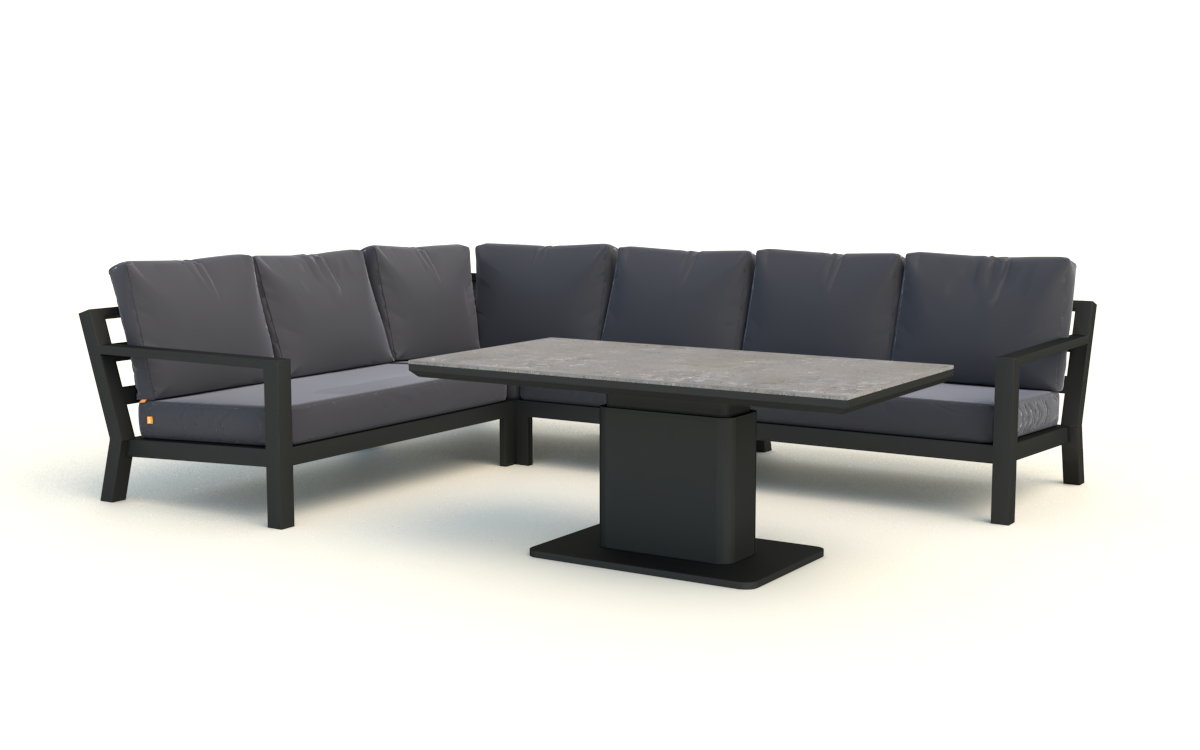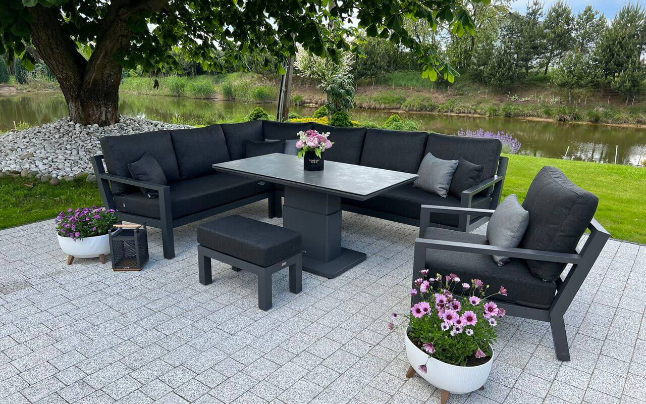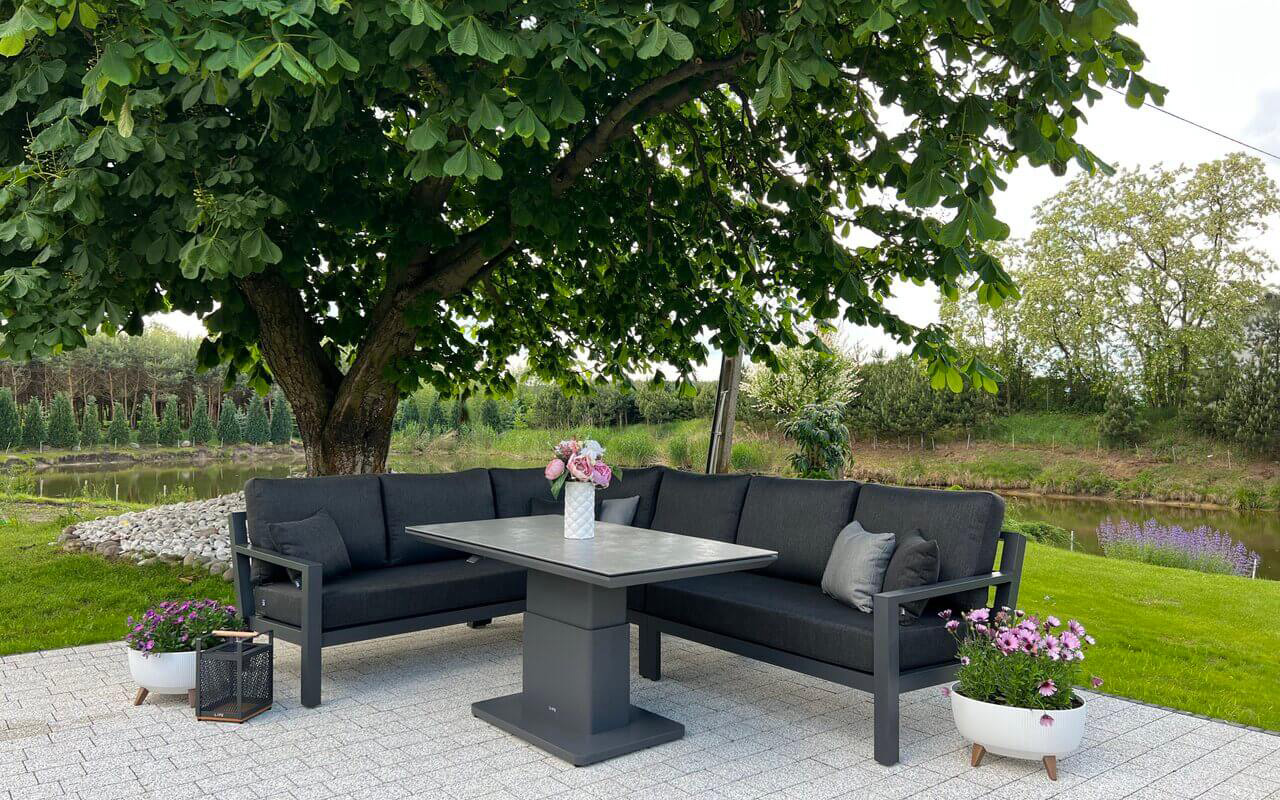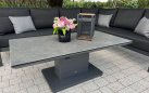 Stół podnoszony na jednej szerokiej podstawie oferuje płynną regulację od kawowej wysokości 48 cm do "obiadowej" 74 cm. Regulacja odbywa się za pomocą siłowników gazowych i dĹşwigni pod krawędzią stołu. Po naciśnięciu dĹşwigni stolik sam się podnosi. Aby obniżyć należy wywrzeć nacisk na blat. Blat stołu wykonany z płyty ceramicznej o wykończeniu beton look. Taki blat jest trwały (ceramika) i niewrażliwy na warunki atmosferyczne.