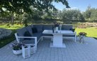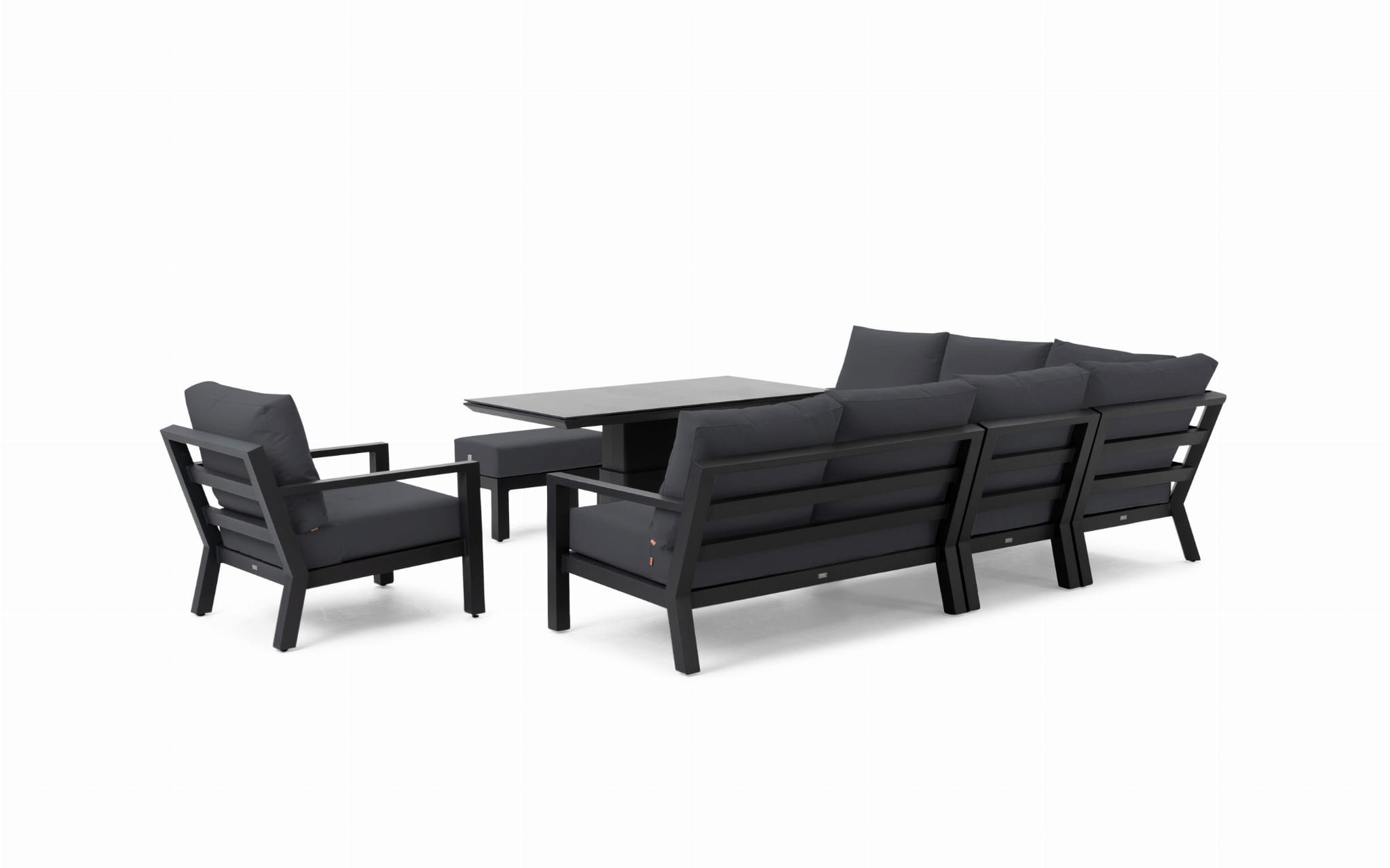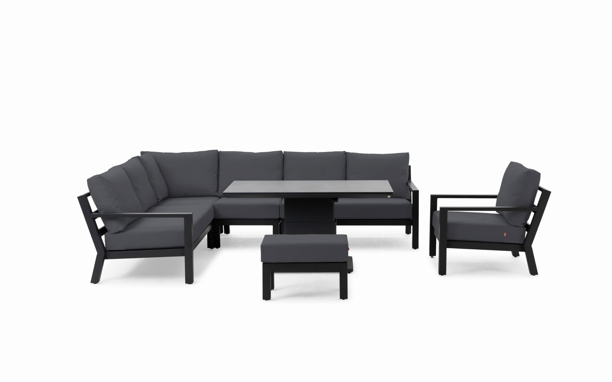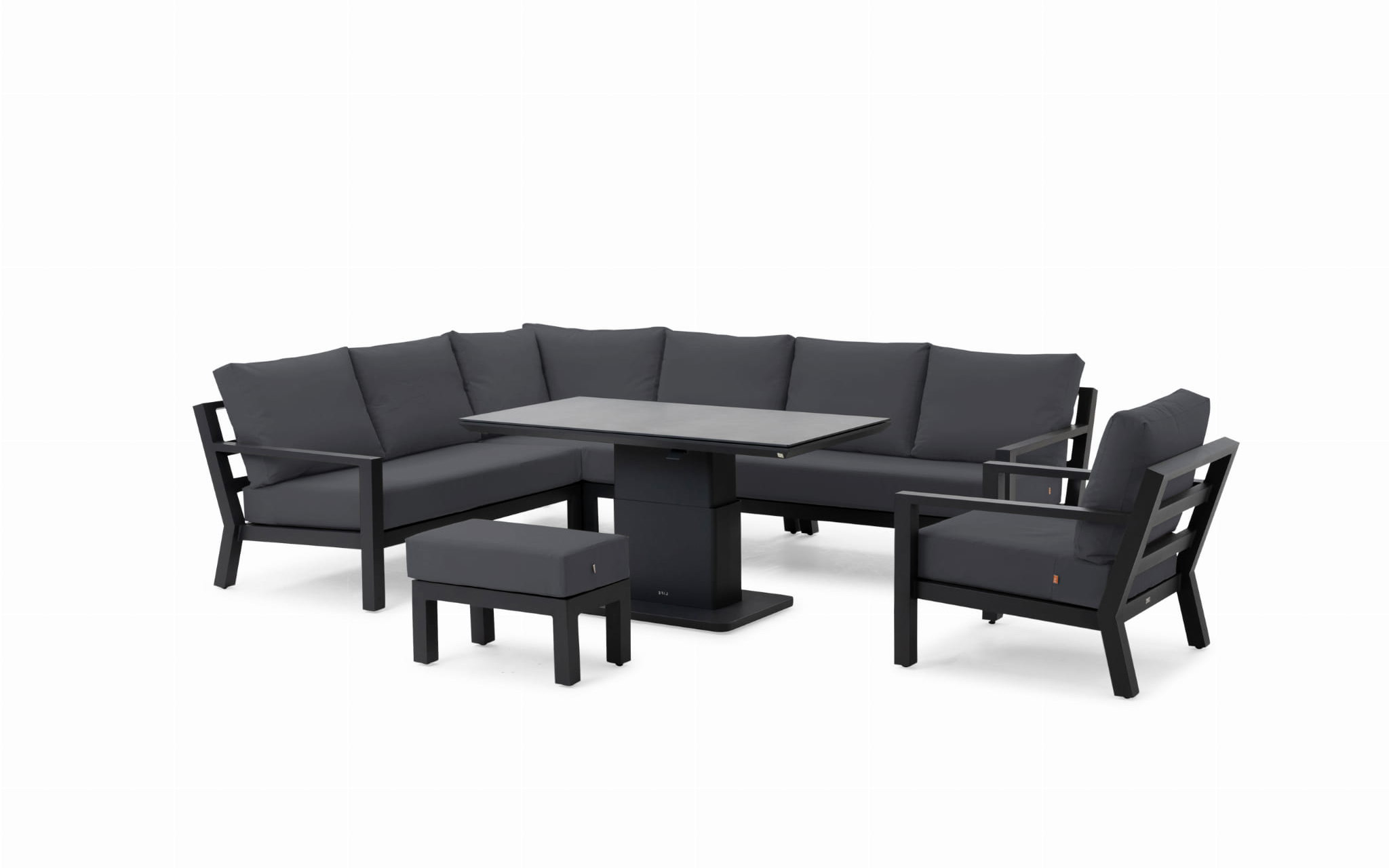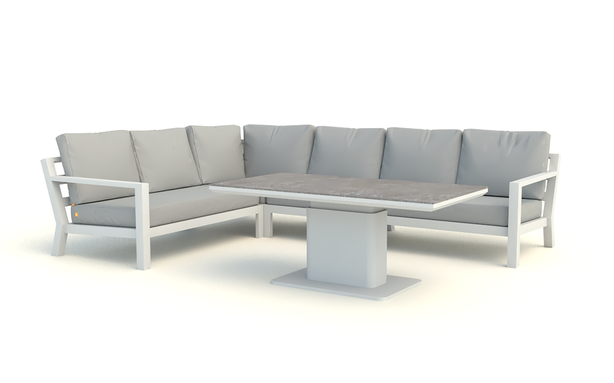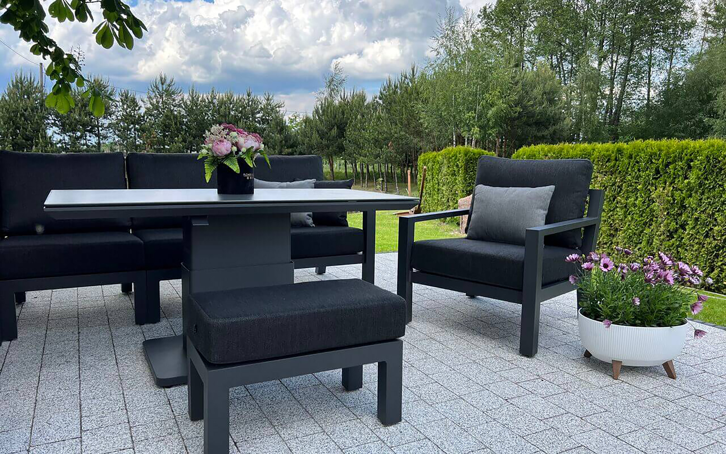 Stół podnoszony na jednej szerokiej podstawie oferuje płynną regulację od kawowej wysokości 48 cm do "obiadowej" 74 cm. Regulacja odbywa się za pomocą siłowników gazowych i dĹşwigni pod krawędzią stołu. Po naciśnięciu dĹşwigni stolik sam się podnosi. Aby obniżyć należy wywrzeć nacisk na blat. Blat stołu wykonany z płyty ceramicznej o wykończeniu beton look. Taki blat jest trwały (ceramika) i niewrażliwy na warunki atmosferyczne.