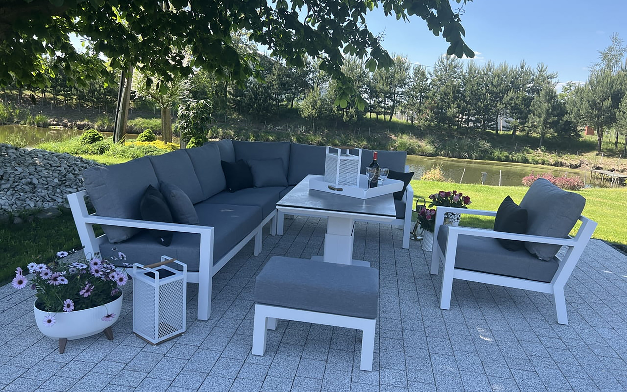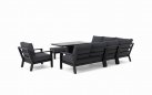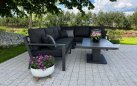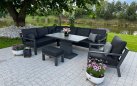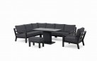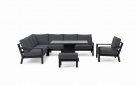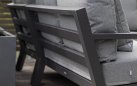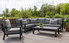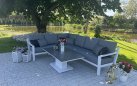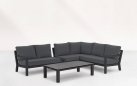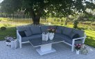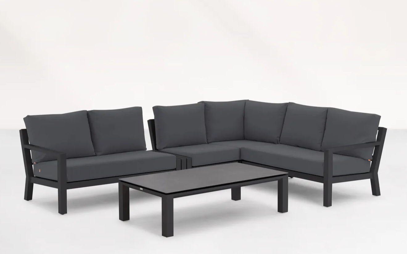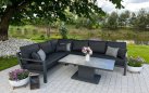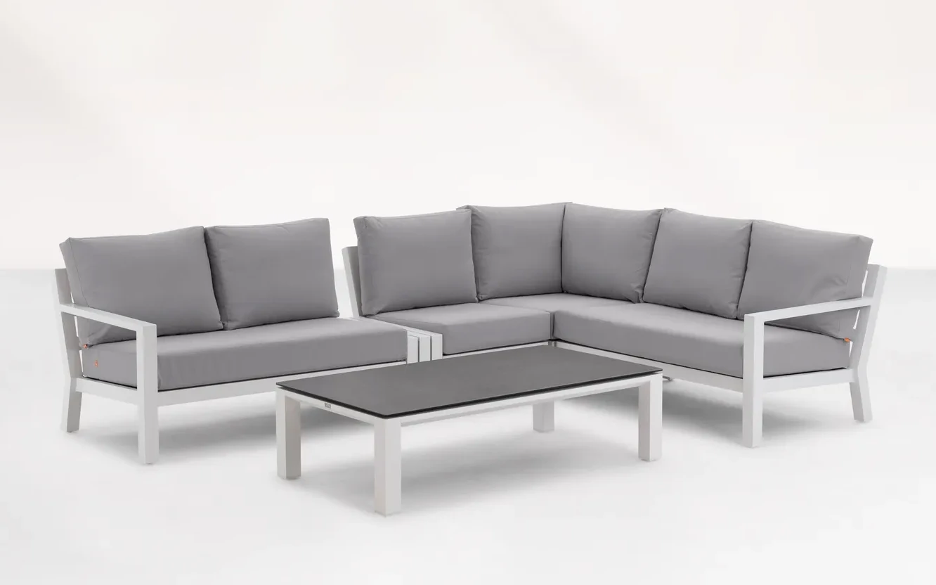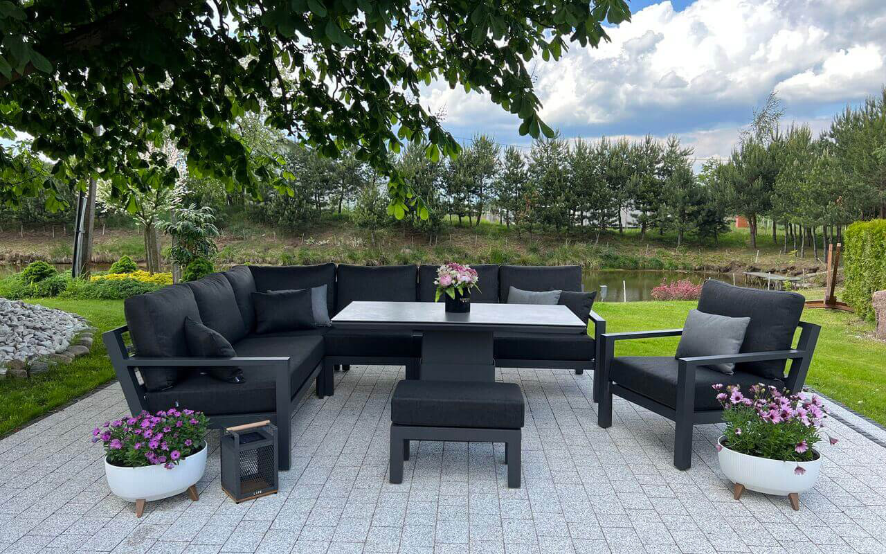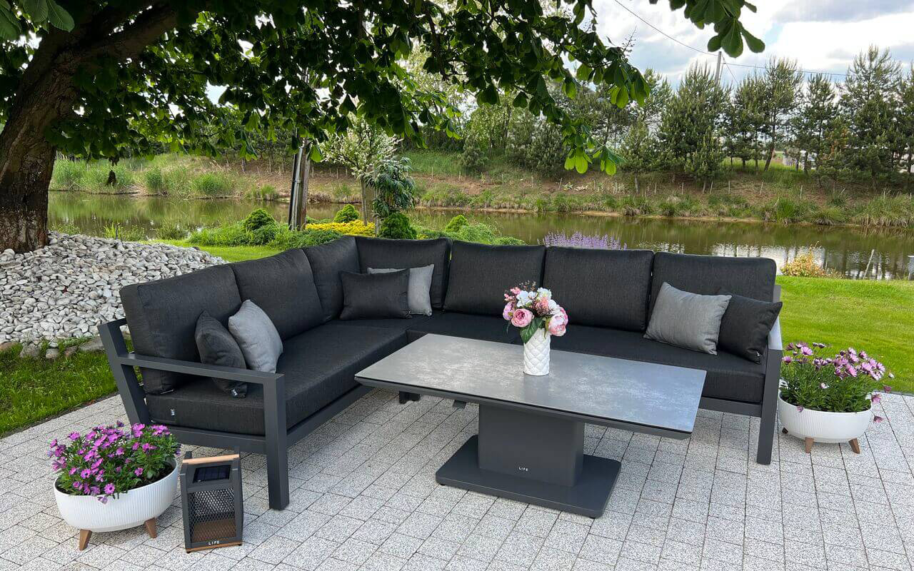 Zestaw wypoczynkowy narożny Timber to propozycja trwałych, nowoczesnych i wygodnych mebli ogrodowych of firmy LIFE. Konstrukcja wykonana jest z grubych profili aluminiowych spawana z wykończonymi starannie miejscami łączeń. Całość pokryta jest proszkowo matowym lakierem łatwym w utrzymaniu w czystości. Elementy mebli można łatwo połączyć zawartymi w komplecie łącznikami. Siedziska pod poduszkami pokryte gęstą tekstyliną.