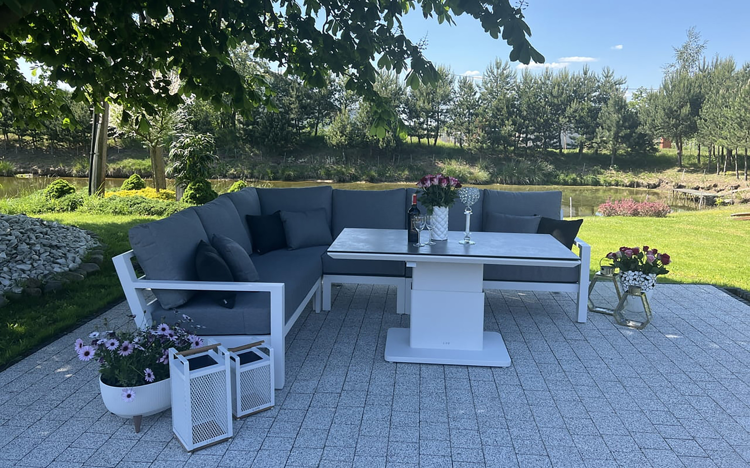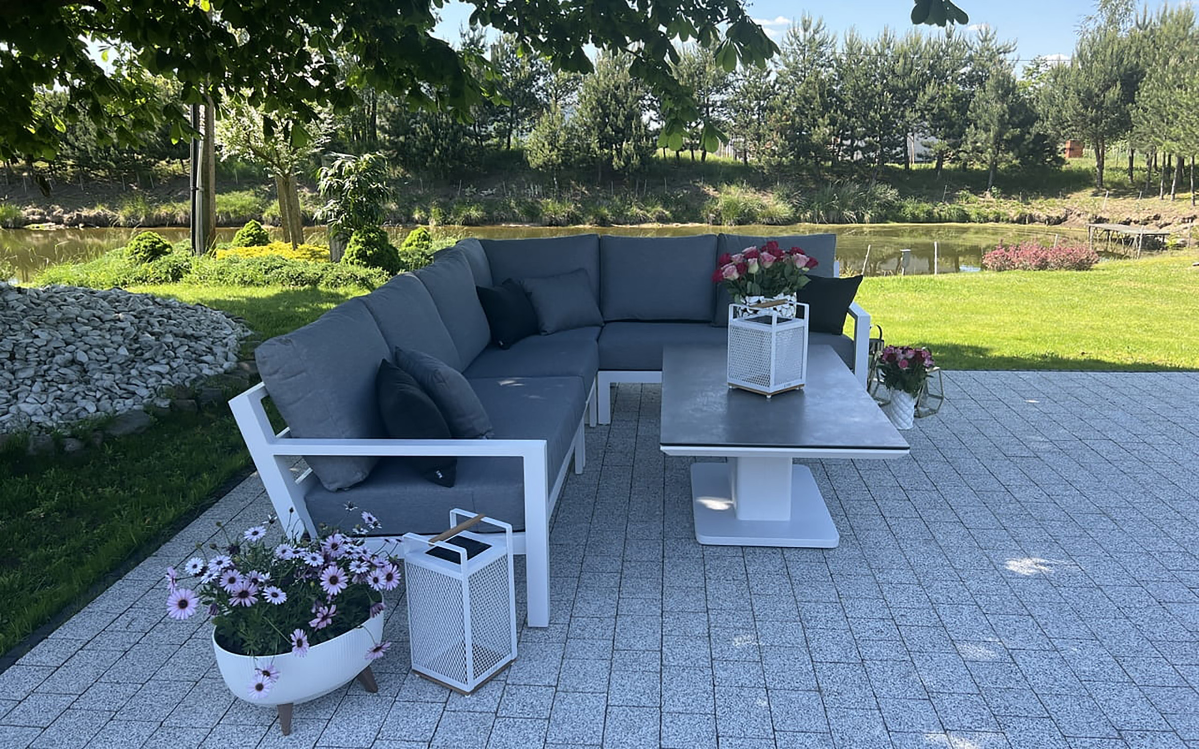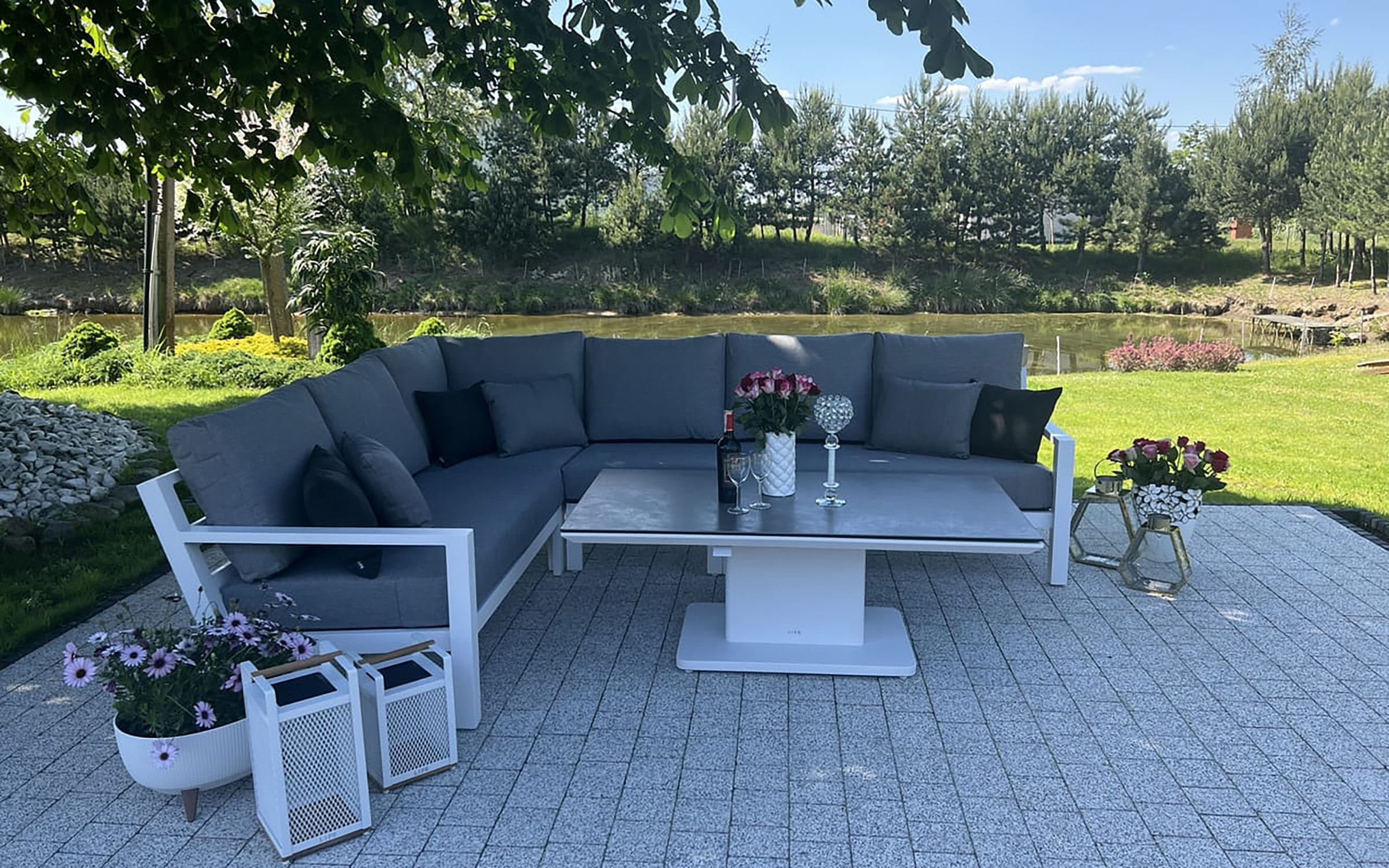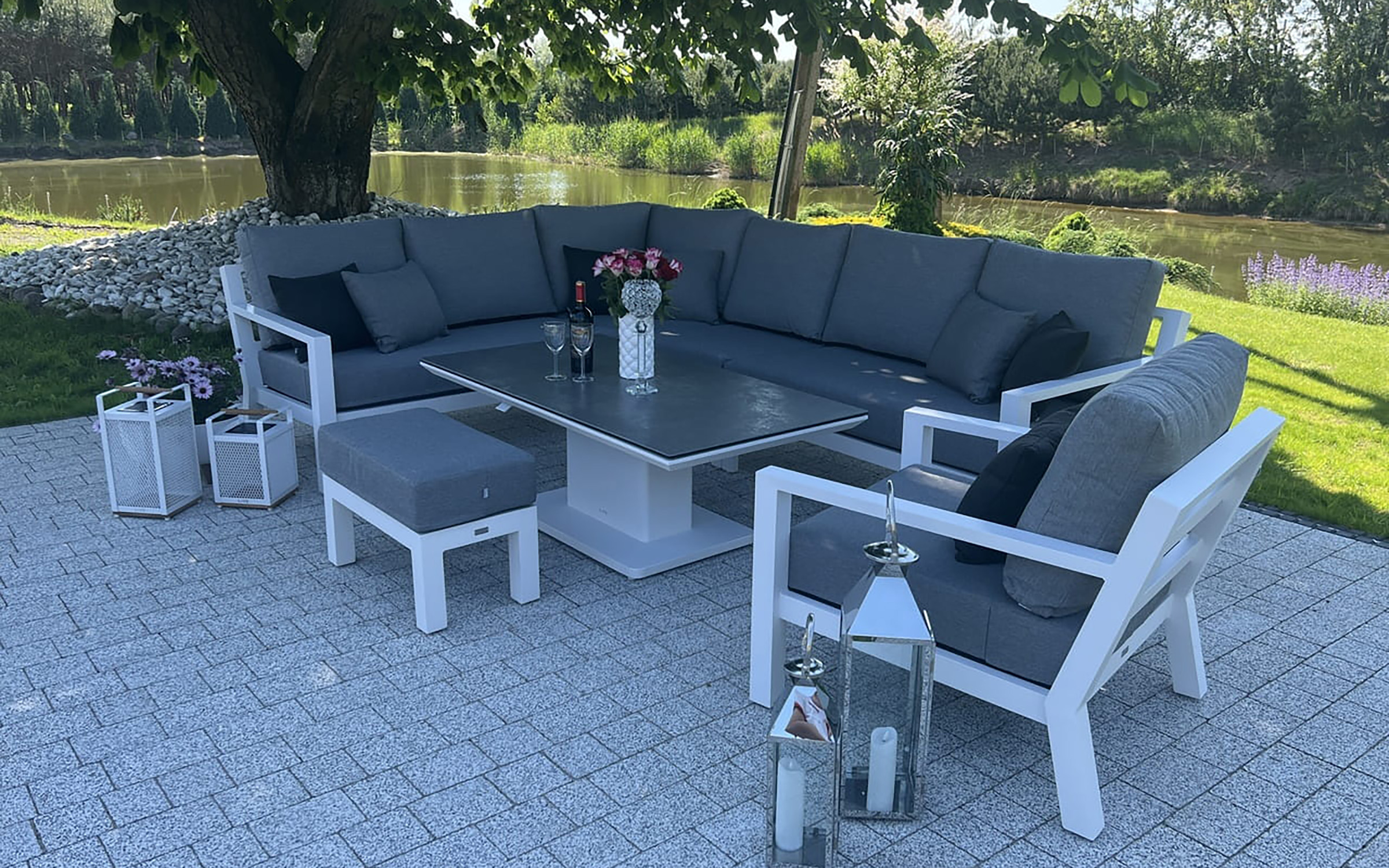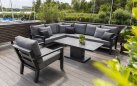Zestaw wypoczynkowy narożny Timber to propozycja trwałych, nowoczesnych i wygodnych mebli ogrodowych of firmy LIFE. Konstrukcja wykonana jest z grubych profili aluminiowych spawana z wykończonymi starannie miejscami łączeń. Całość pokryta jest proszkowo matowym lakierem łatwym w utrzymaniu w czystości. Elementy mebli można łatwo połączyć zawartymi w komplecie łącznikami. Siedziska pod poduszkami pokryte gęstą tekstyliną.