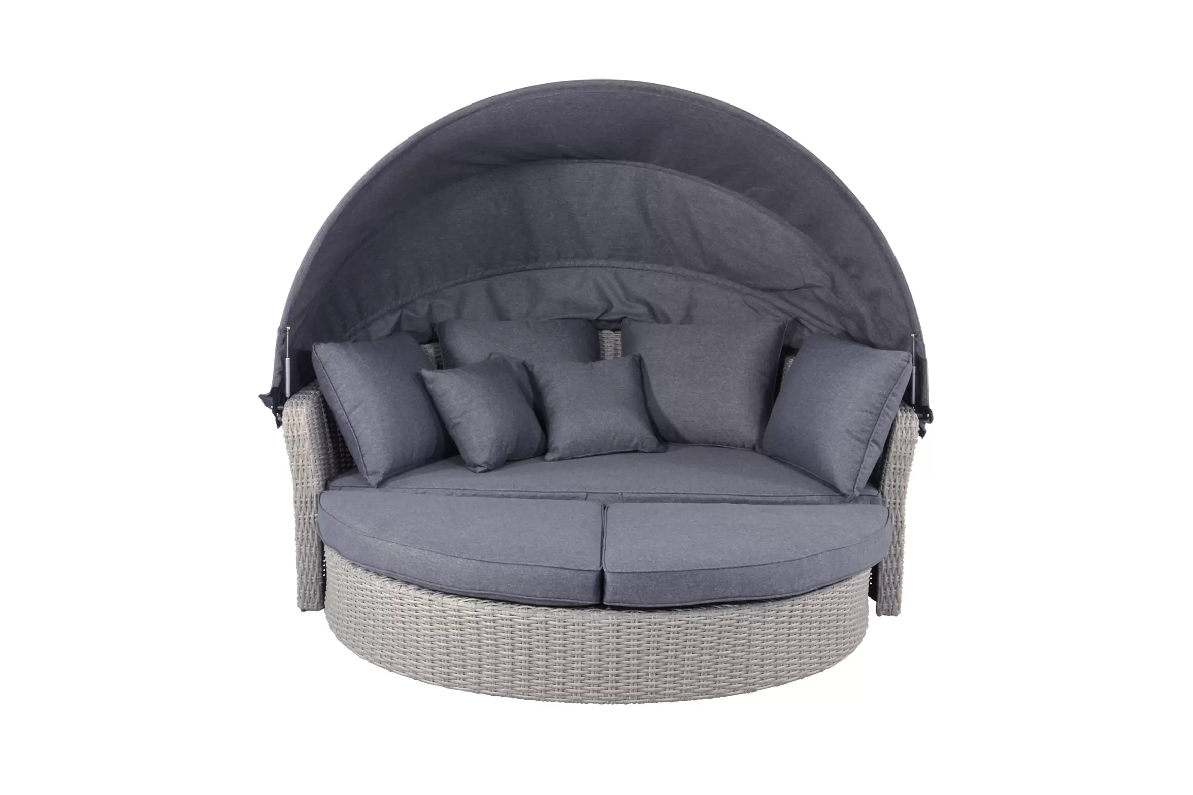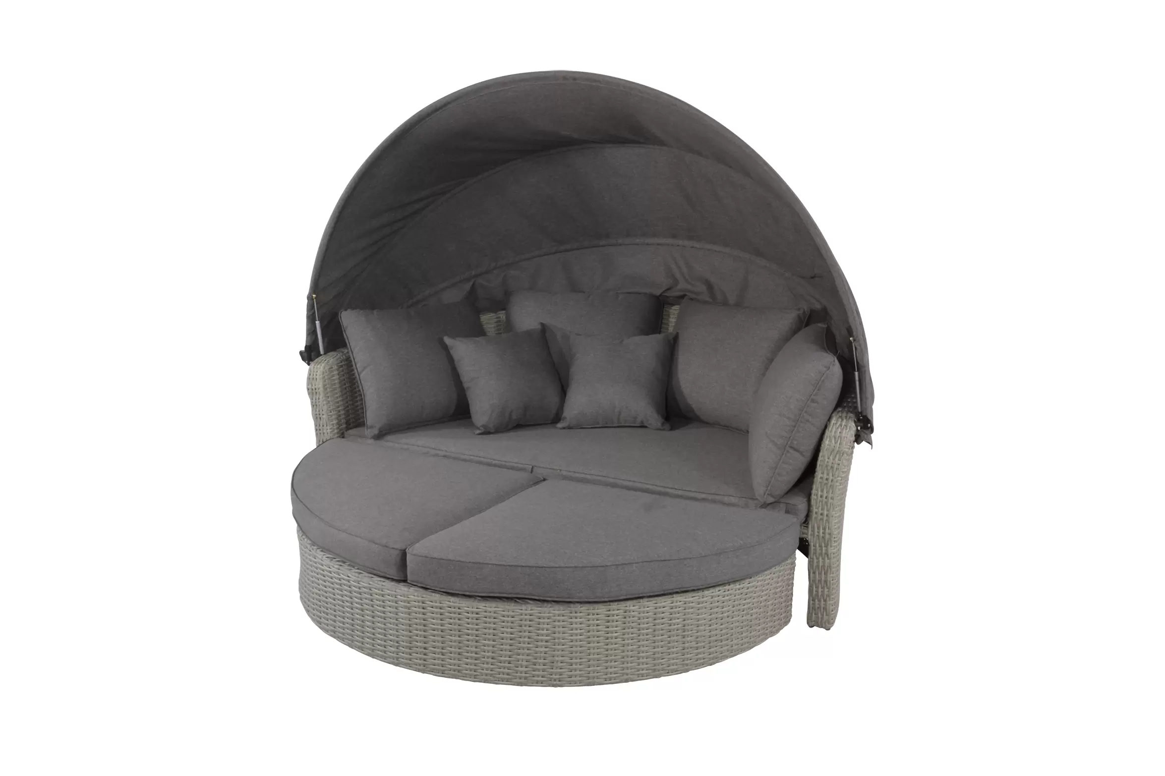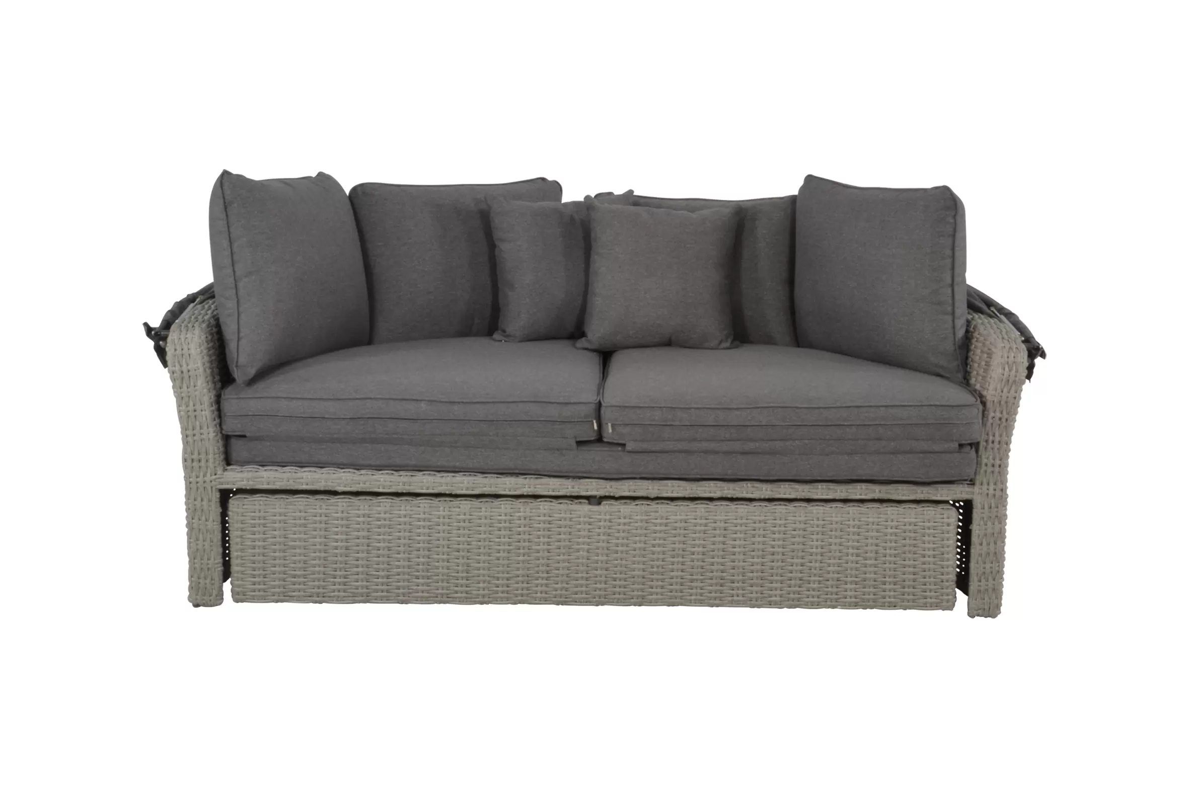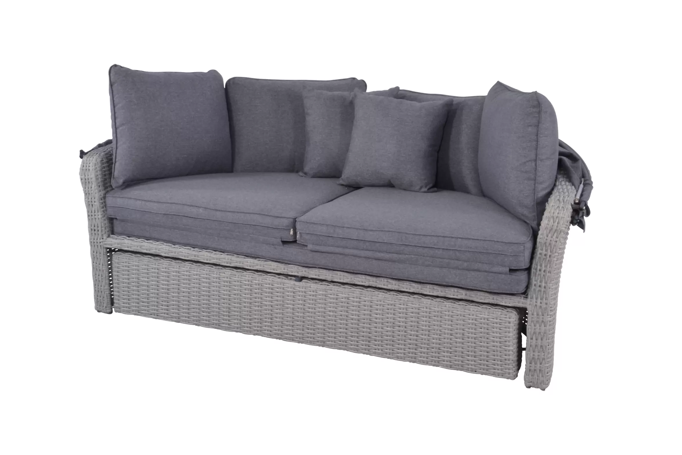 Łóżko ogrodowe Lesli Living z technorattanu – szaro-kremowe, z hokerem i poduszkami