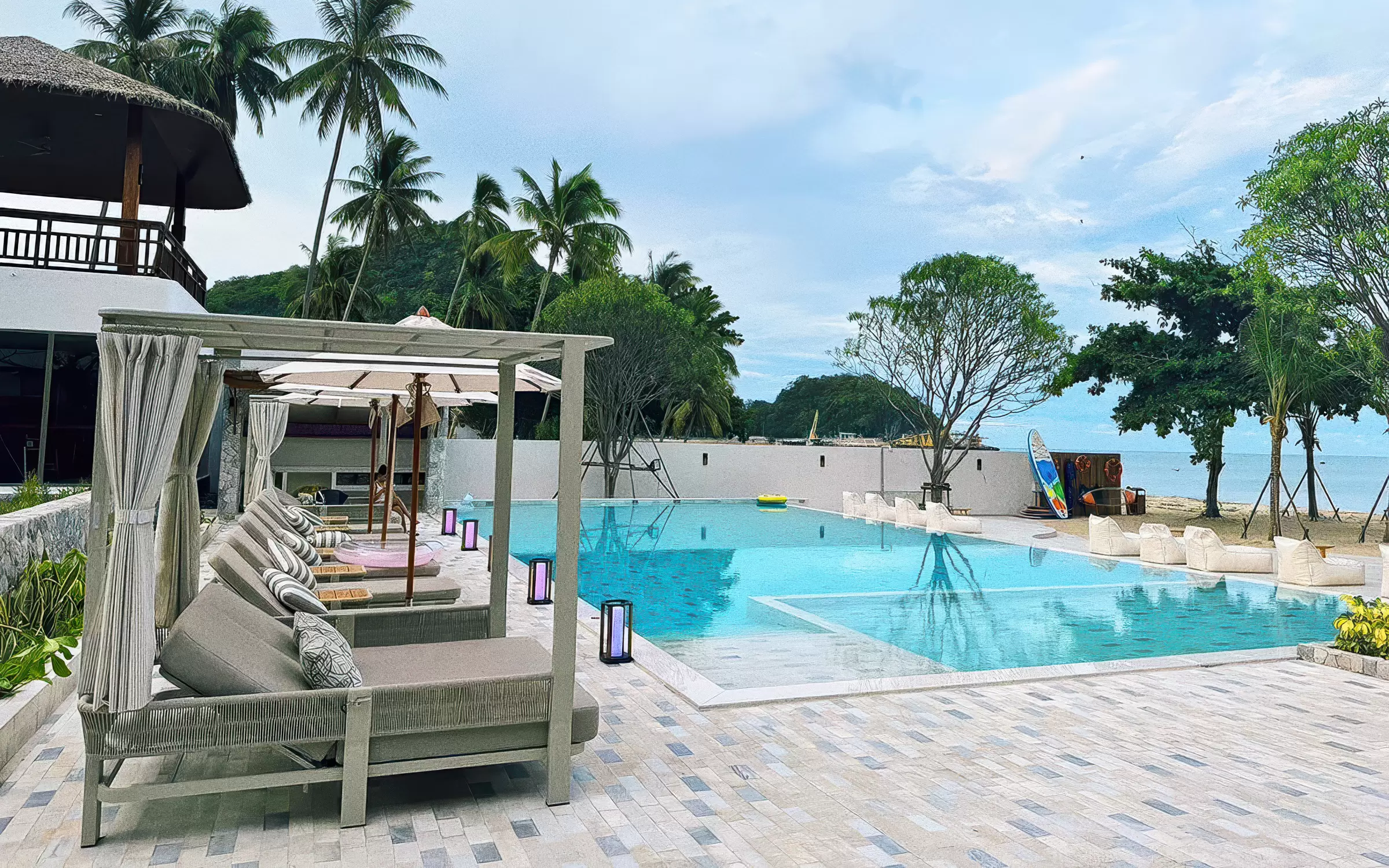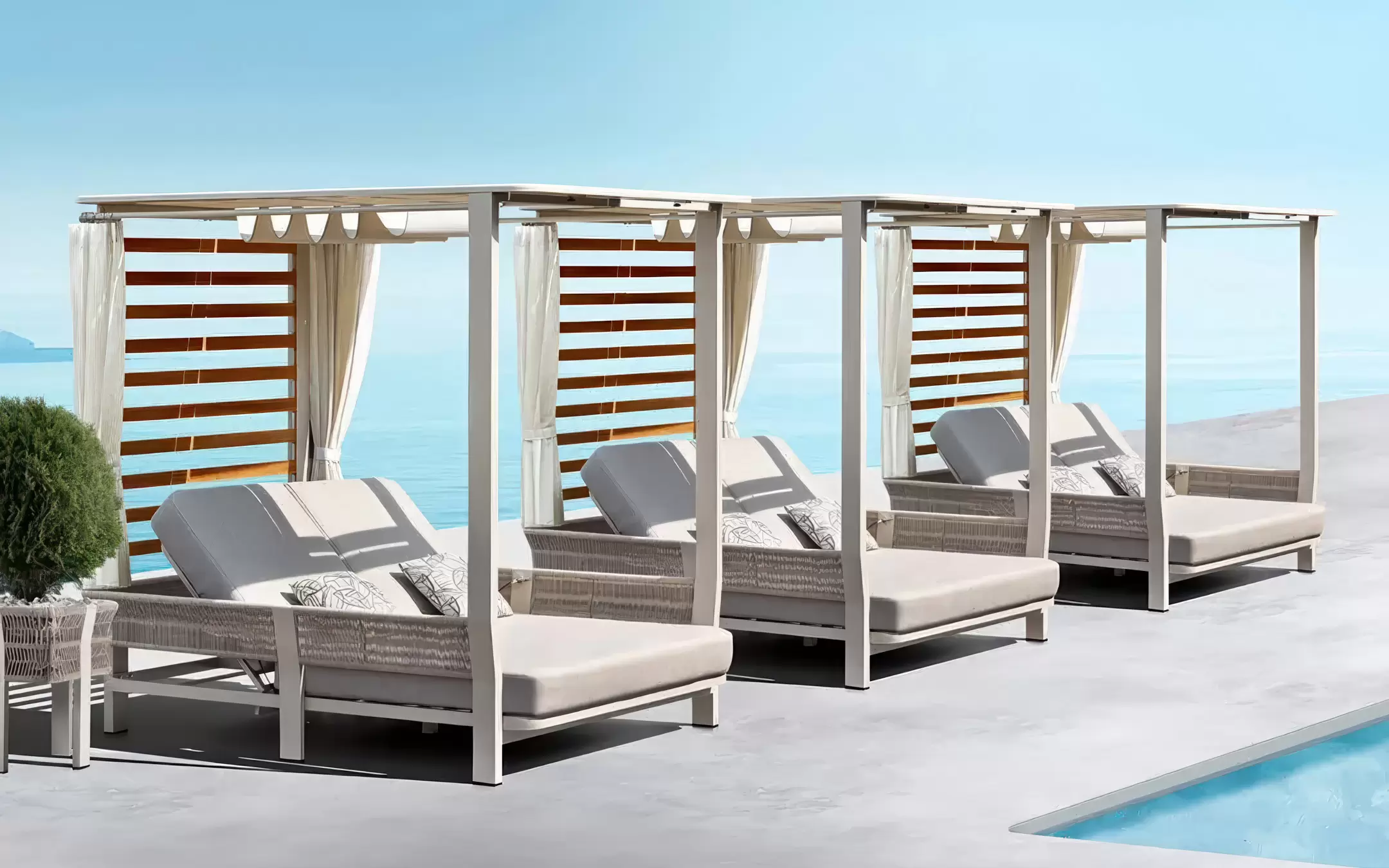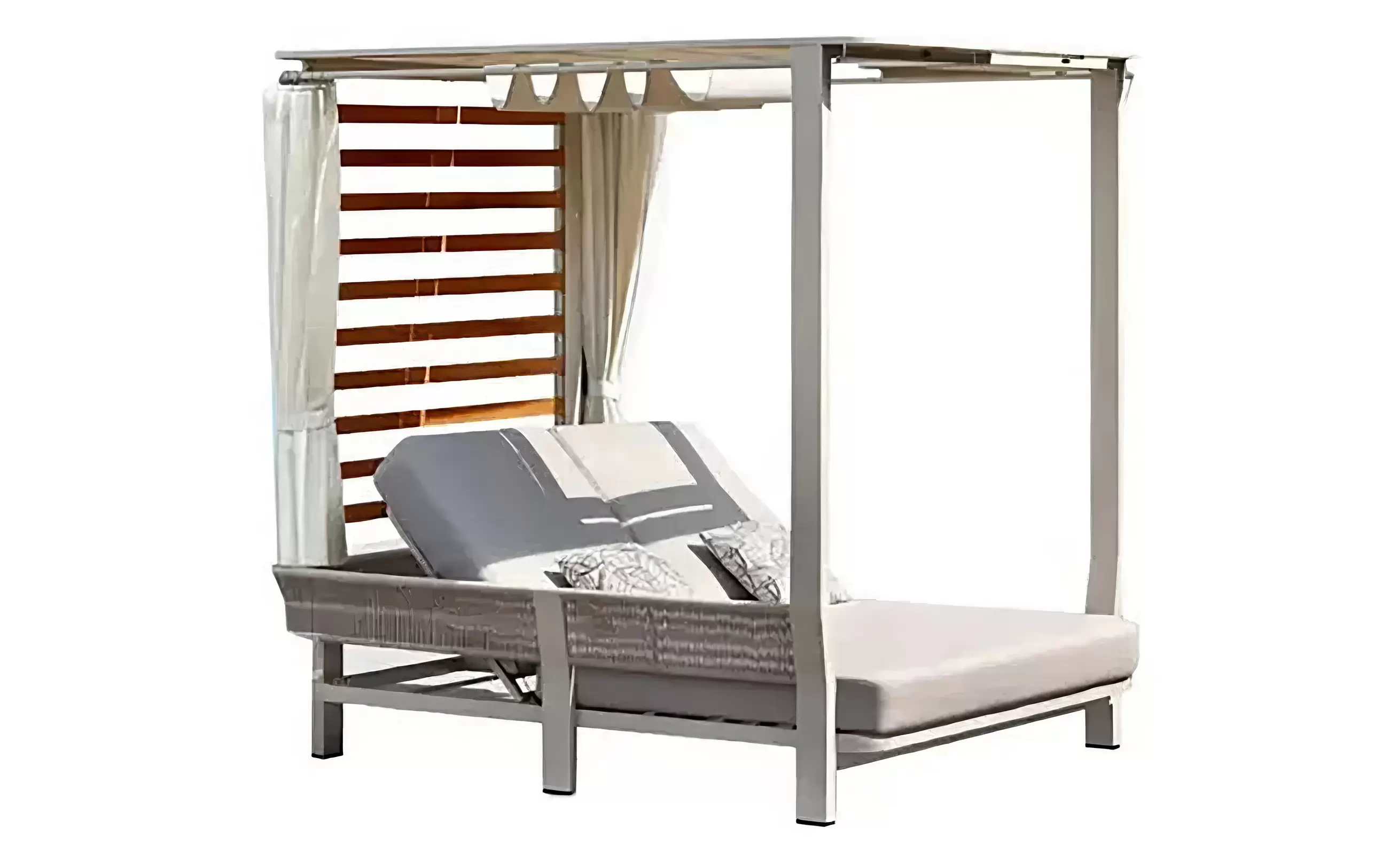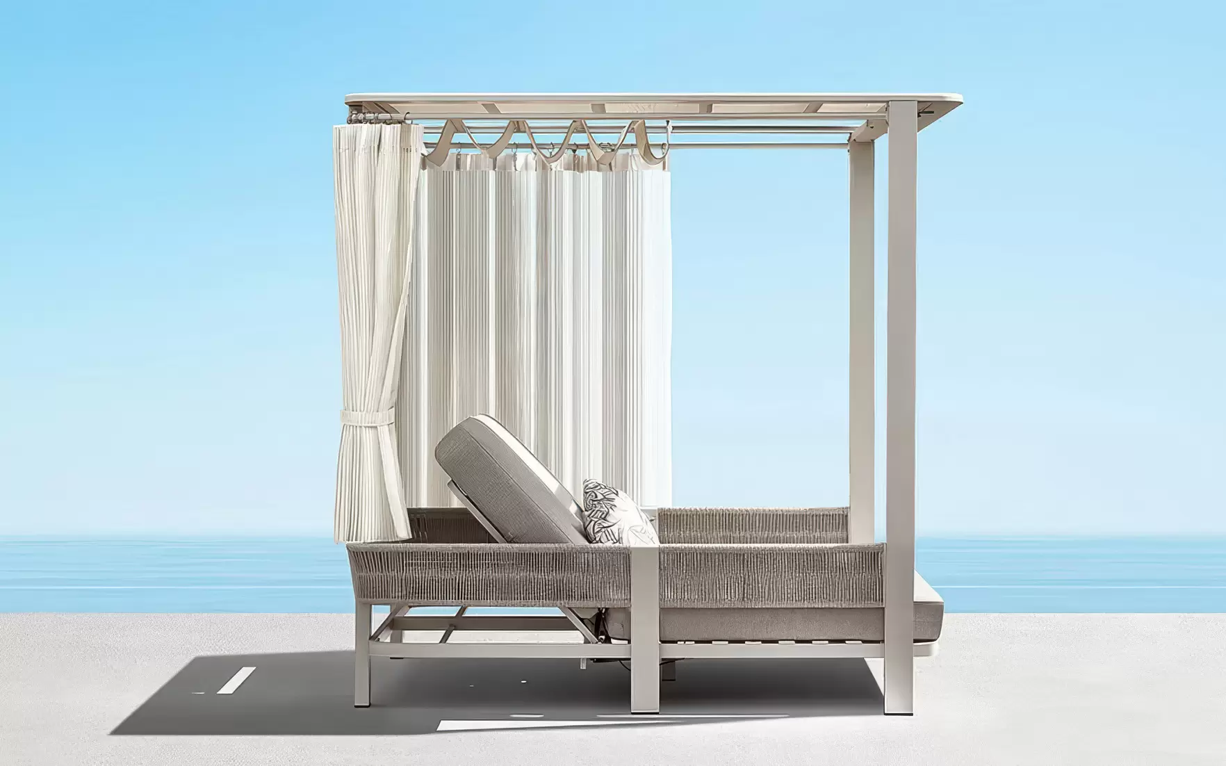 Całość uzupełniają zasłony boczne, które zapewniają prywatność i ochronę przed słońcem, tworząc atmosferę luksusowego resortu. To mebel, który pełni funkcję zarówno wypoczynkową, jak i dekoracyjną — prawdziwa architektura ogrodowa.