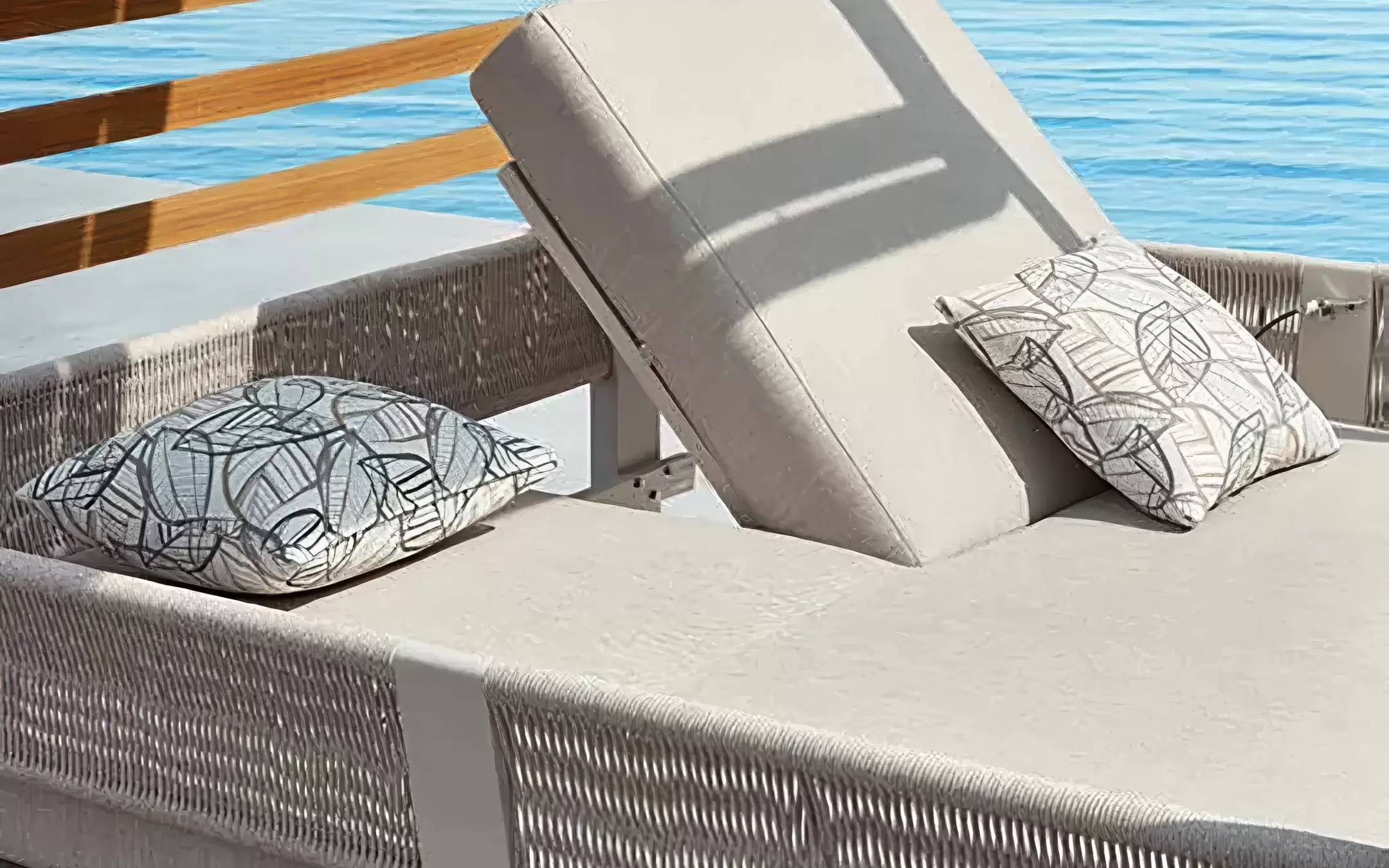 Solidna rama z aluminium zapewnia stabilność i odporność na warunki atmosferyczne, a drewniany panel tylny dodaje naturalnego charakteru. Dwa niezależnie regulowane oparcia umożliwiają dopasowanie pozycji do wypoczynku, a grube poduszki gwarantują wysoki komfort.