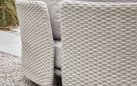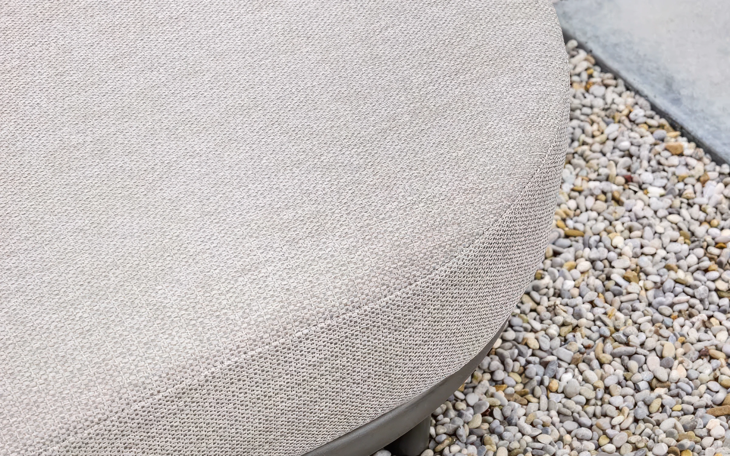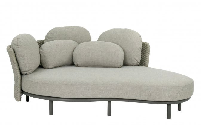 Konstrukcja leżanki wykonana jest z lekkiego aluminium malowanego proszkowo w kolorze taupe, co zapewnia trwałość i odporność na warunki atmosferyczne. Oparcia wykończono dekoracyjnym splotem z polipropylenowej liny rope, która jest wytrzymała i przewiewna. Poduszki w kolorze Smoked Grey wykonano z tkaniny Olefin w technologii BEE WETT®, co gwarantuje szybkie schnięcie, odporność na wilgoć i promieniowanie UV. Poszewki są zdejmowalne i łatwe w pielęgnacji. Całość tworzy elegancką, organiczną formę idealną do wypoczynku na świeżym powietrzu.