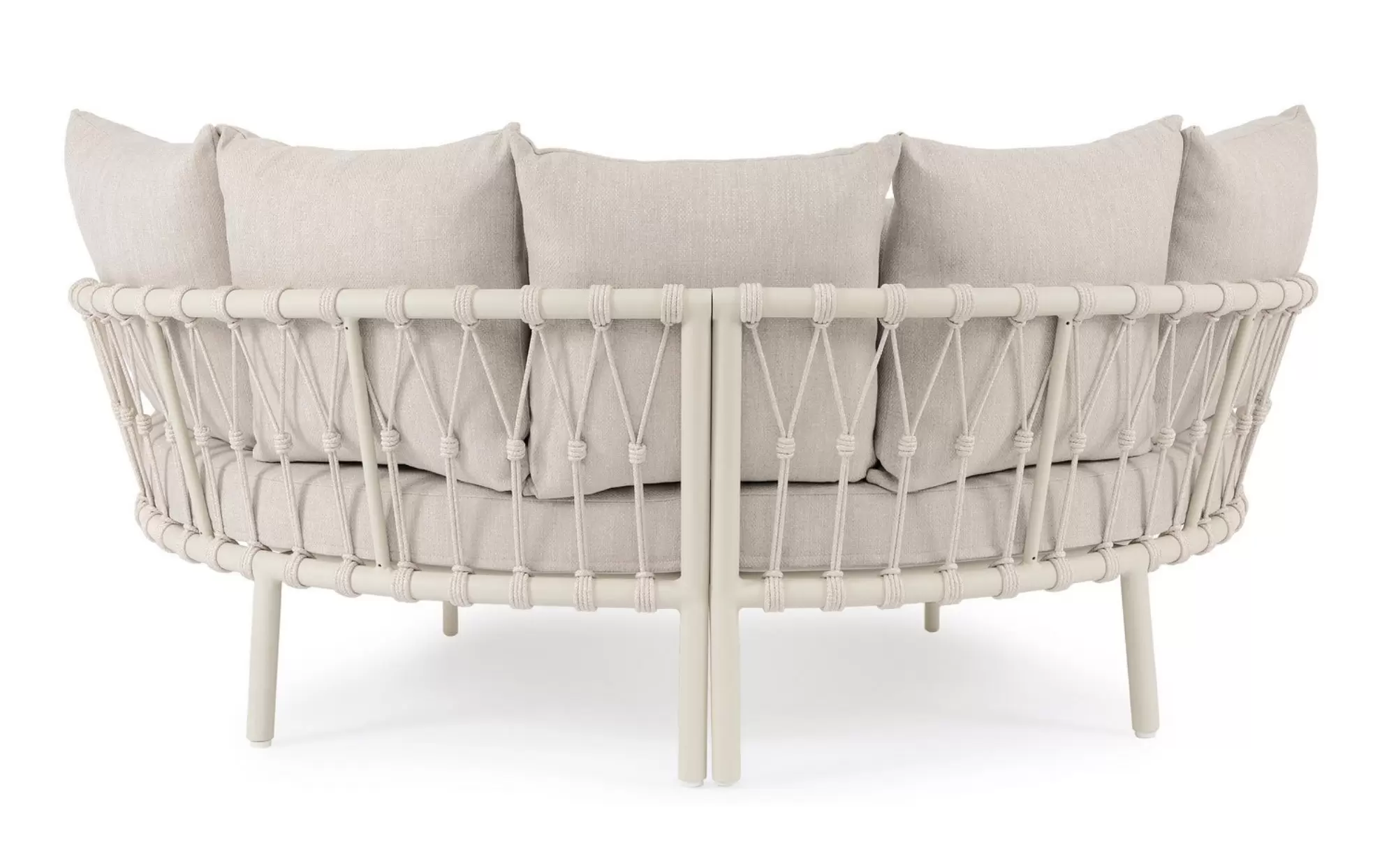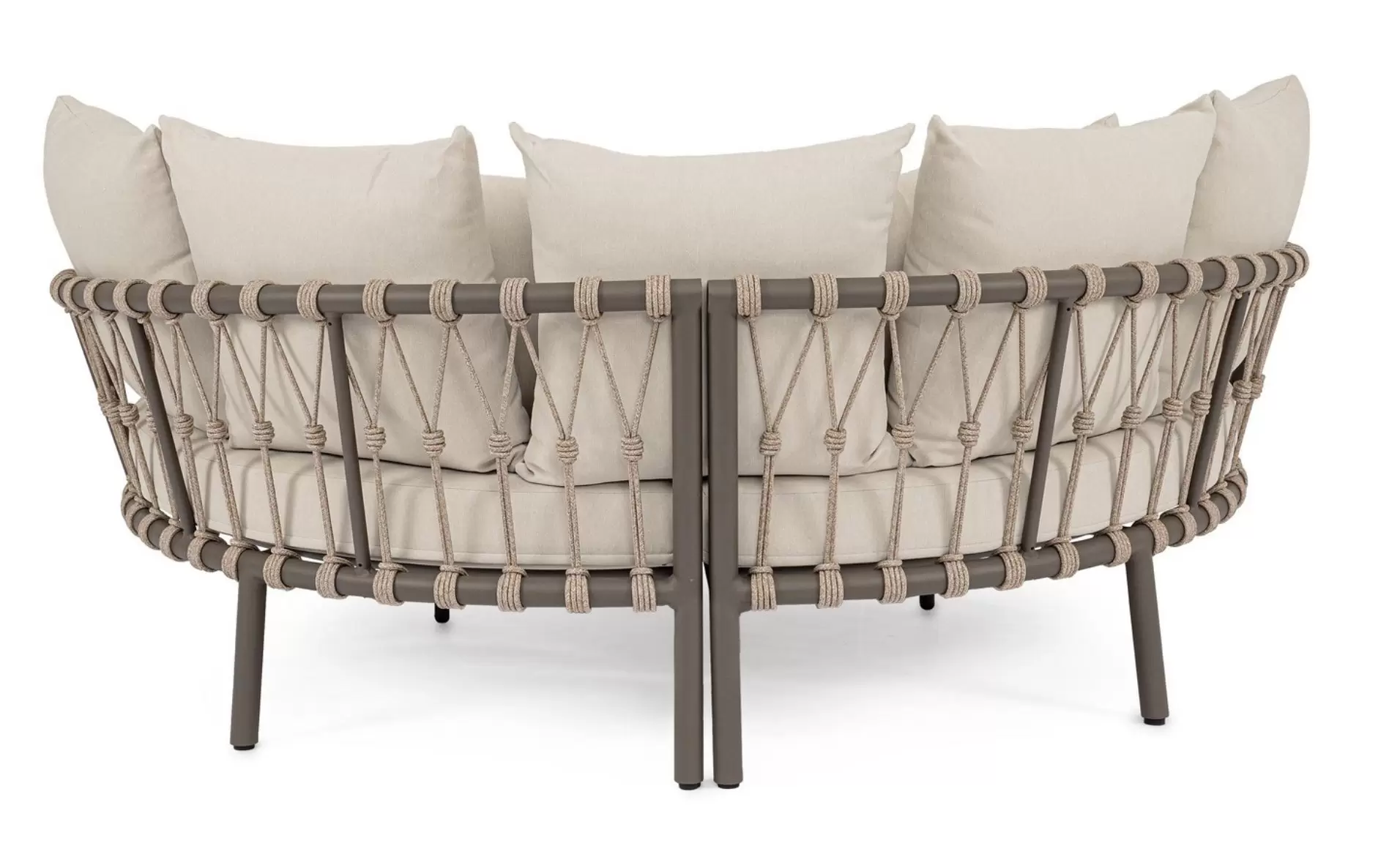 Charakterystycznym akcentem tego modelu są zaokrąglone oparcia wykończone dekoracyjną plecionką z lin. Ten rzemieślniczy detal nadaje łóżku lekkości i nowoczesnego sznytu, sprawiając, że mebel prezentuje się niezwykle efektownie z każdej strony. O Twój komfort dbają wyjątkowo grube materace siedziskowe oraz bogaty zestaw miękkich poduszek oparciowych. Całość sprawia, że wypoczynek na świeżym powietrzu staje się tak wygodny, jak w domowej sypialni, oferując idealne warunki do popołudniowej drzemki lub relaksu z książką.