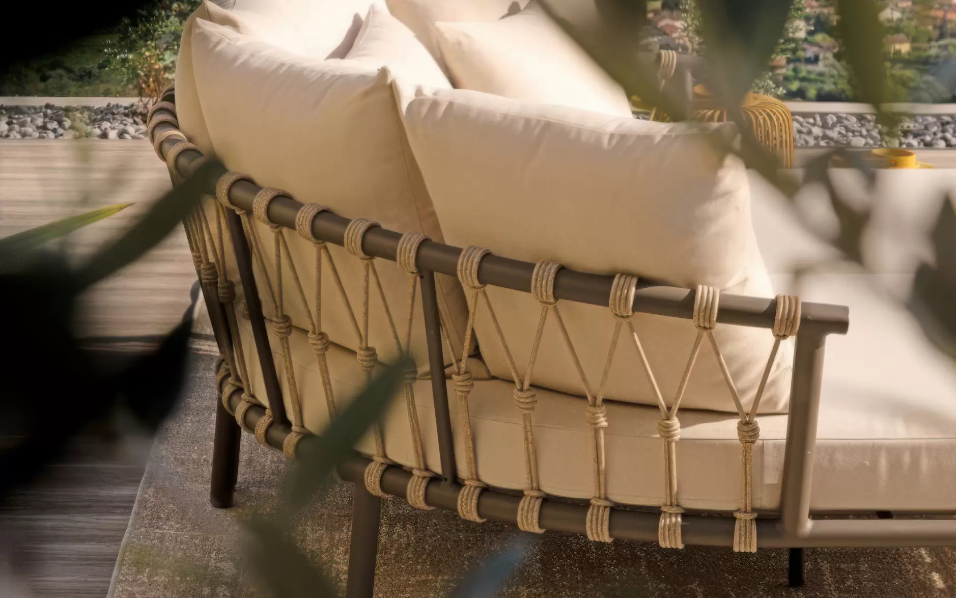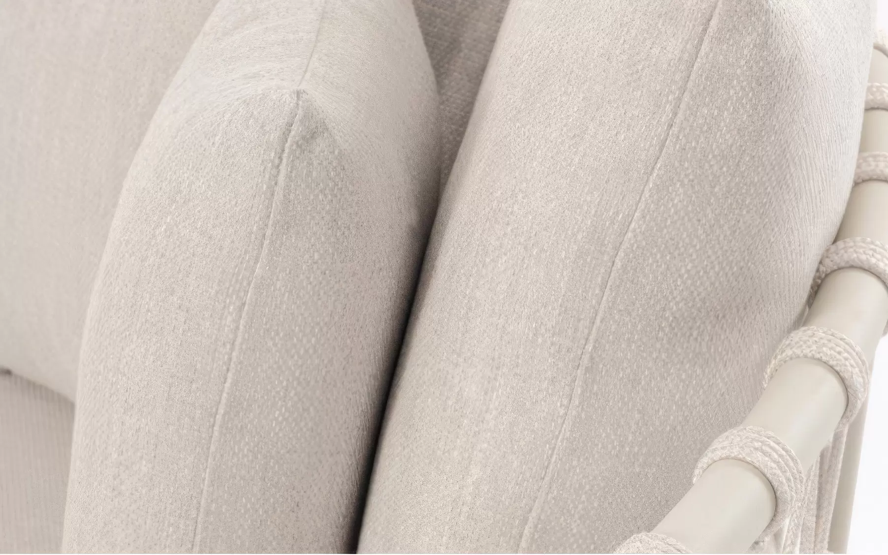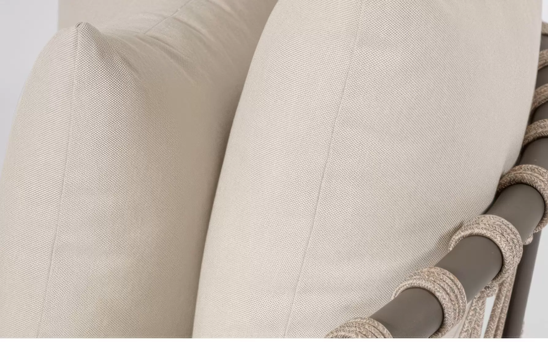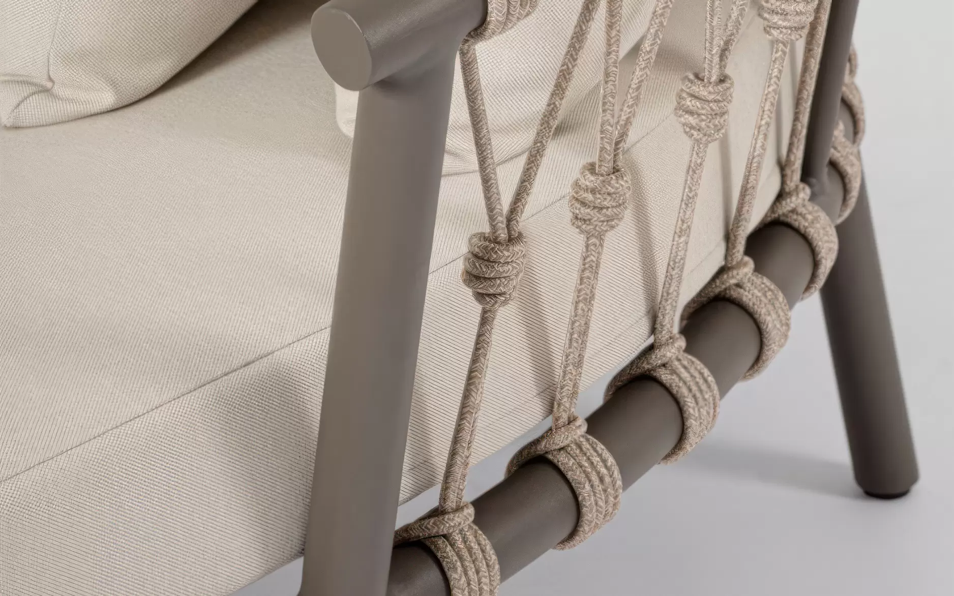 Plecionka z lin poliestrowych – tył oparć oraz podstawy stolików zdobią dekoracyjne liny poliestrowe. Materiał ten jest w pełni wodoodporny i posiada wysoką odporność na promieniowanie UV, dzięki czemu liny nie rozciągają się i zachowują swój pierwotny kolor pod wpływem słońca. To techniczne włókno nadaje meblom unikalnego charakteru, jednocześnie gwarantując ich trwałość w środowisku o zmiennej wilgotności.