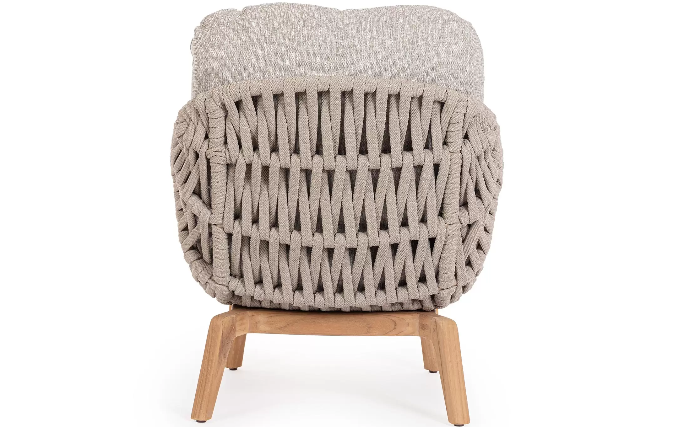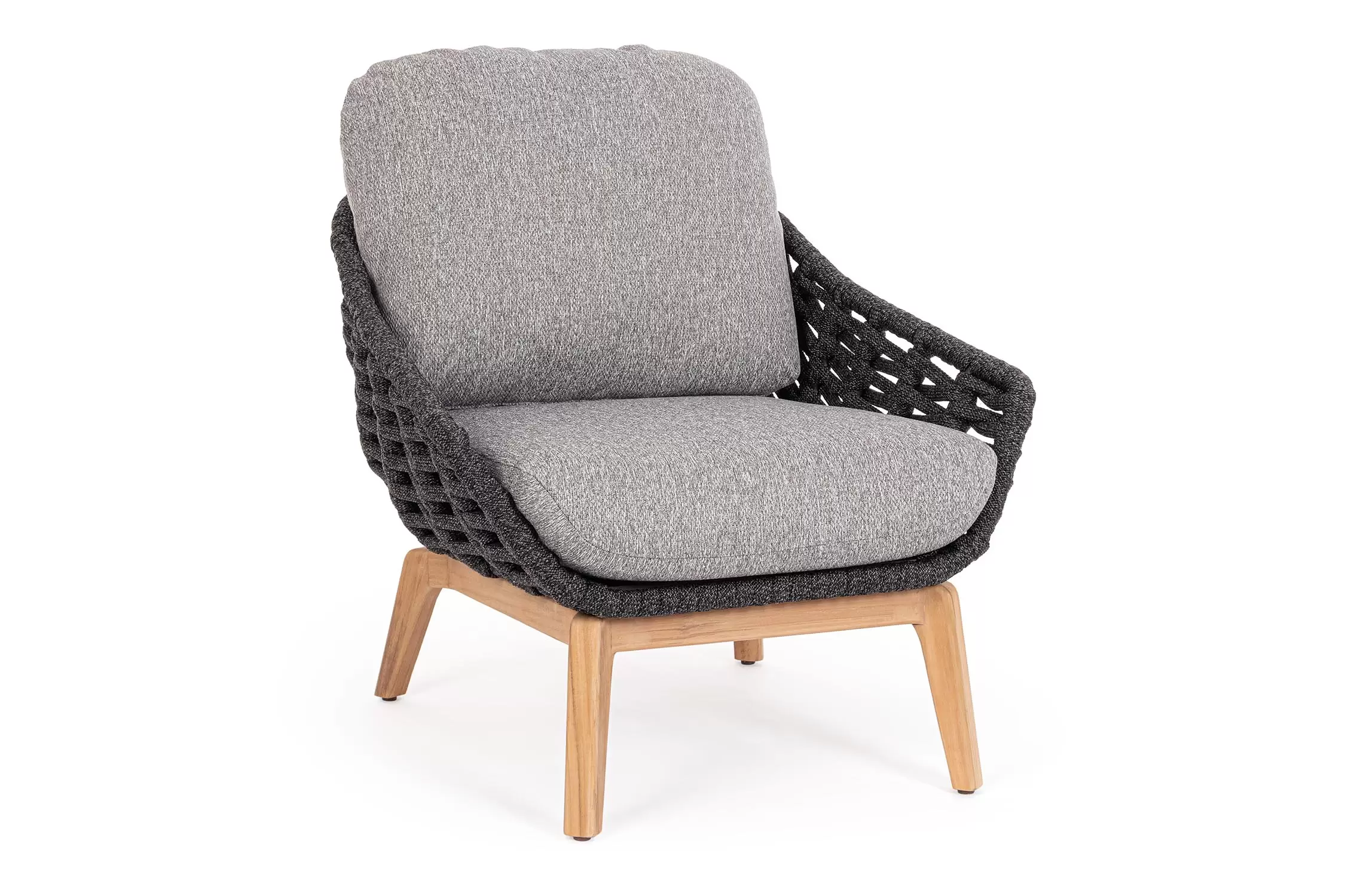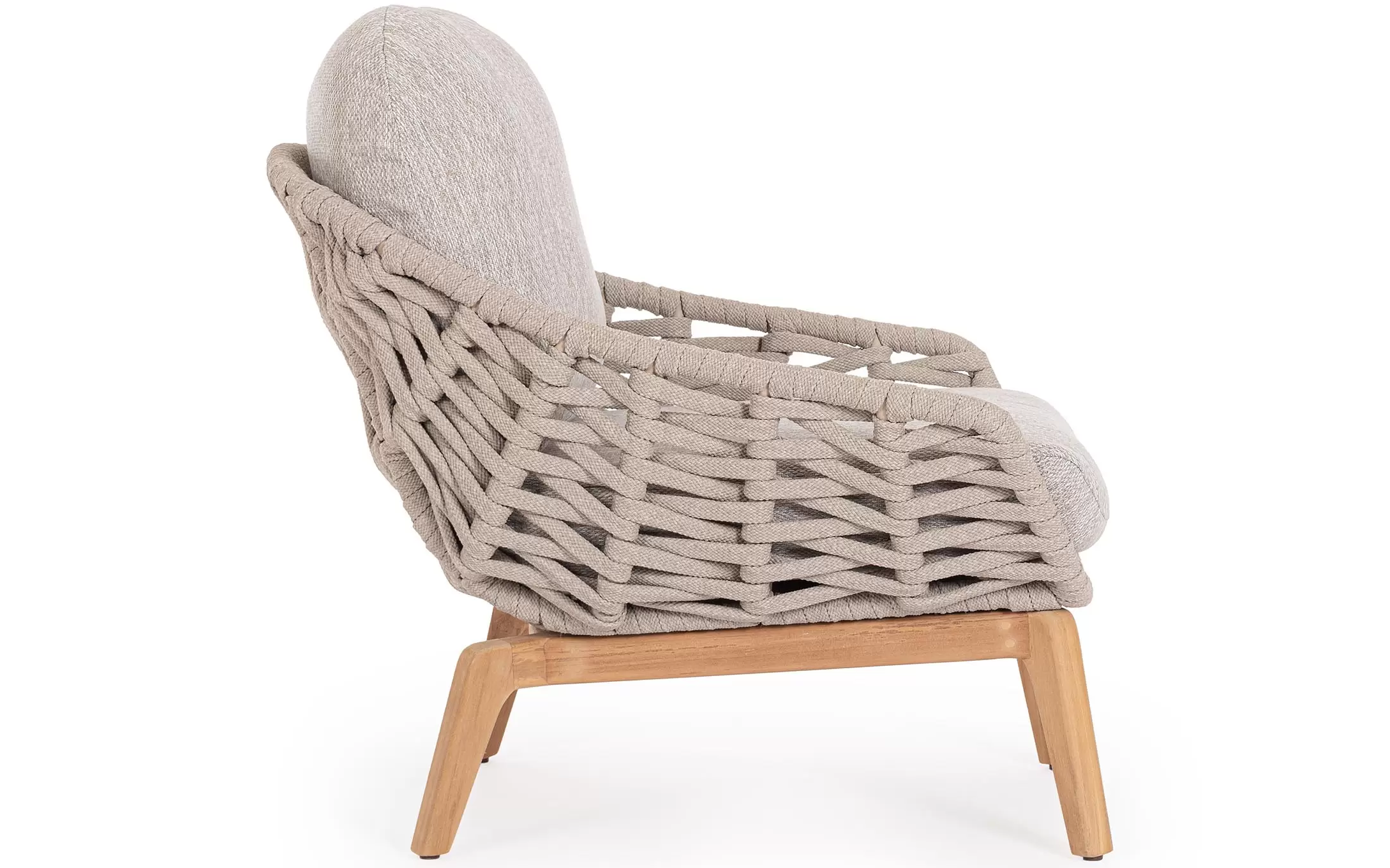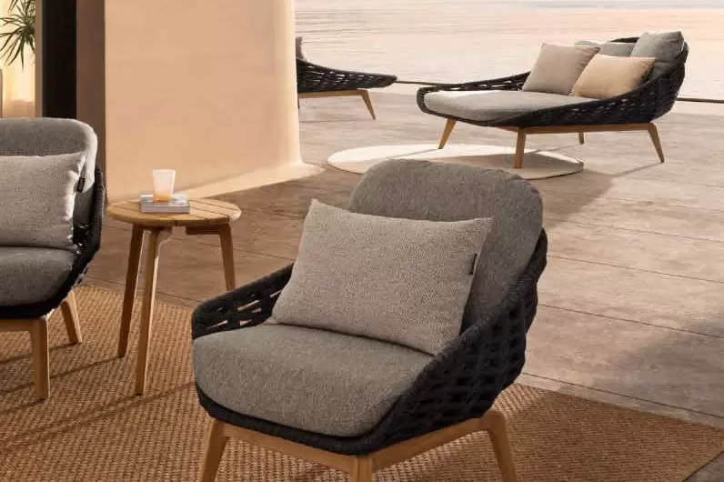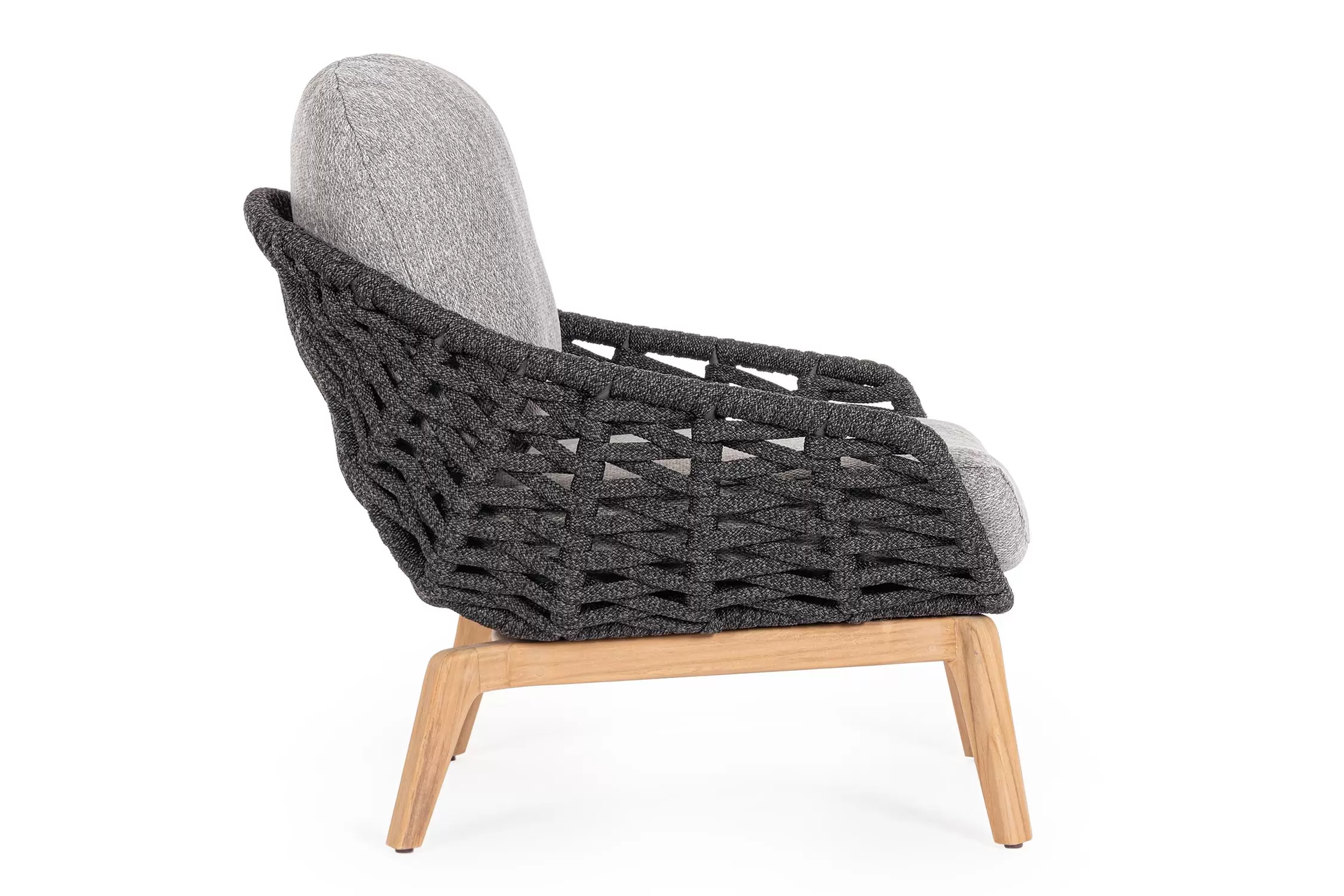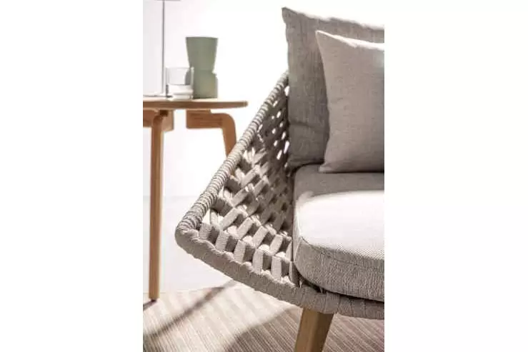 Konstrukcja fotela opiera się na lekkiej, aluminiowej ramie oraz nogach wykonanych z certyfikowanego drewna teakowego, co tworzy harmonijną kompozycję nowoczesności z naturalnym ciepłem. Nowoczesny charakter mebla podkreśla ażurowe oparcie wykonane z gęstego splotu liny polipropylenowej, która nie tylko wygląda stylowo, ale zapewnia również doskonałą wentylację i sprężyste wsparcie dla pleców. To mebel, który przyciąga wzrok swoją organiczną formą i obiecuje najwyższy standard wypoczynku na świeżym powietrzu.