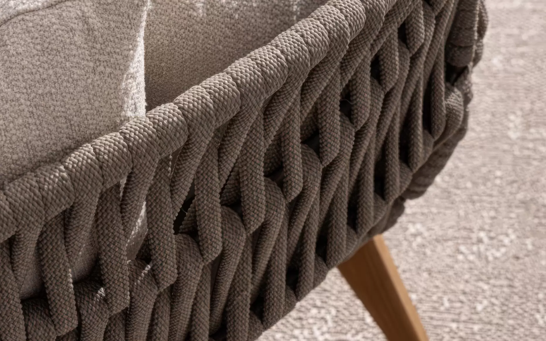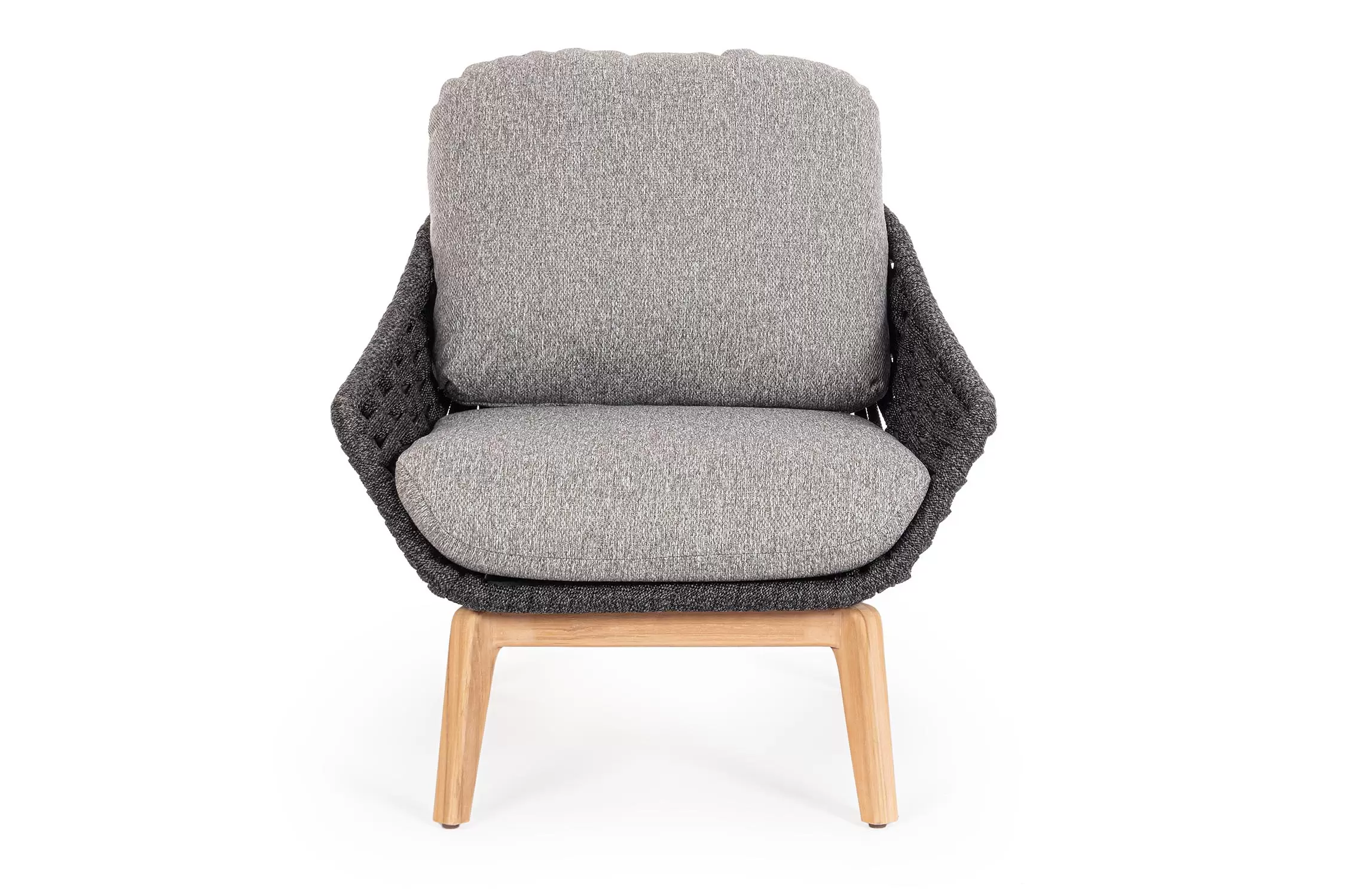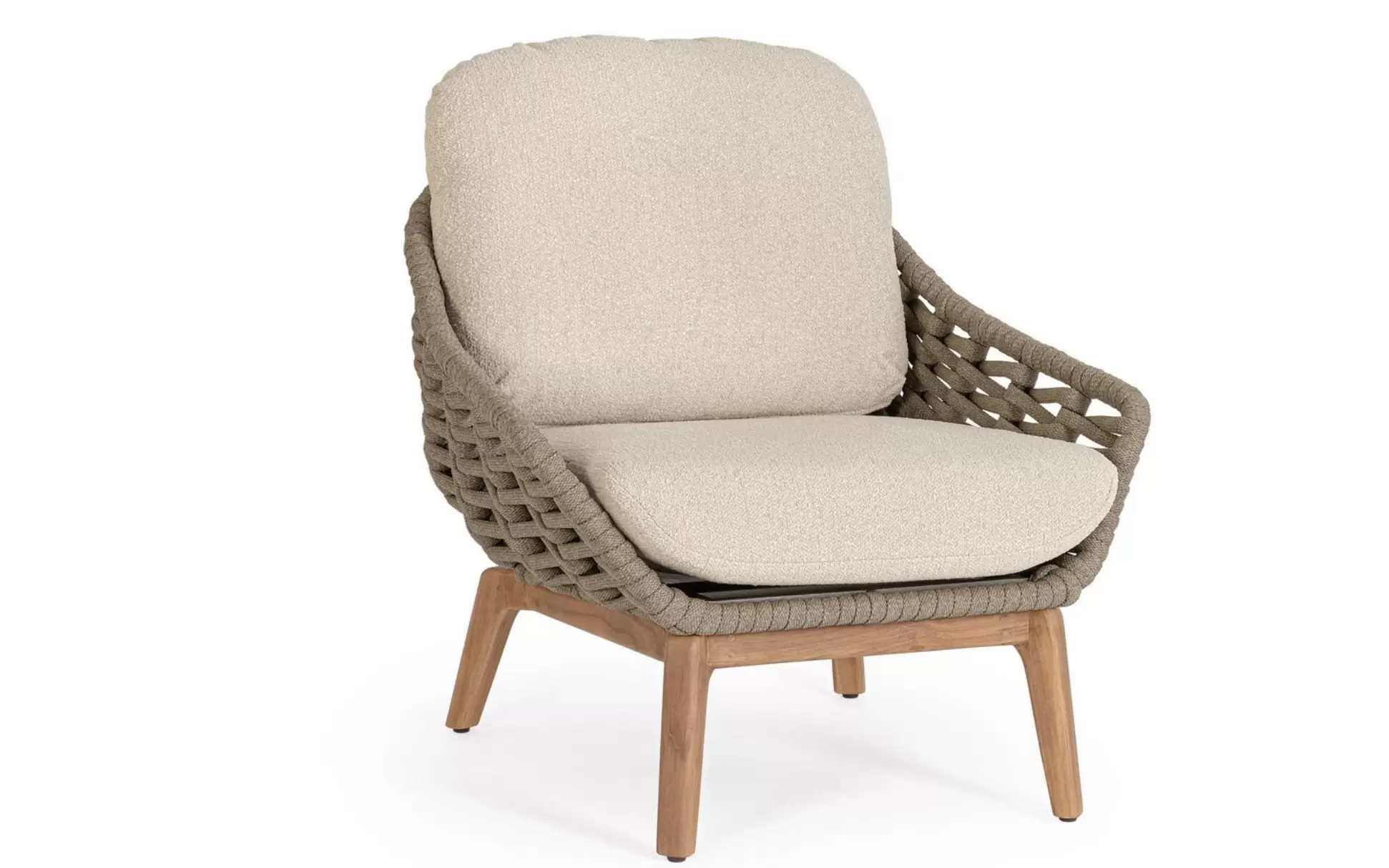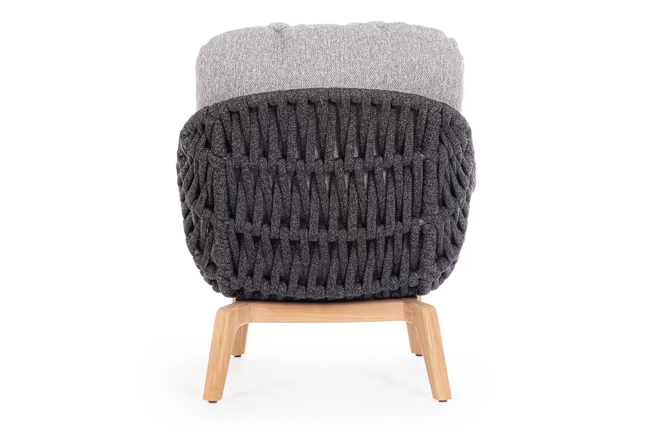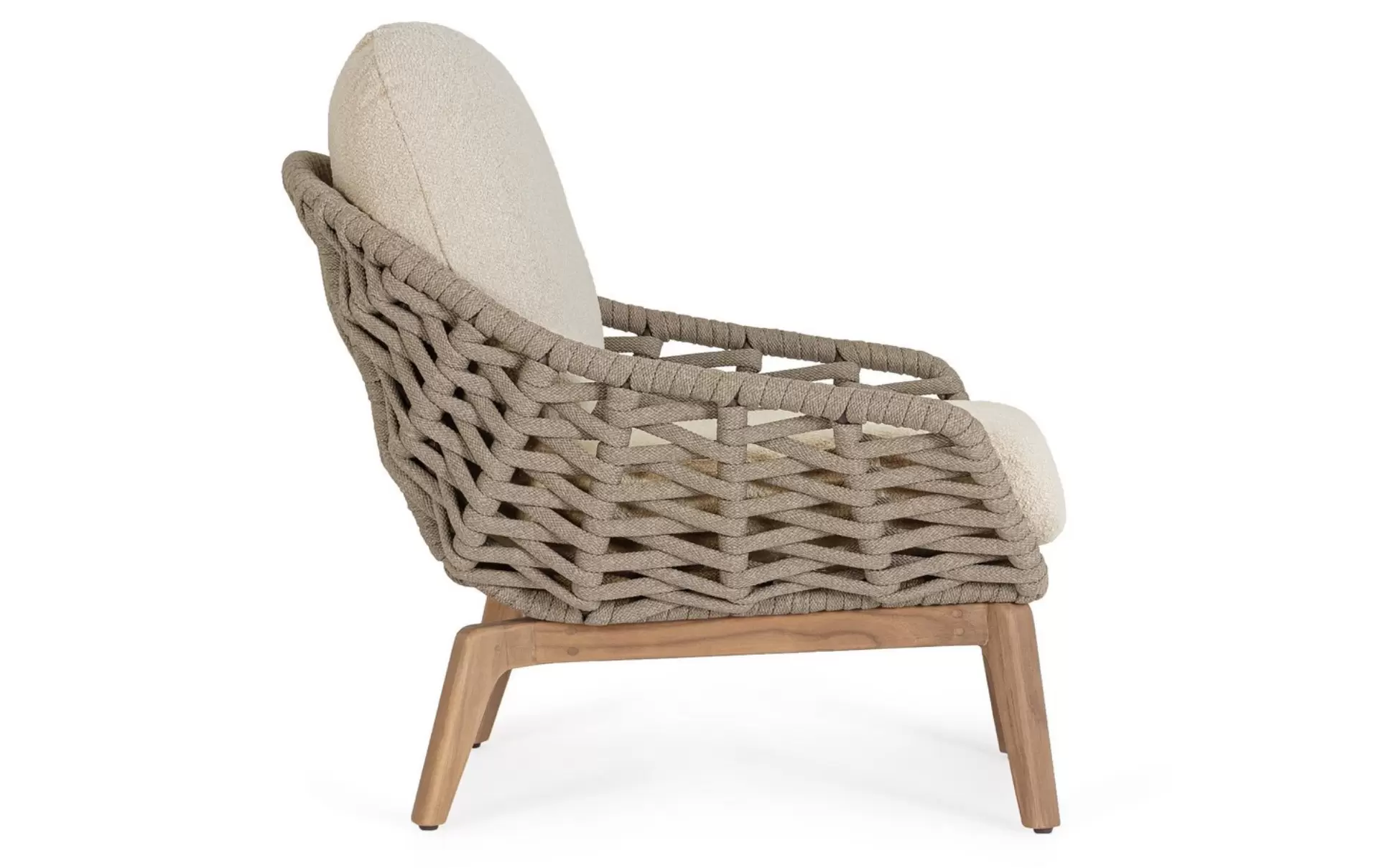 Konstrukcja fotela opiera się na lekkiej, aluminiowej ramie oraz nogach wykonanych z certyfikowanego drewna teakowego, co tworzy harmonijną kompozycję nowoczesności z naturalnym ciepłem. Nowoczesny charakter mebla podkreśla ażurowe oparcie wykonane z gęstego splotu liny polipropylenowej, która nie tylko wygląda stylowo, ale zapewnia również doskonałą wentylację i sprężyste wsparcie dla pleców. To mebel, który przyciąga wzrok swoją organiczną formą i obiecuje najwyższy standard wypoczynku na świeżym powietrzu.