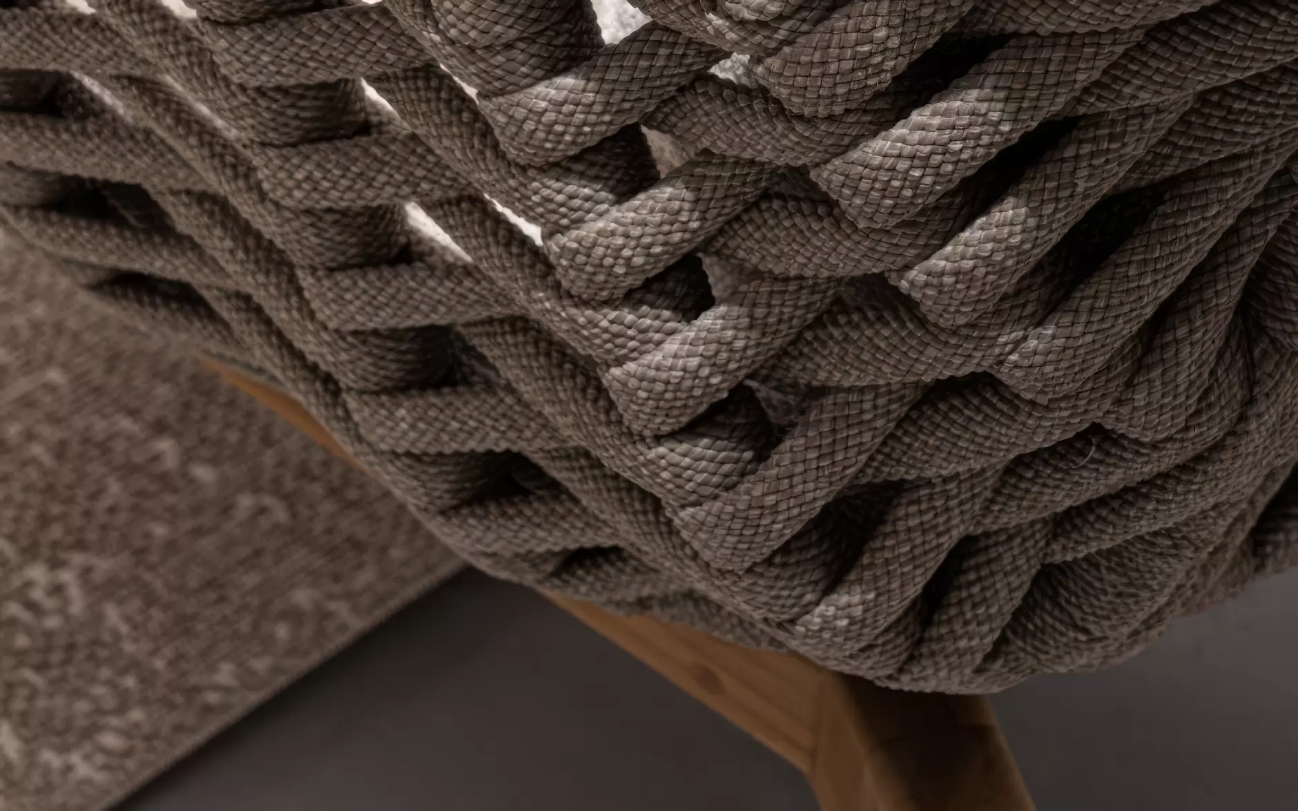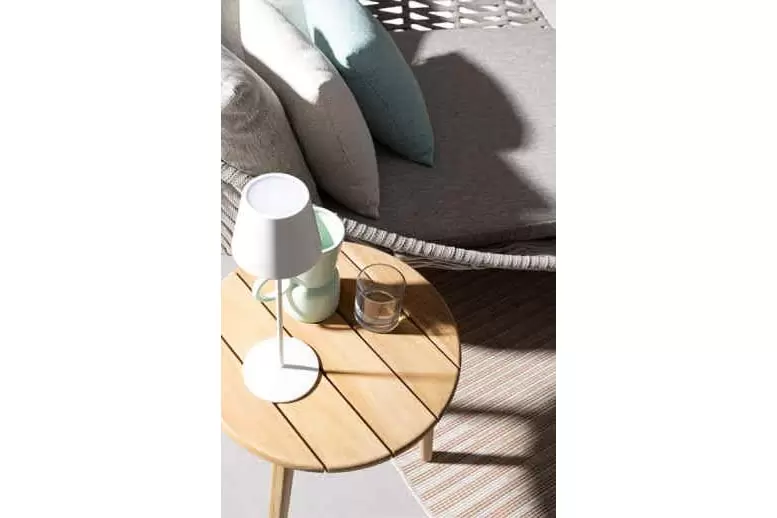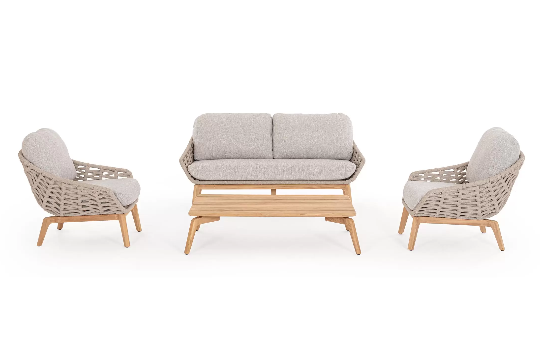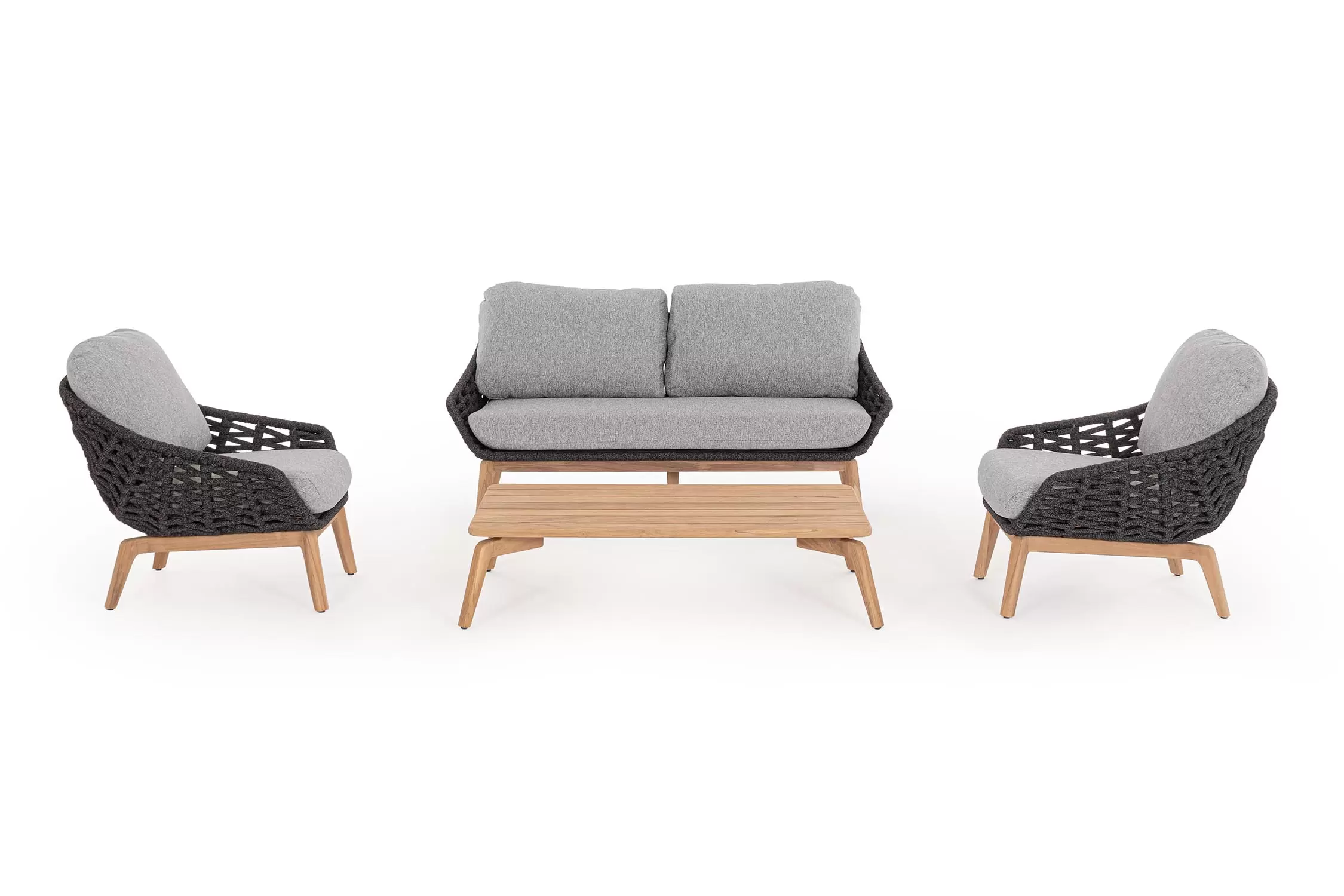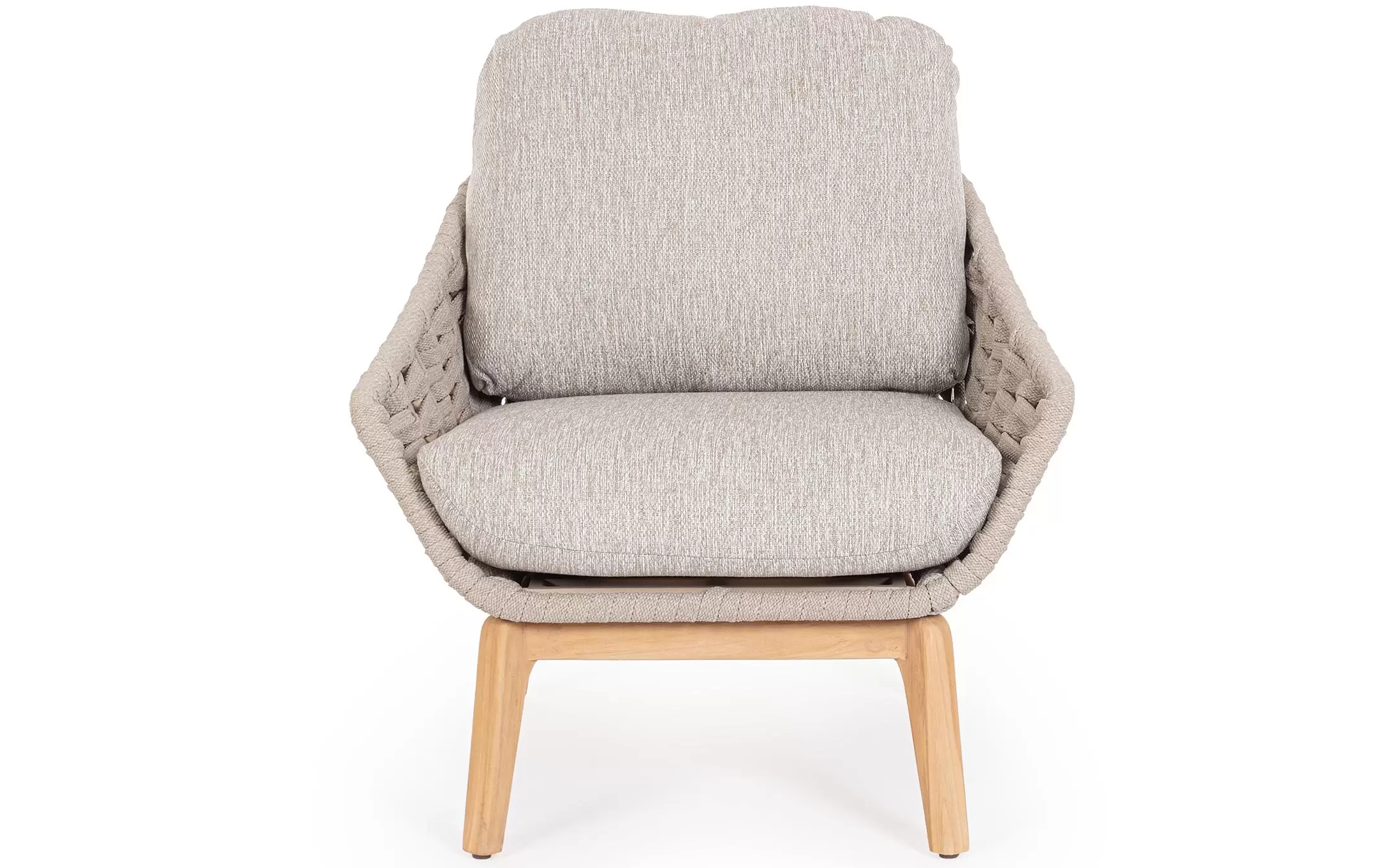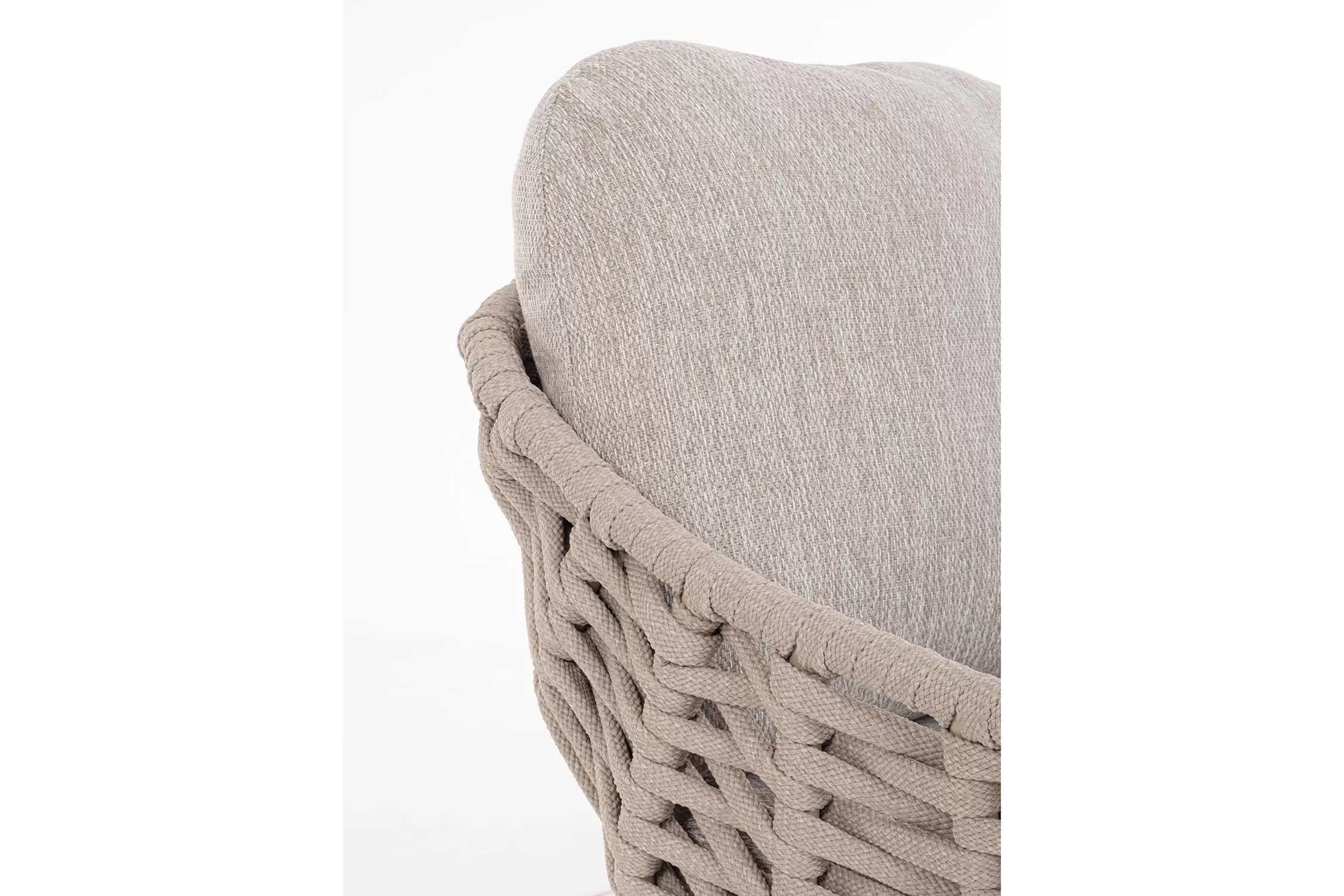 Konstrukcja fotela opiera się na lekkiej, aluminiowej ramie oraz nogach wykonanych z certyfikowanego drewna teakowego, co tworzy harmonijną kompozycję nowoczesności z naturalnym ciepłem. Nowoczesny charakter mebla podkreśla ażurowe oparcie wykonane z gęstego splotu liny polipropylenowej, która nie tylko wygląda stylowo, ale zapewnia również doskonałą wentylację i sprężyste wsparcie dla pleców. To mebel, który przyciąga wzrok swoją organiczną formą i obiecuje najwyższy standard wypoczynku na świeżym powietrzu.
