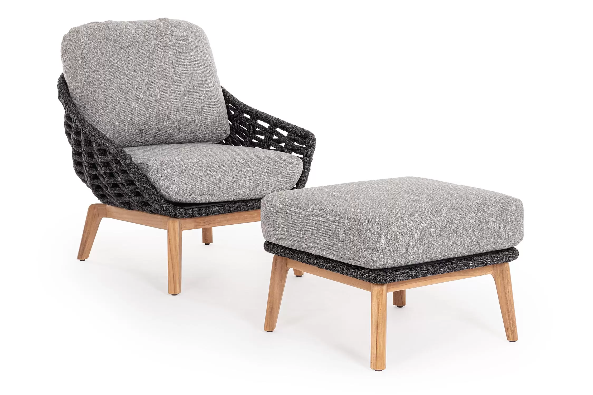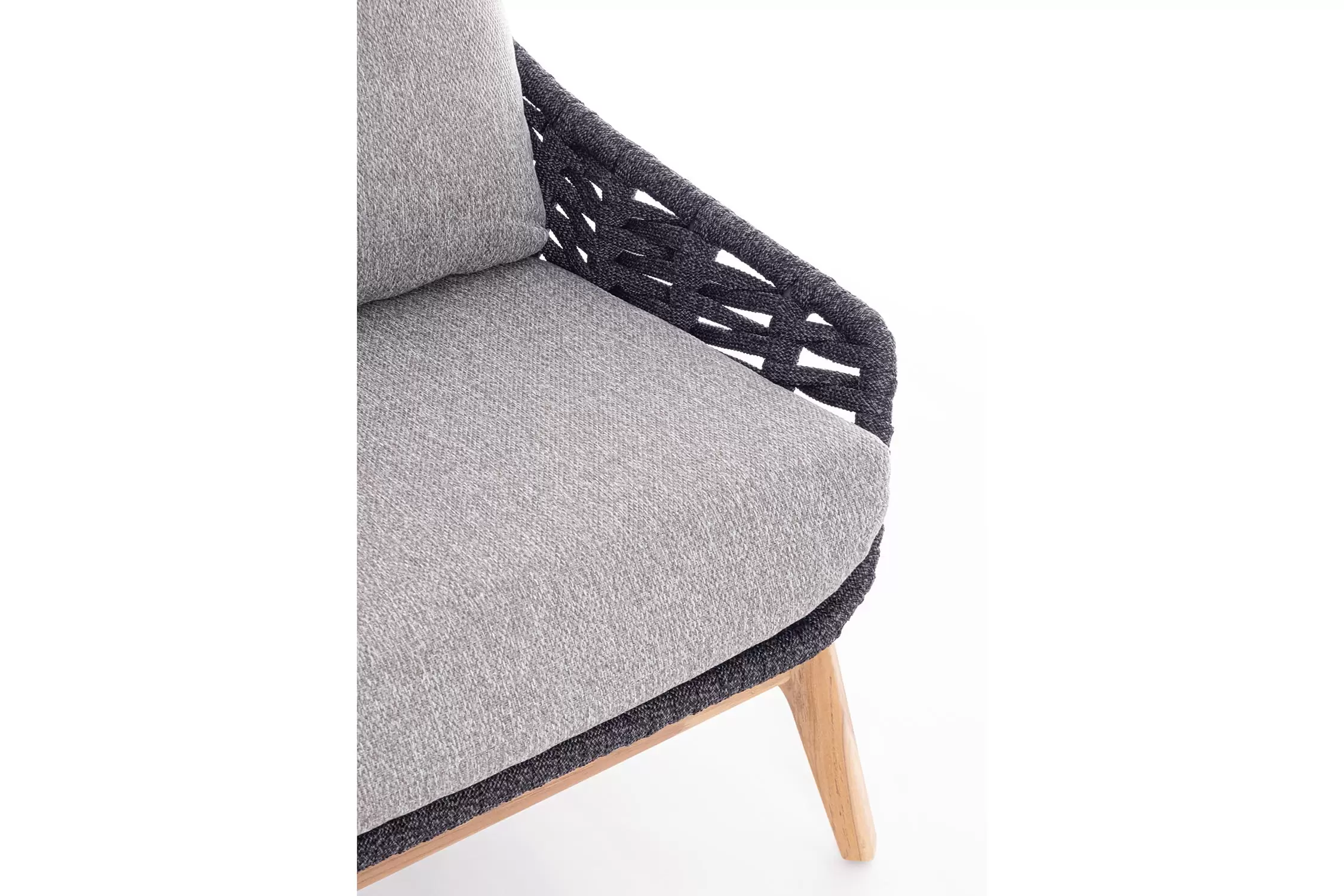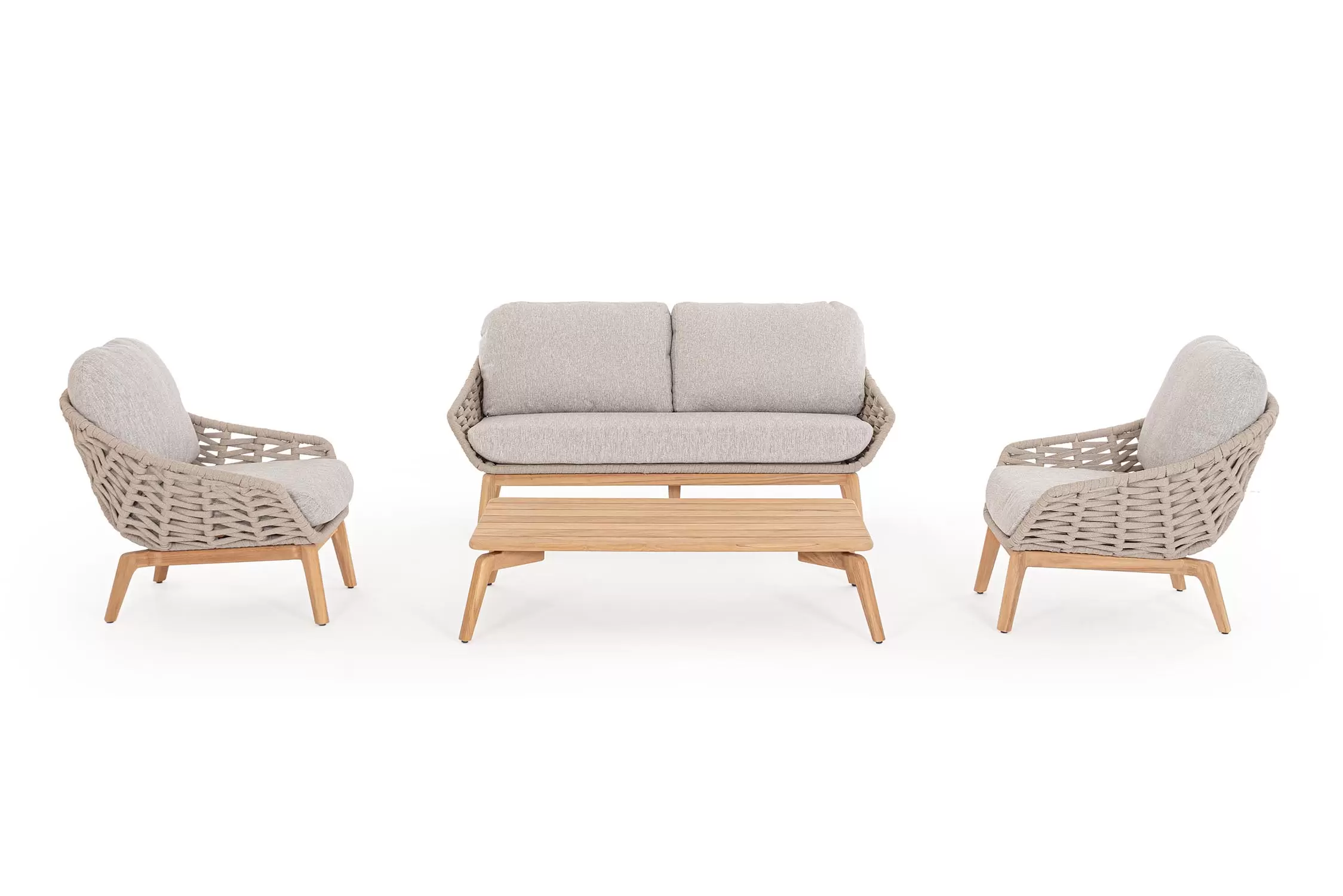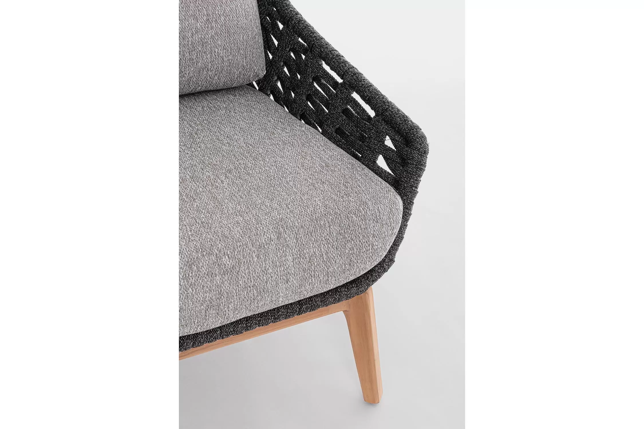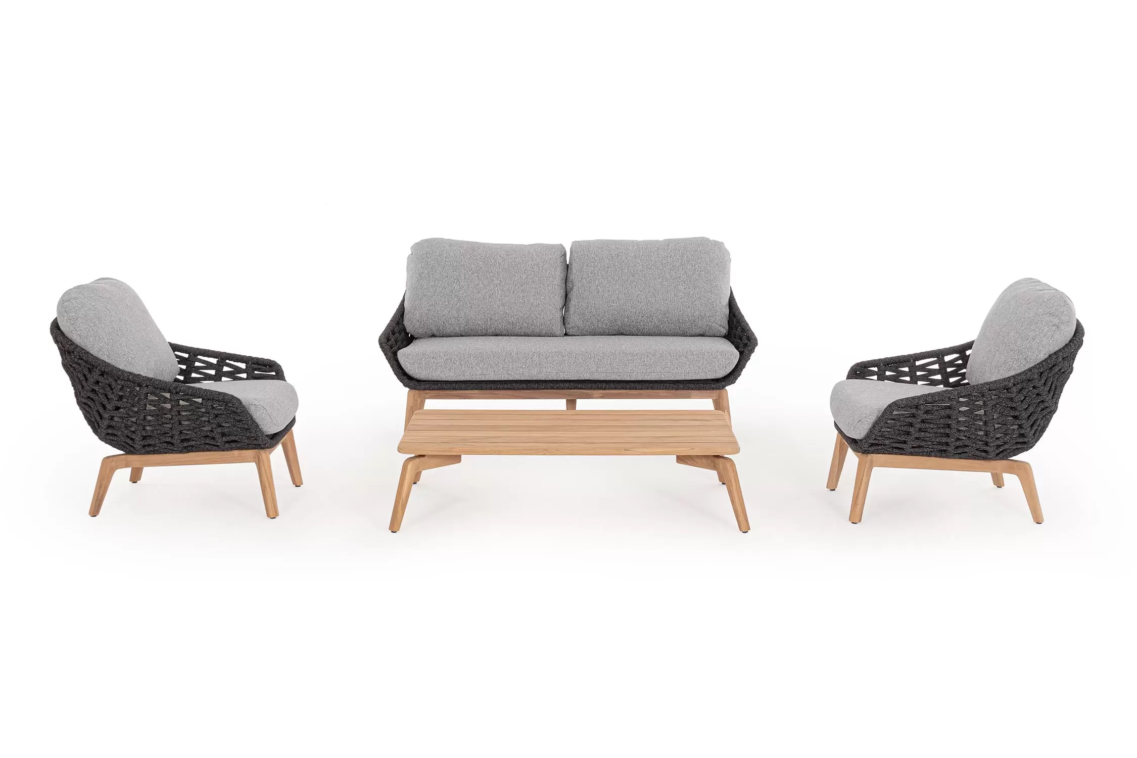 Fundamentem mebli jest harmonijne połączenie lekkiego aluminium z ciepłym, szlachetnym drewnem teakowym, co tworzy nowoczesną, a zarazem przytulną estetykę. Ażurowe oparcia wykonane z gęstego splotu liny polipropylenowej nadają bryle wizualnej lekkości i zapewniają doskonałą cyrkulację powietrza. Sercem zestawu jest stół z litego teku, którego naturalny design i płynne linie blatu podkreślają ekologiczny charakter kolekcji, czyniąc go centralnym punktem każdej prestiżowej strefy relaksu.