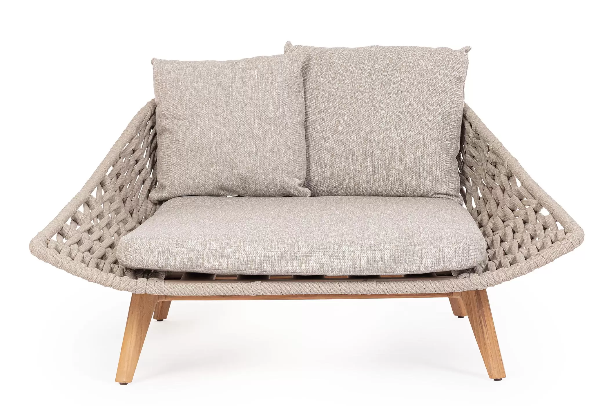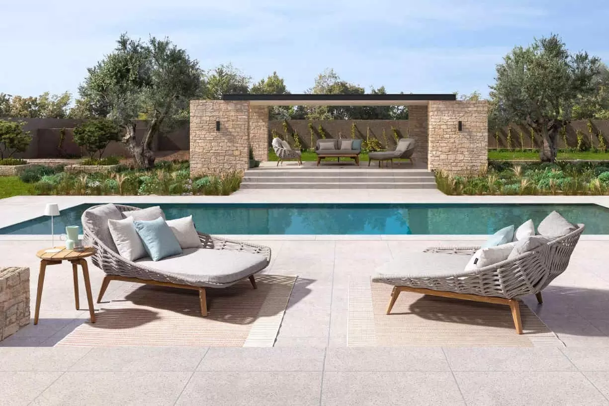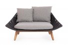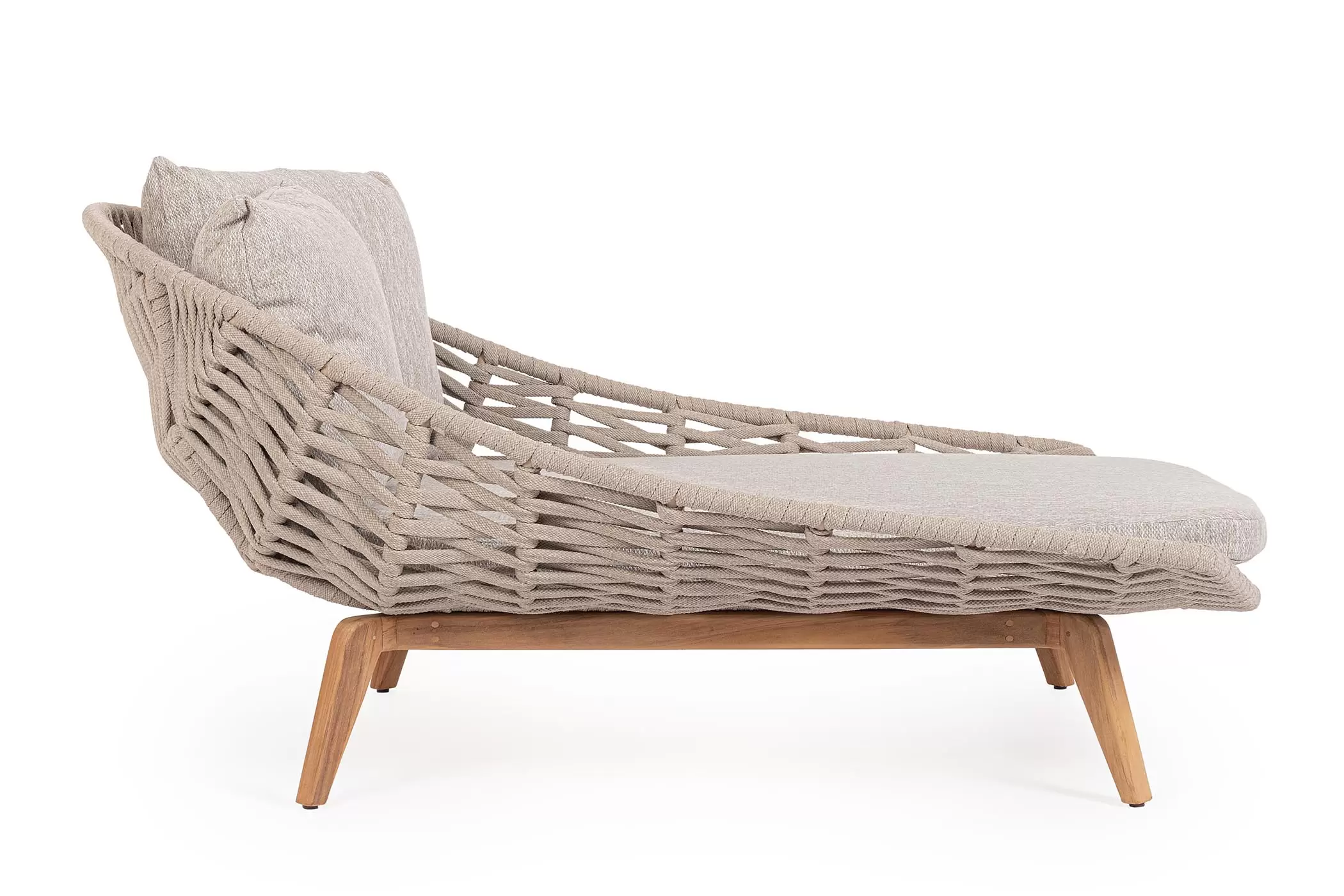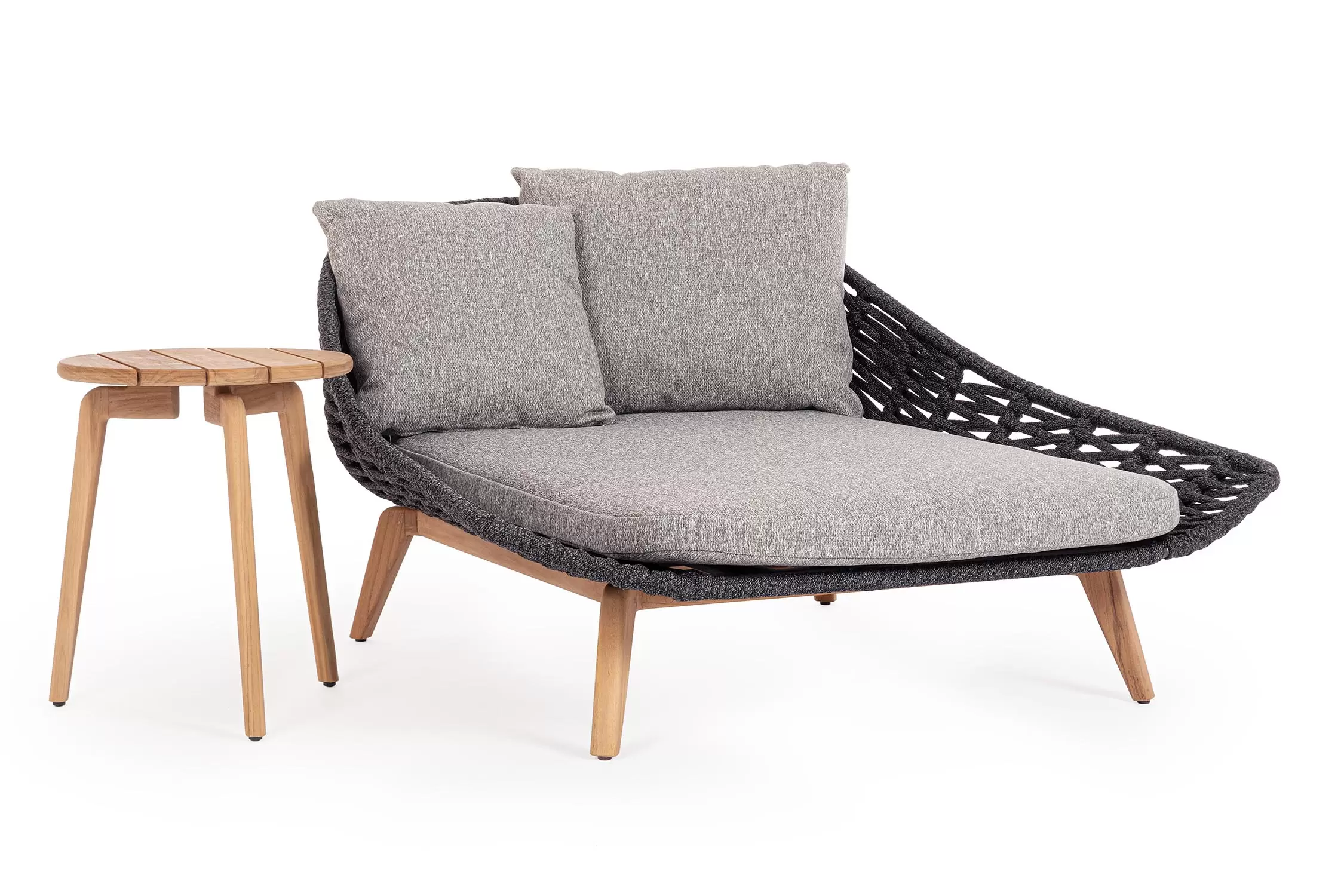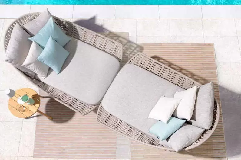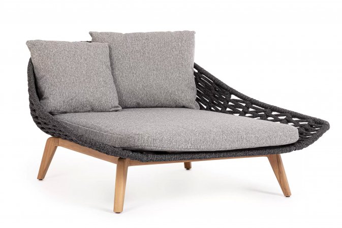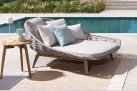 Luksusowe dwuosobowe łóżko wypoczynkowe na taras. Podstawa z drewna teak. Oparcie o konstrukcji aluminiowej z plecionką z liny polipropylenowej. Poduszki szybkoschnące z poszewkami z materiału Olefin.