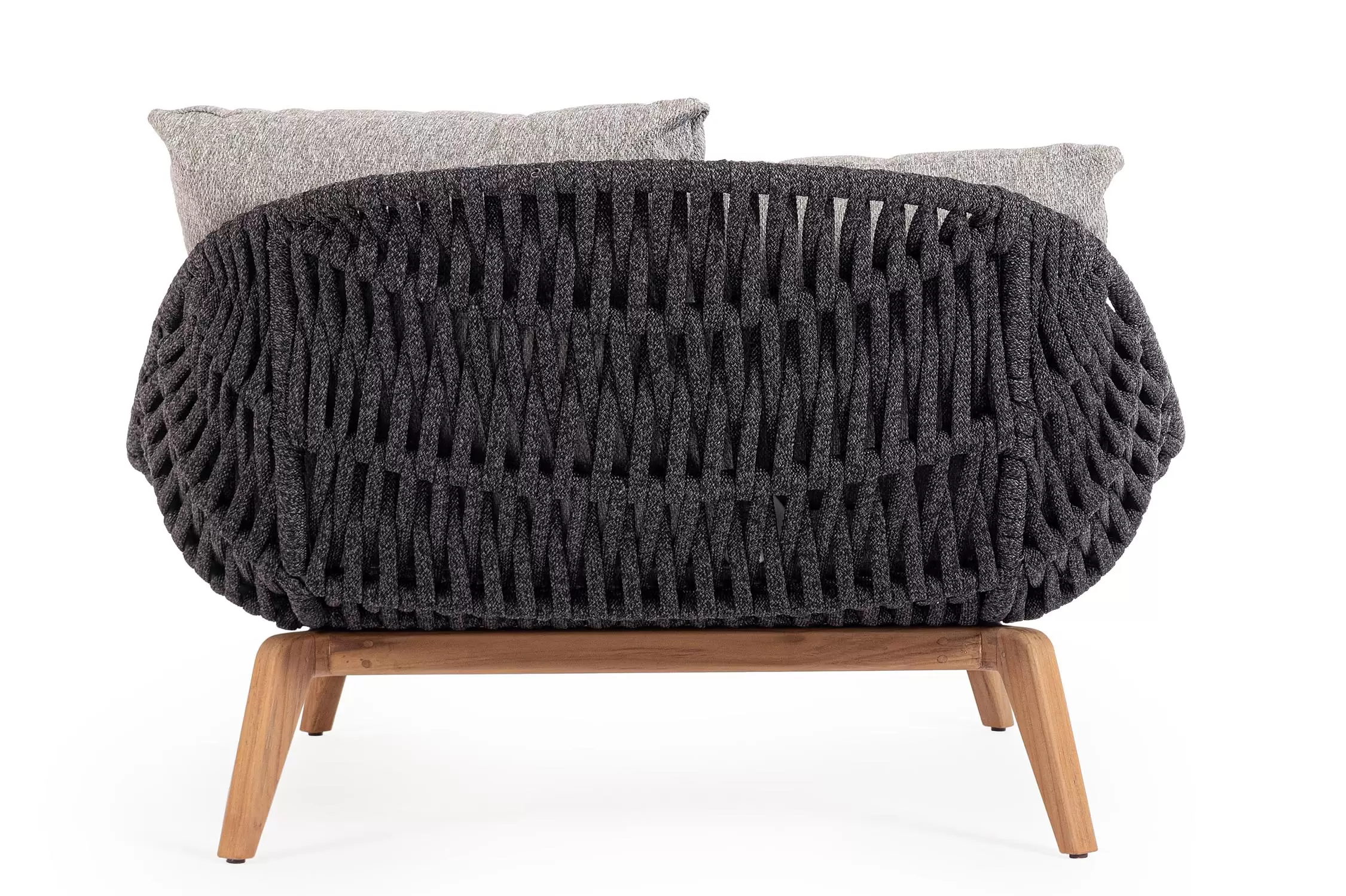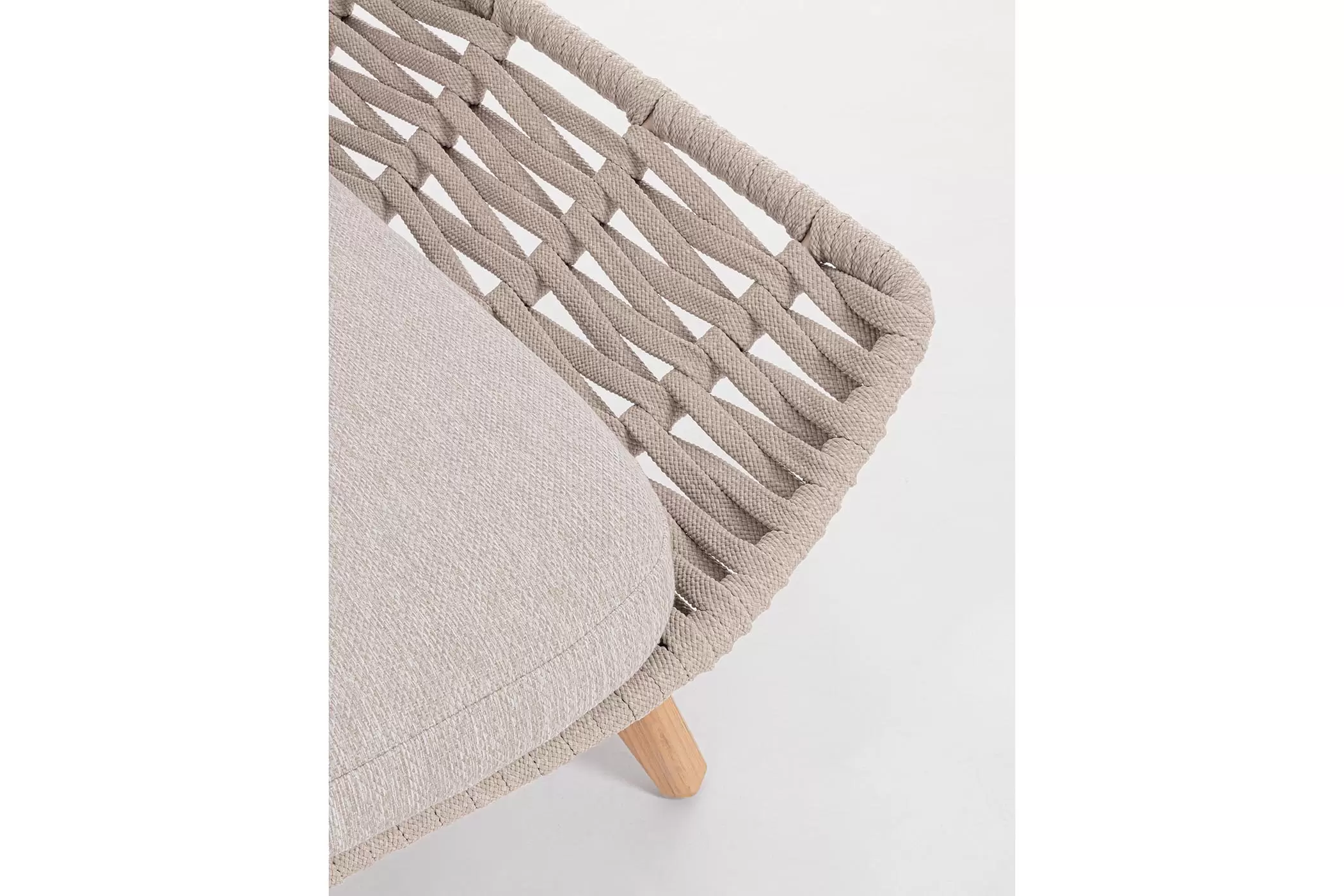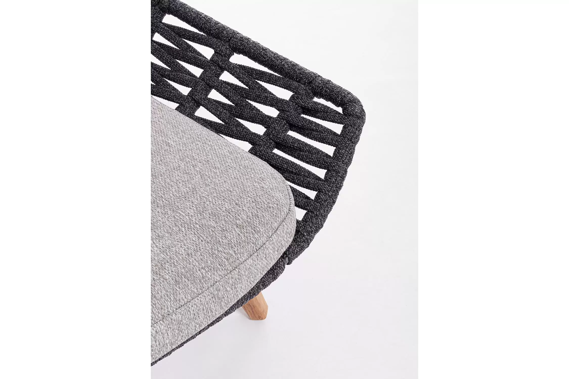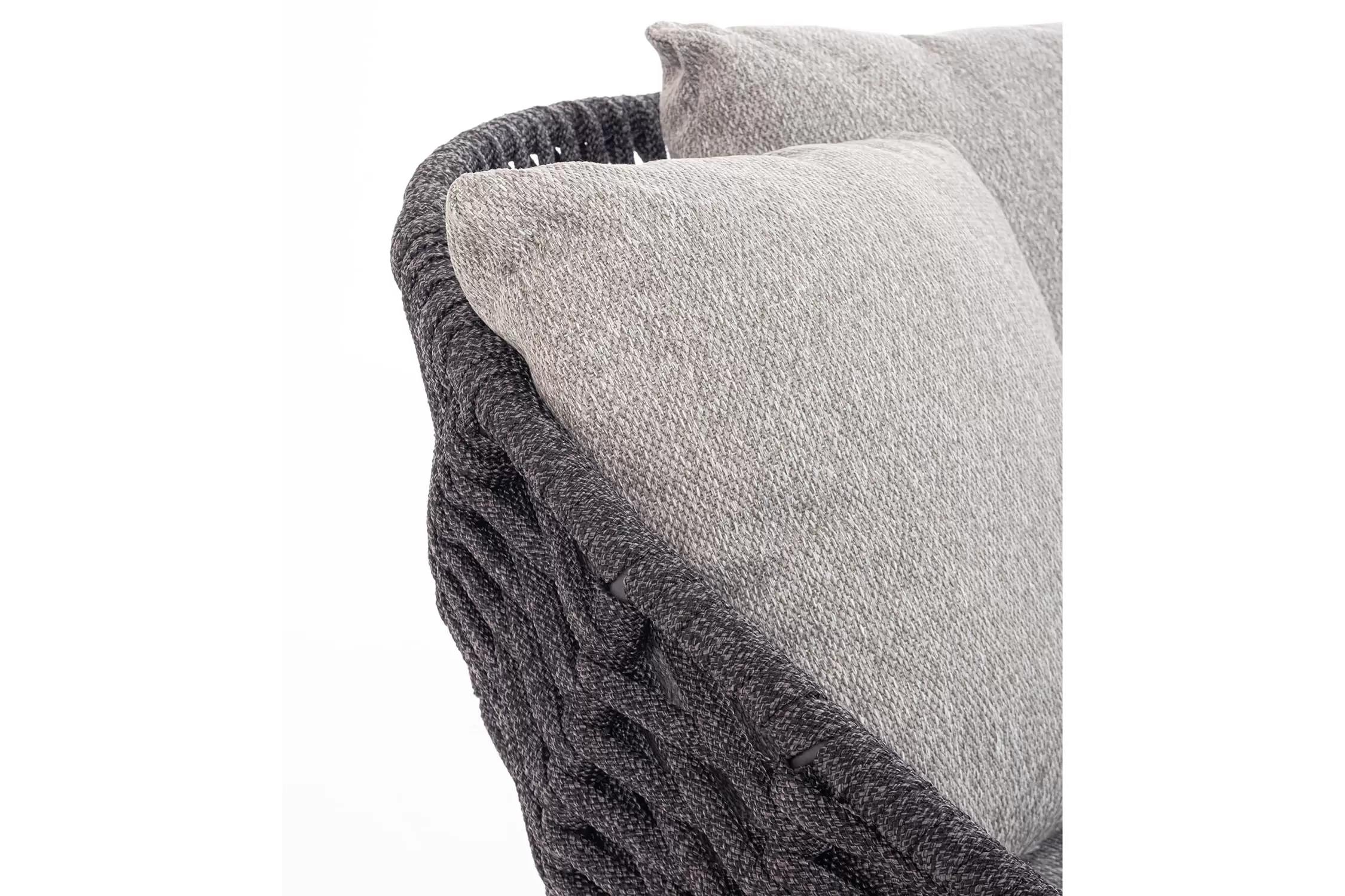 Boki i opacie mebla z aluminium malowanego proszkowo. Oplecione liną polipropylenową odporną na wodę i UV.