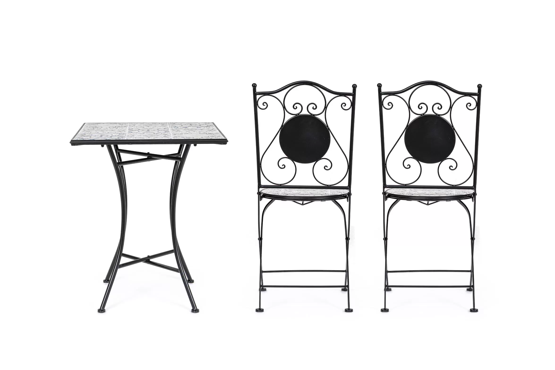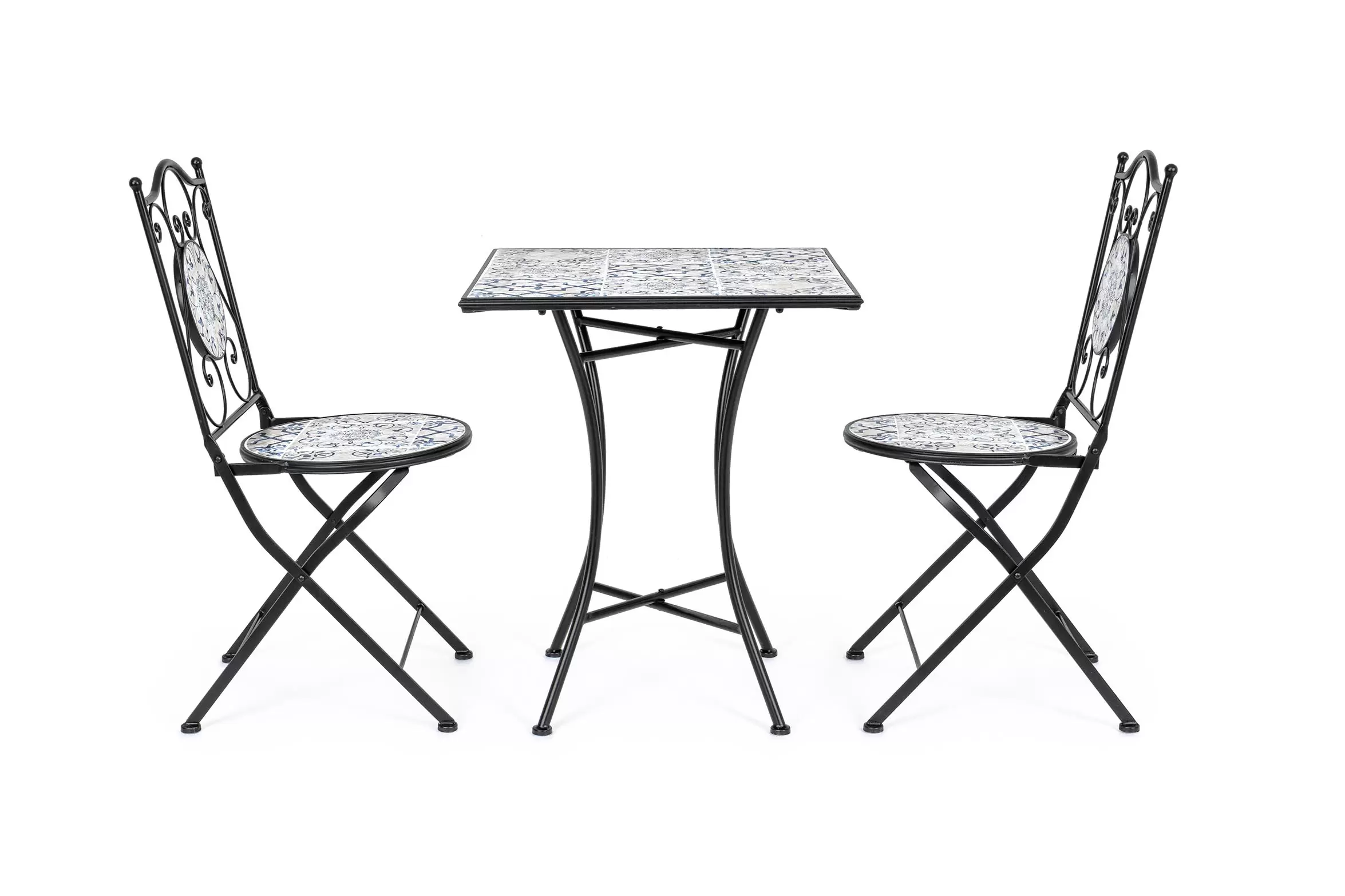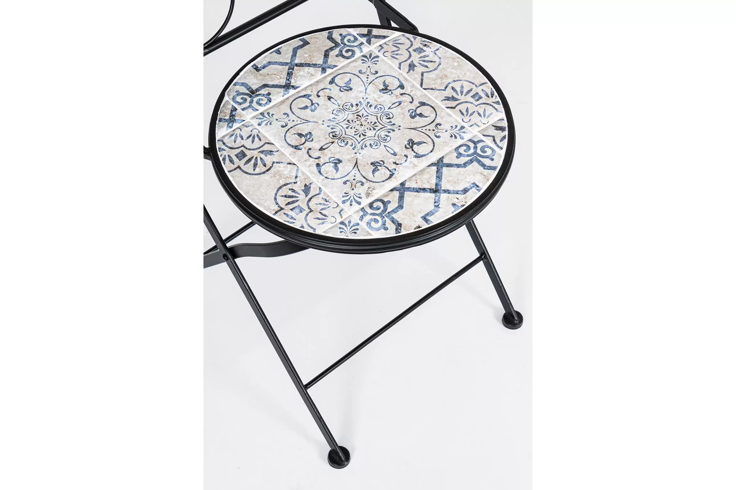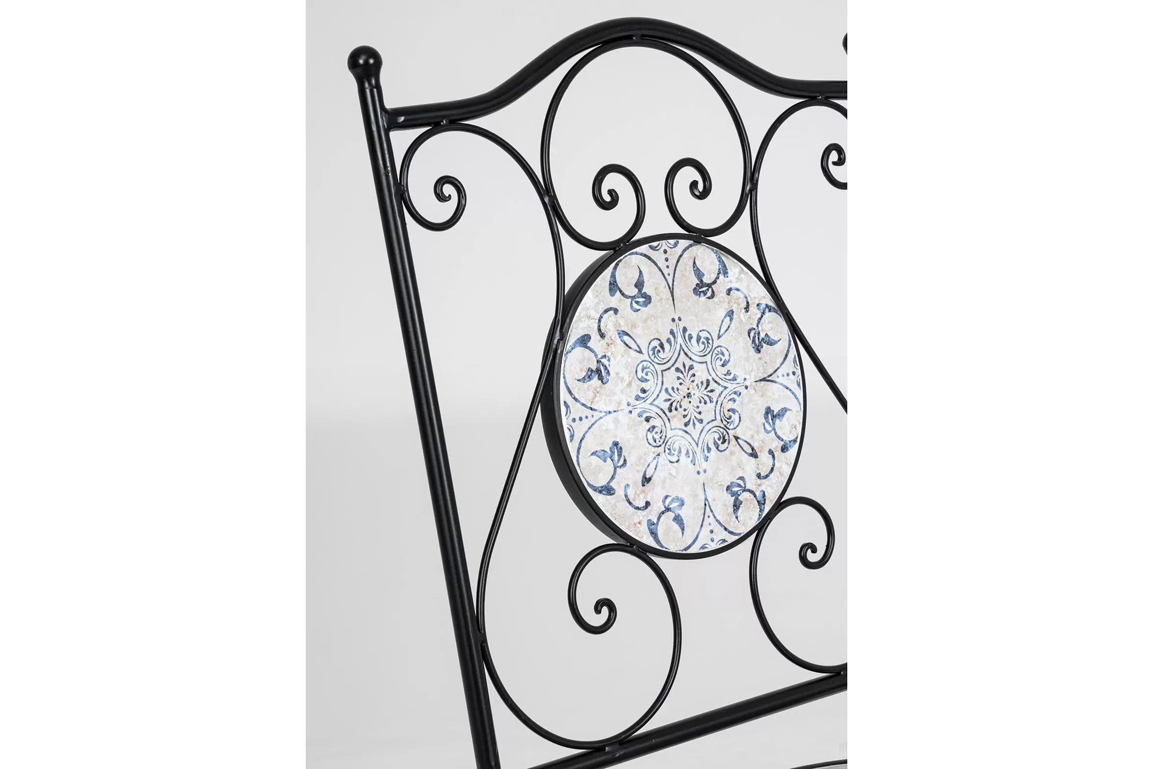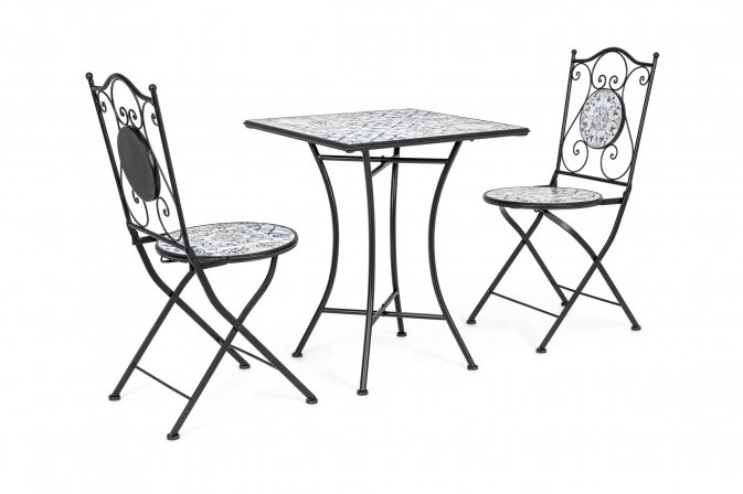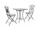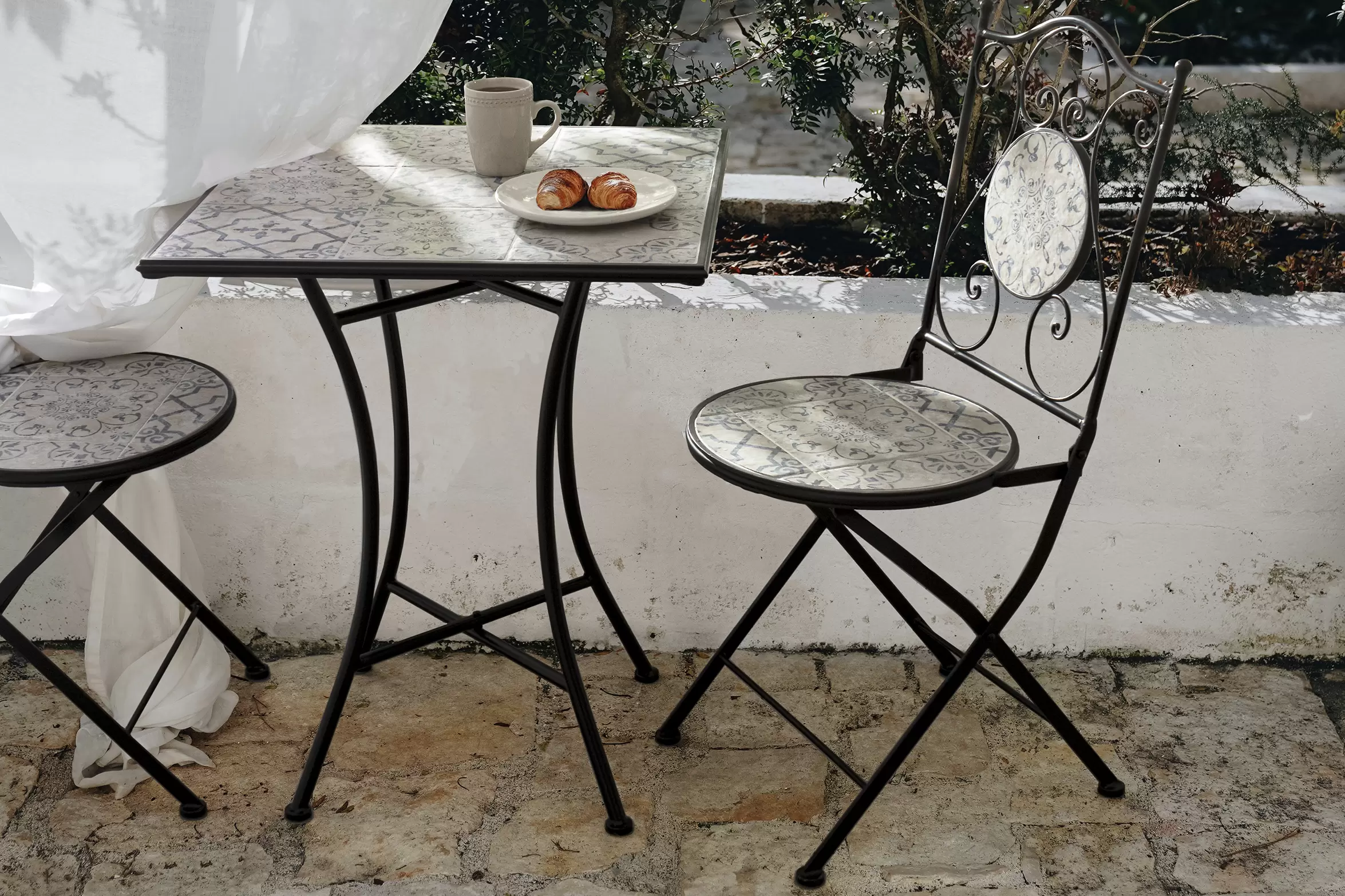 Rama stalowa do użytku zewnętrznego (ocynk) i malowana proszkowo. Blat, siedzisko i dekoracje z ceramiki.