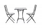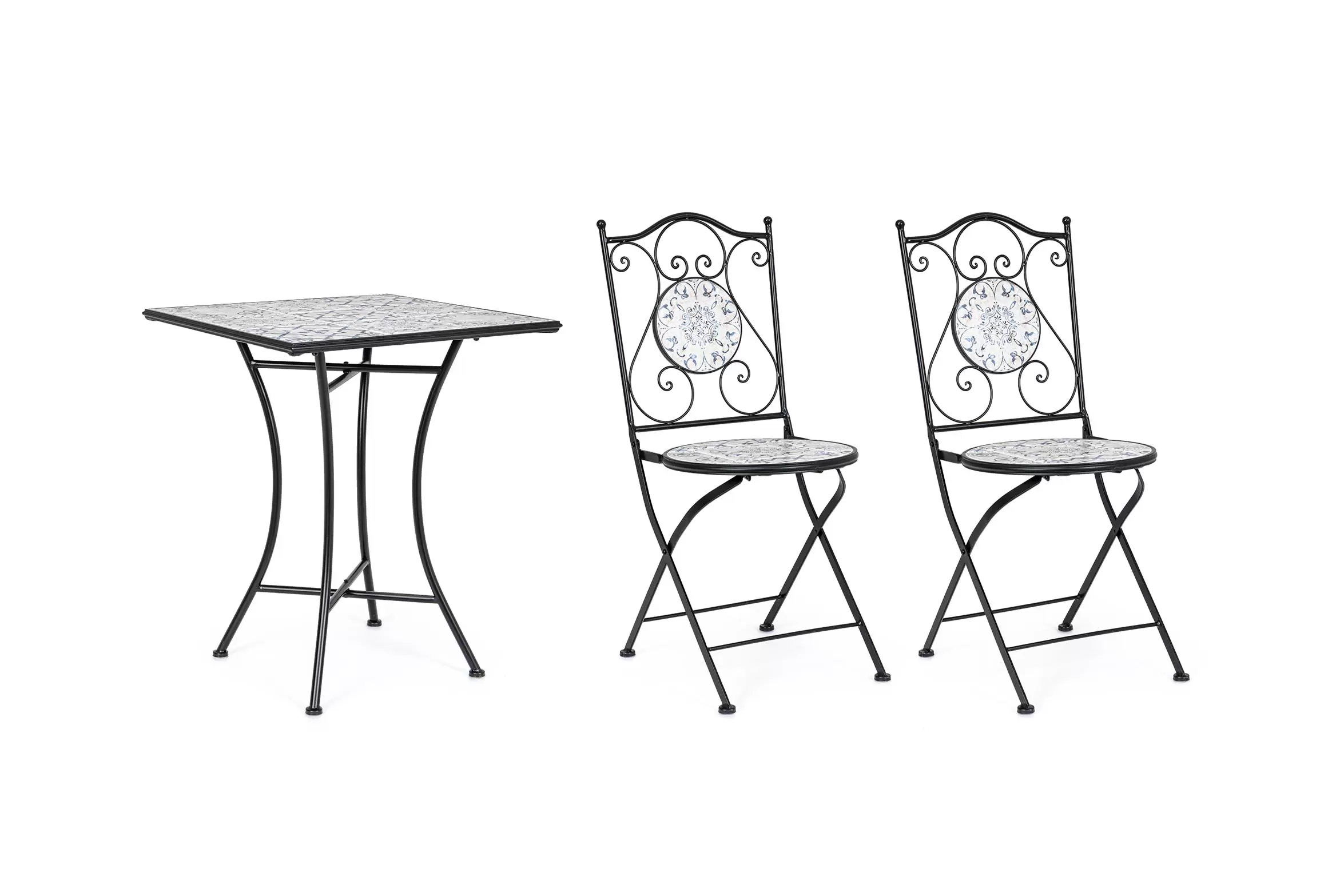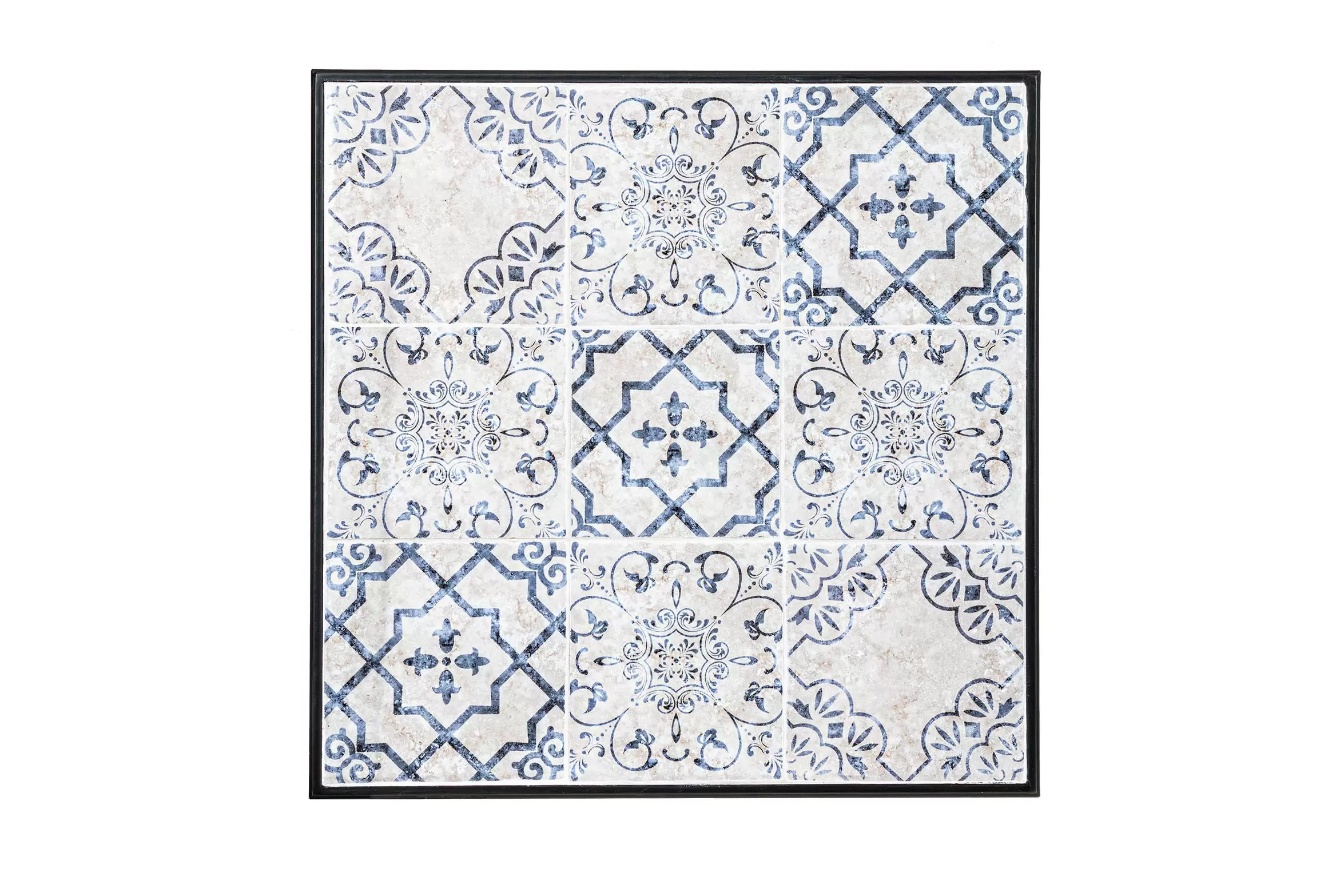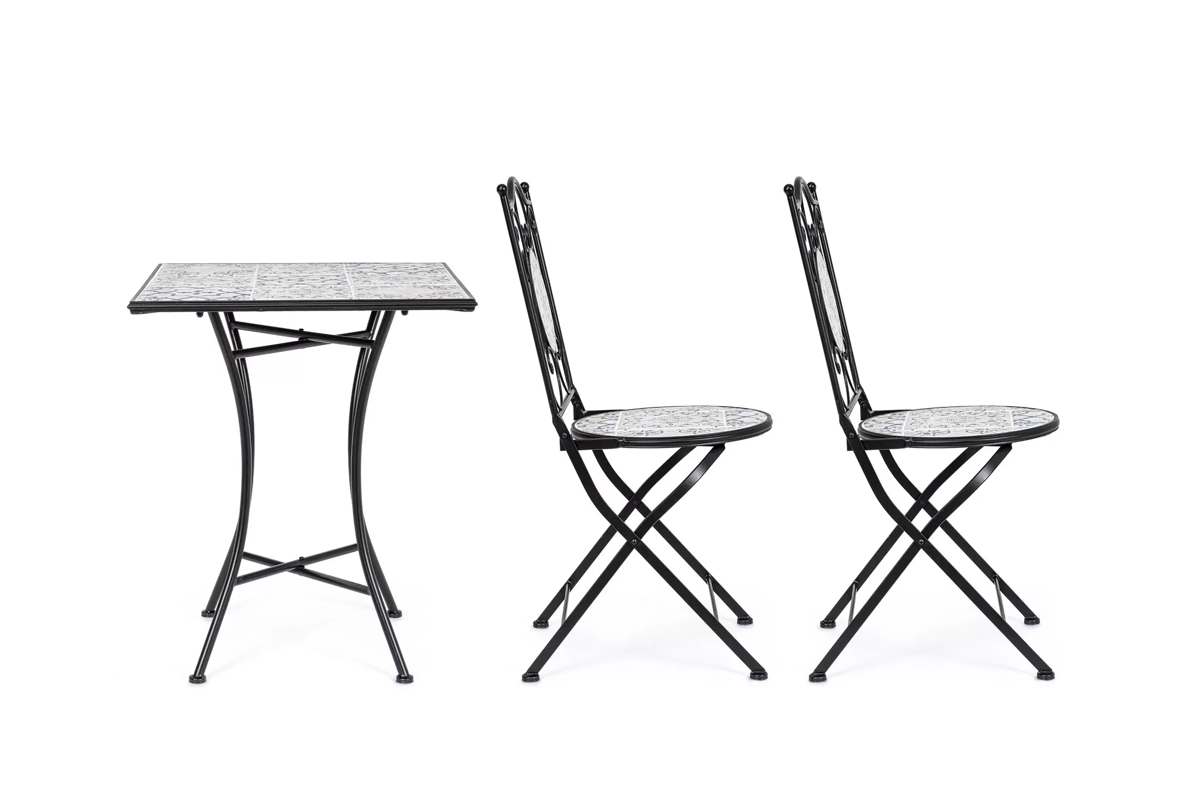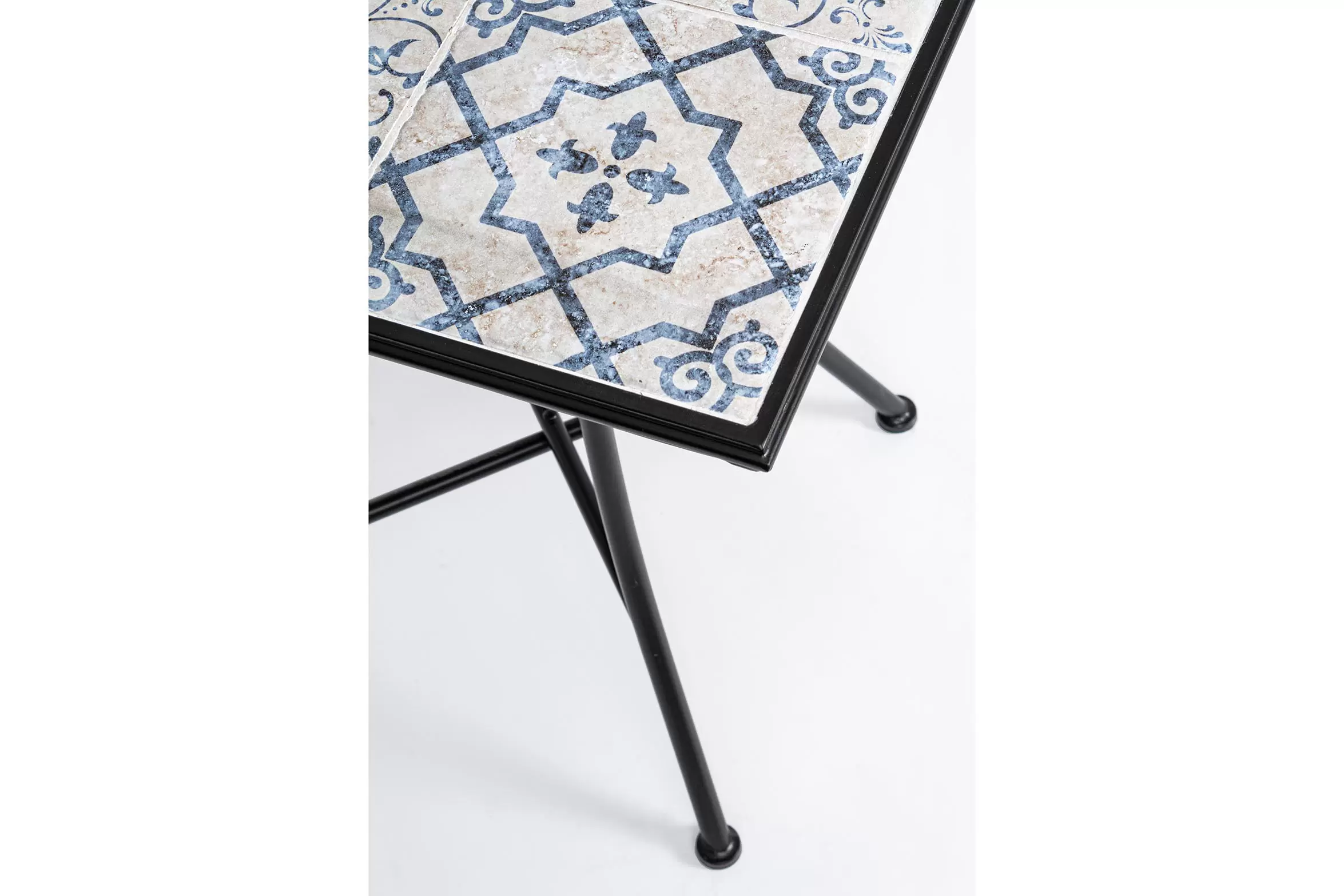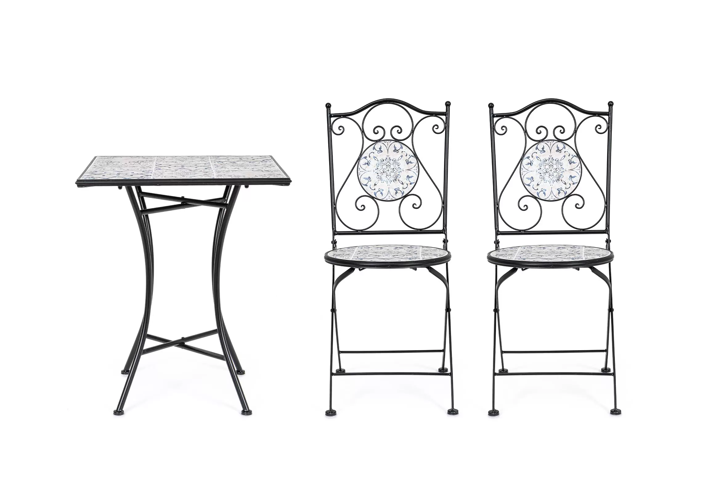 Rama stalowa do użytku zewnętrznego (ocynk) i malowana proszkowo. Blat, siedzisko i dekoracje z ceramiki.