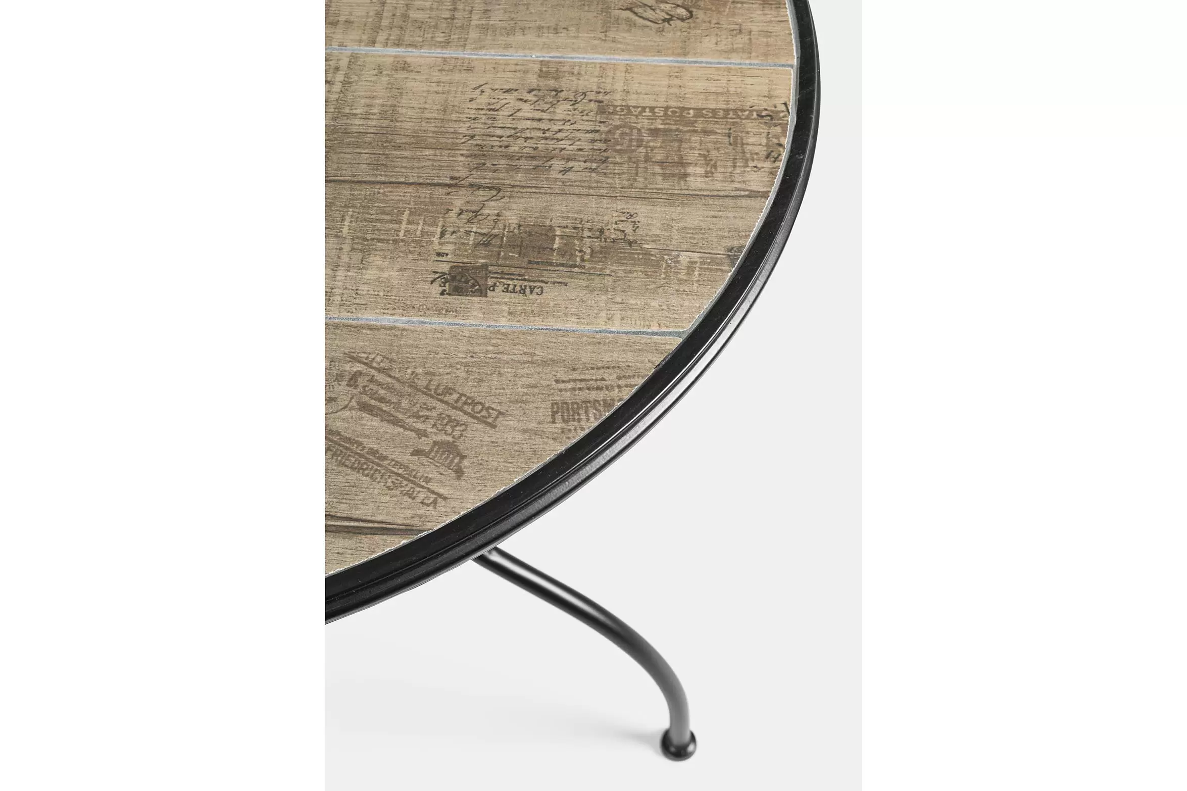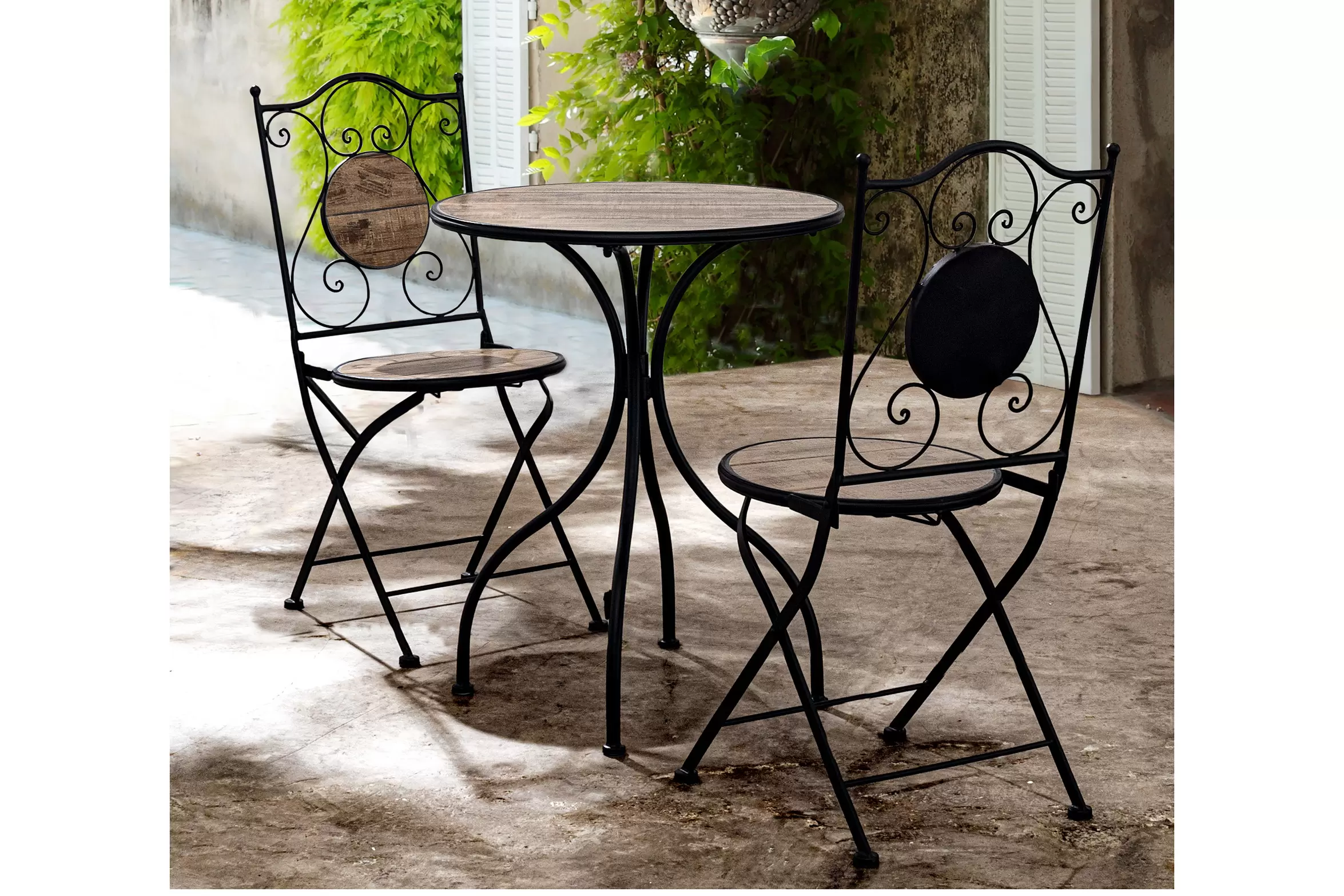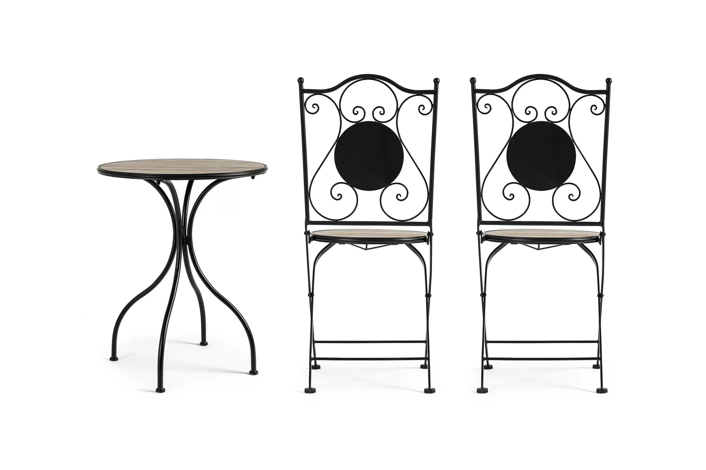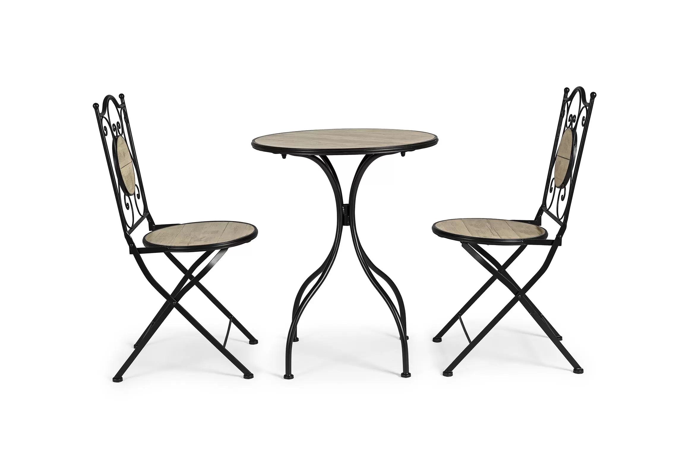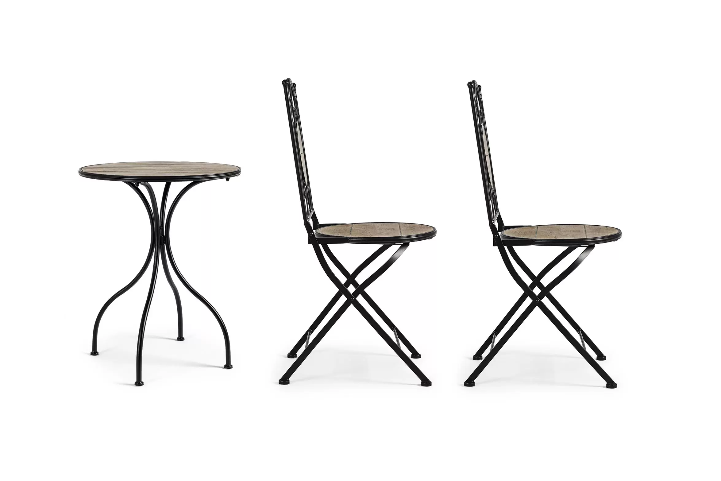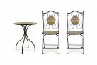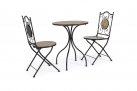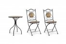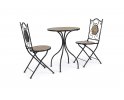 Rama stalowa do użytku zewnętrznego (ocynk) i malowana proszkowo. Blat, siedzisko i dekoracje z ceramiki.