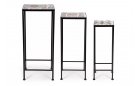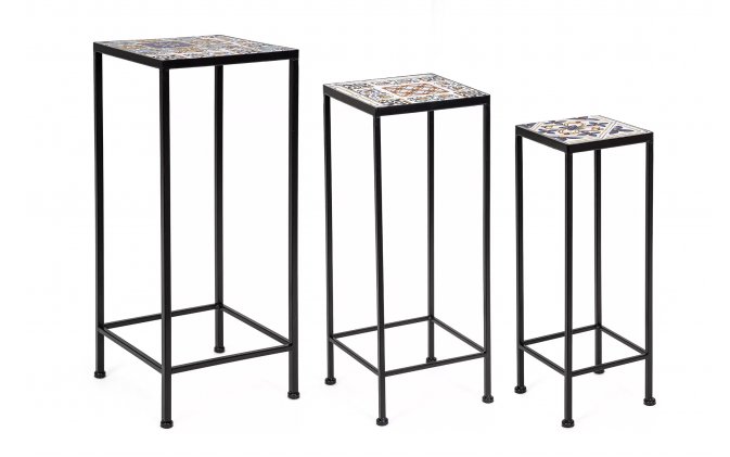 Trzy wysokie stoliki kwadratowe z blatami ceramicznymi z włoskimi klasycznymi wzorami. Stoliki idealnie pasują do mebli z kolekcji Mykonos..