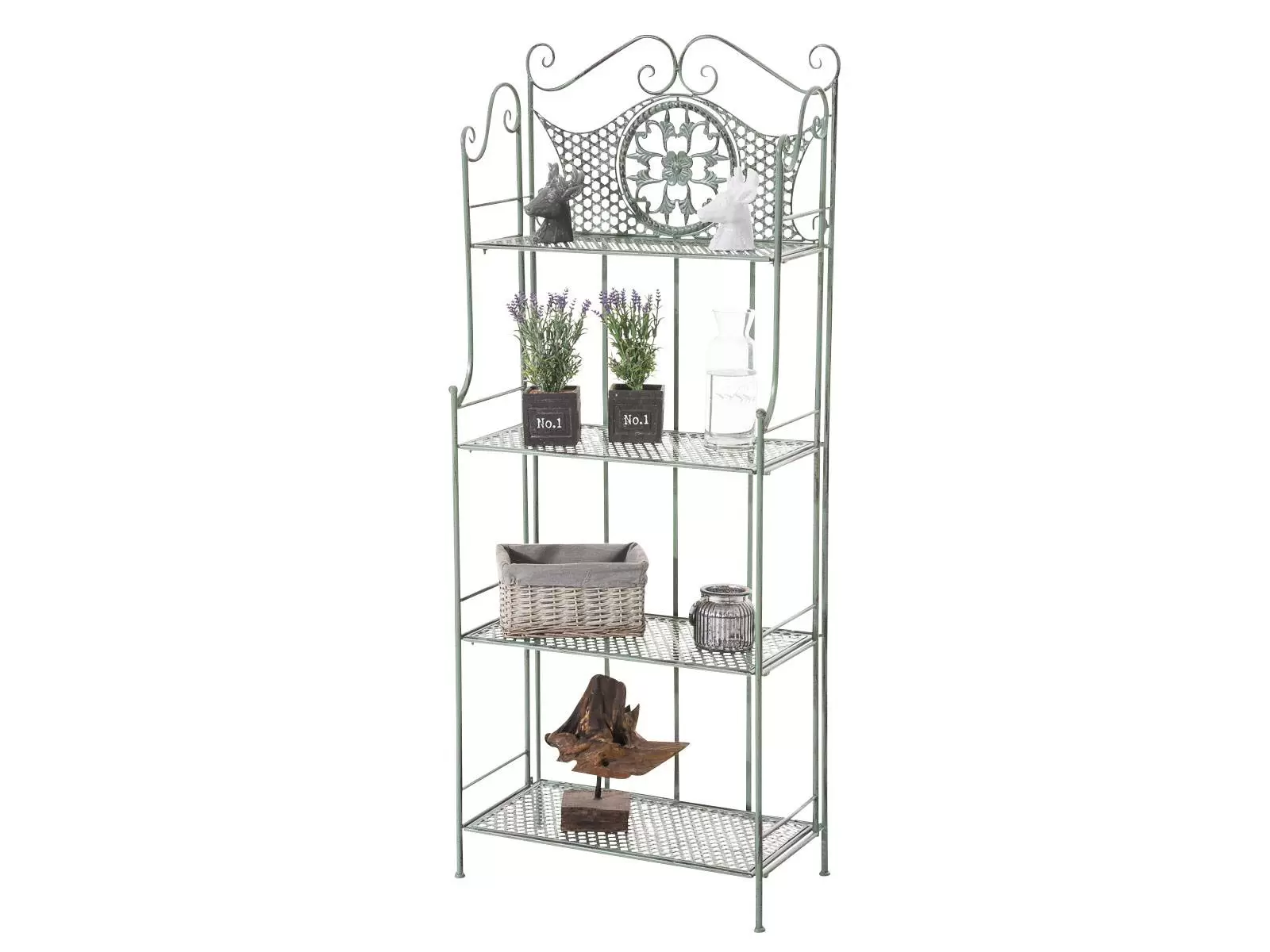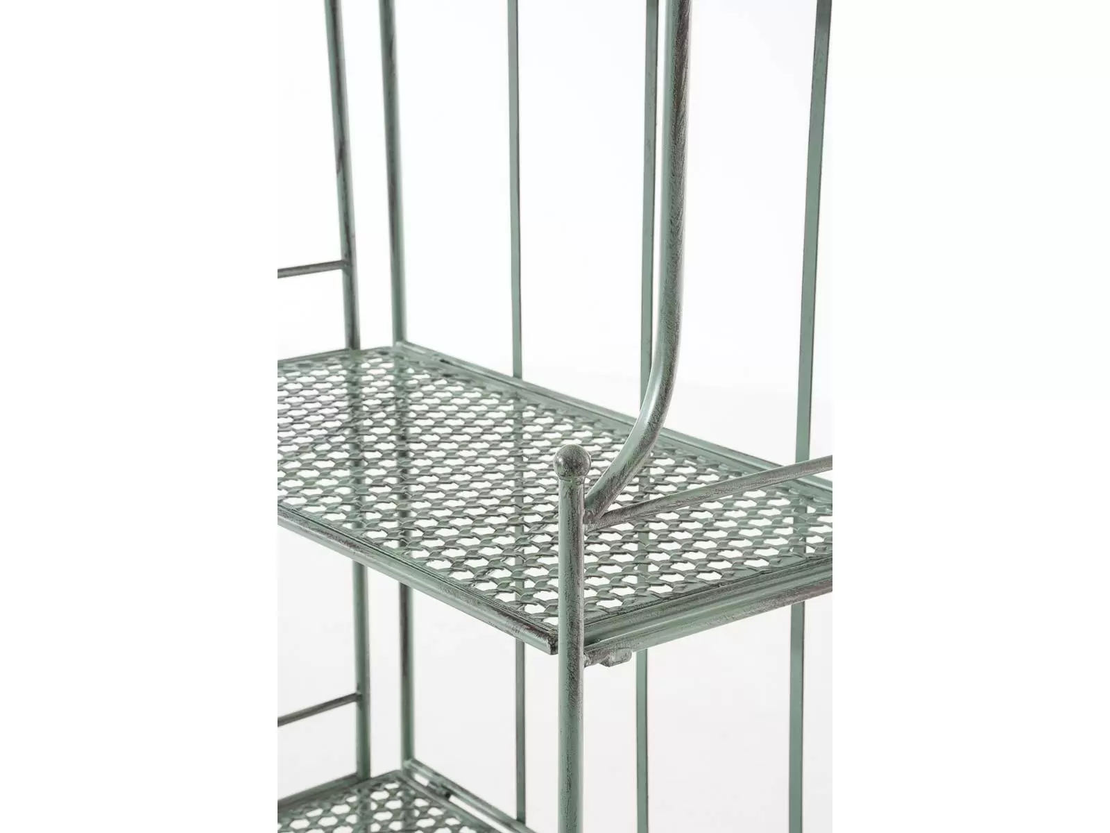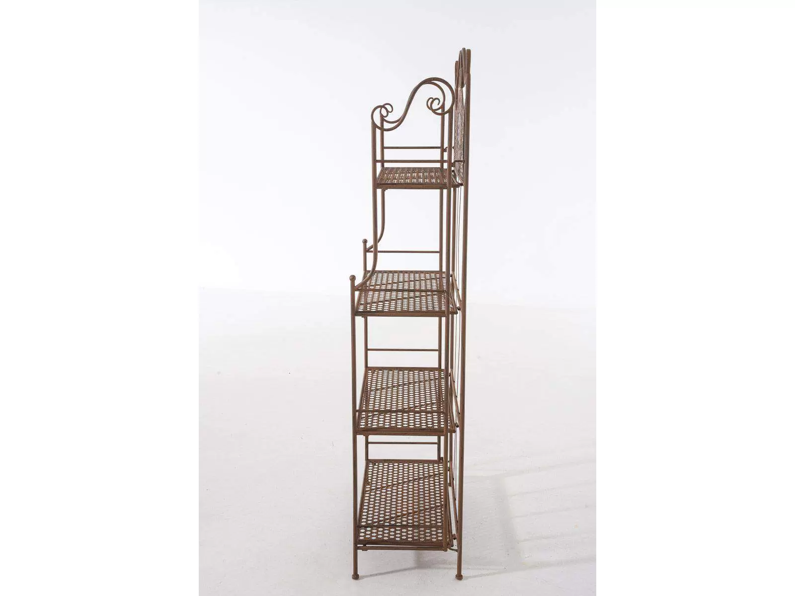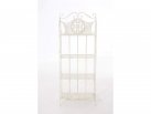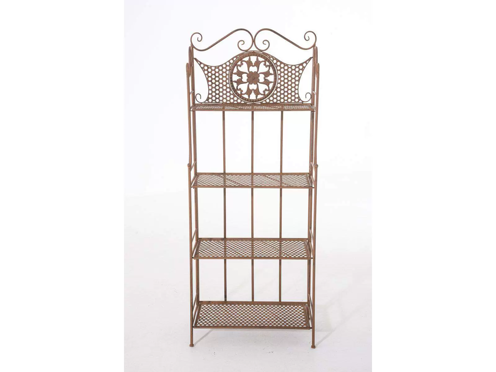 Filigranowy stojący regał wykonany z żelaza, dzięki czemu jest wyjątkowo wytrzymały.