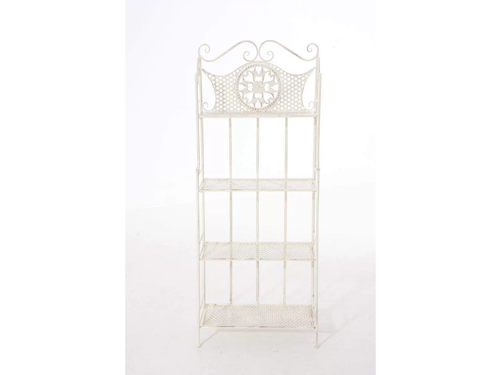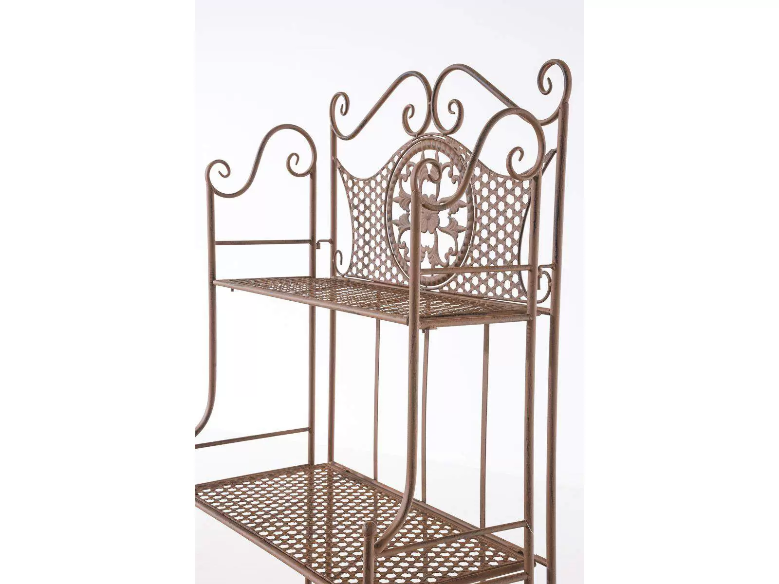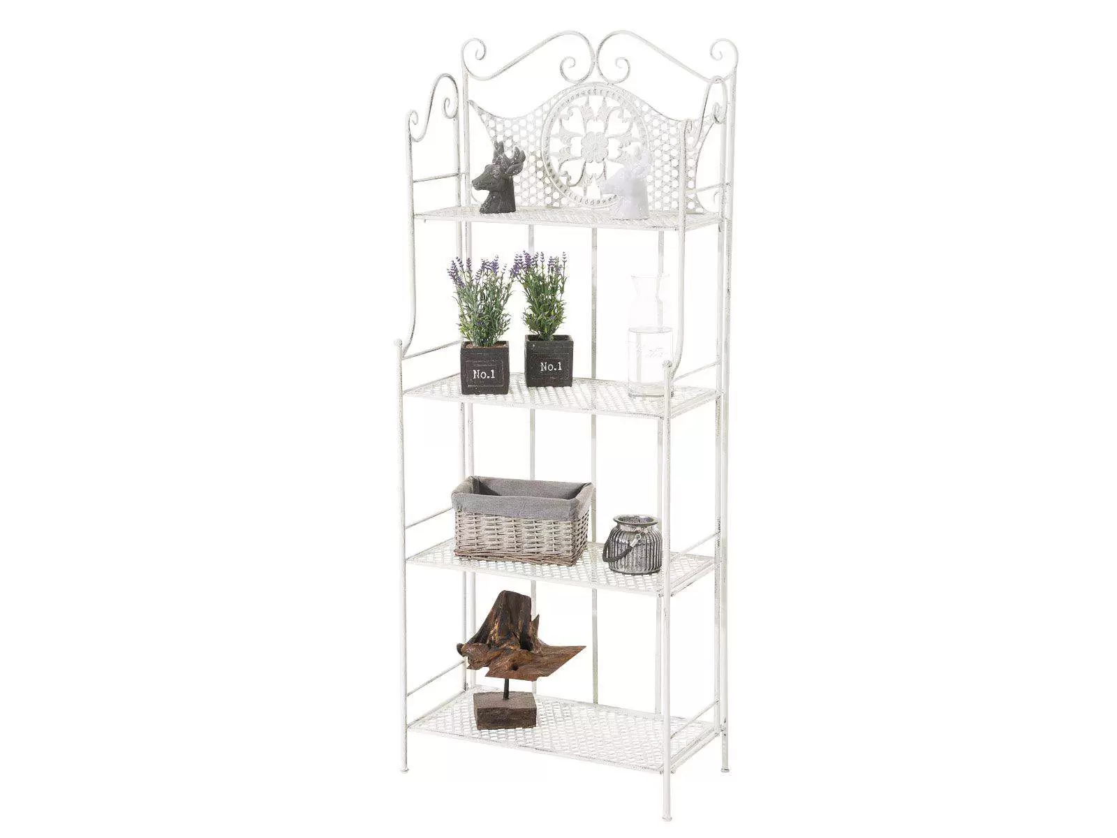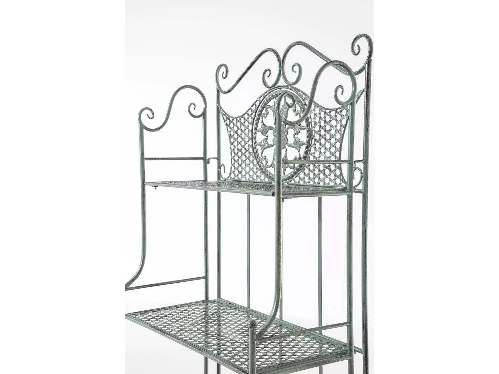 Filigranowy stojący regał wykonany z żelaza, dzięki czemu jest wyjątkowo wytrzymały.