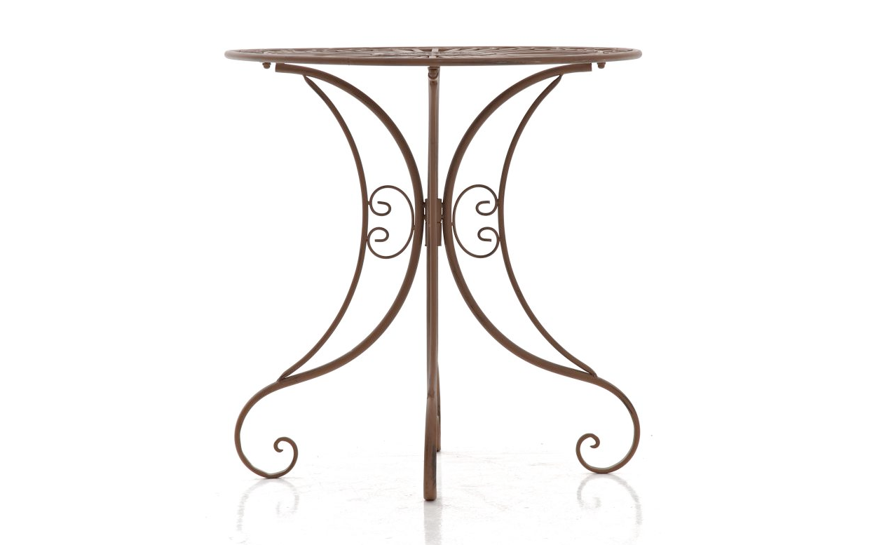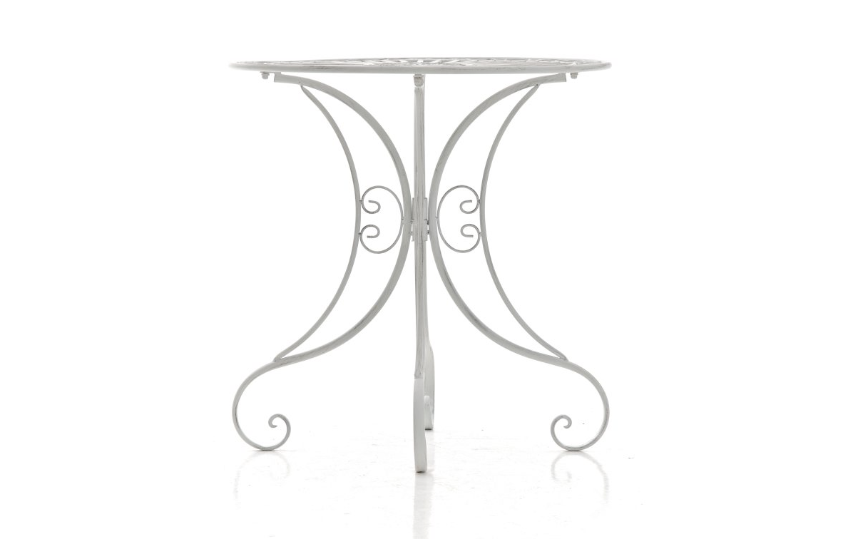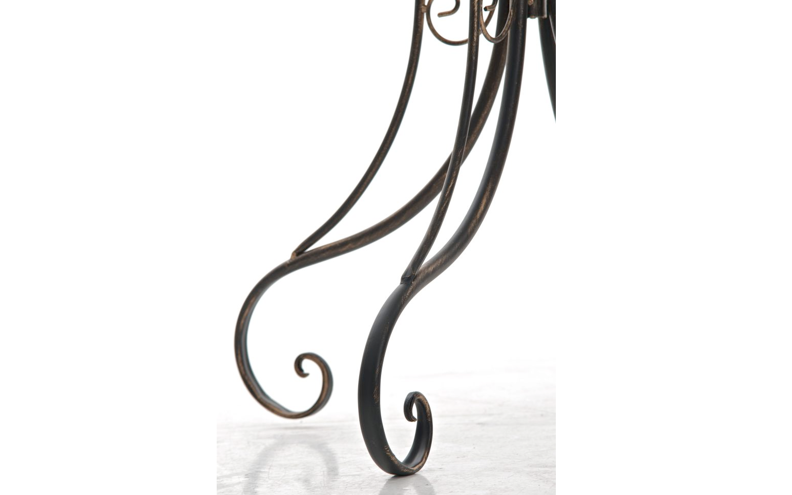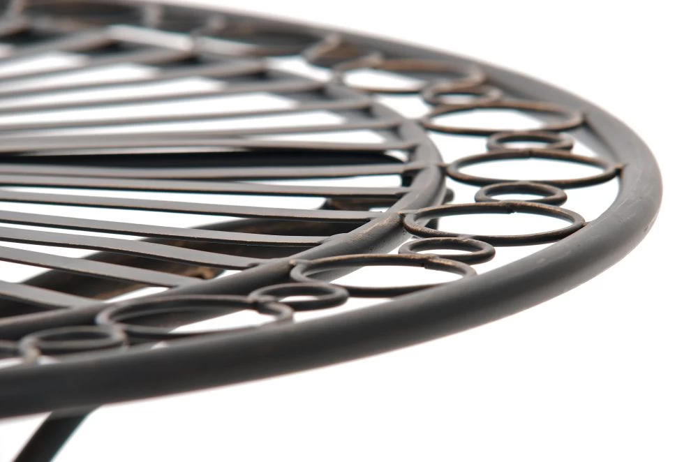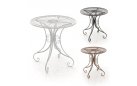 Konstrukcja stolika stalowa z ozdobnymi ornamentami z giętych prętów. Ażurowy ręcznie zdobiony blat pokryty platyną.