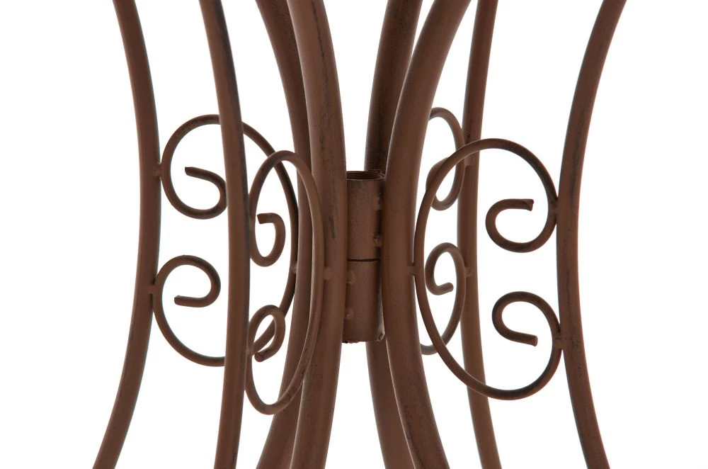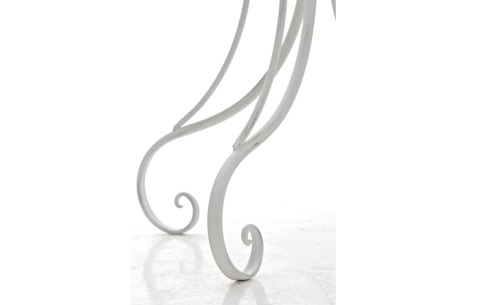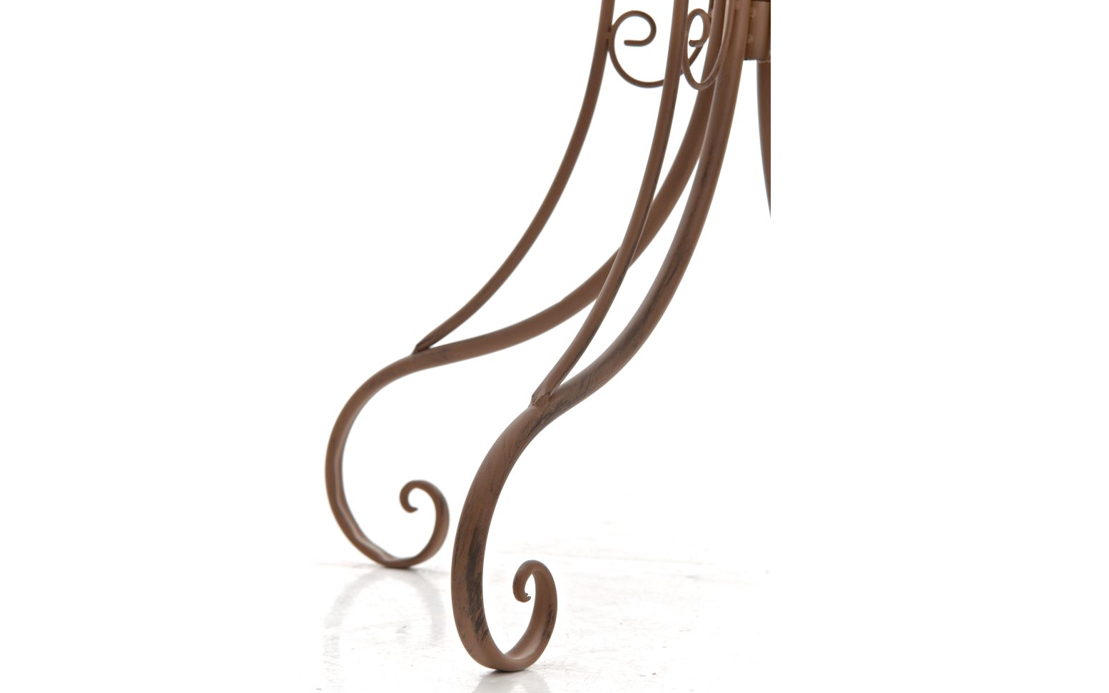 Konstrukcja stolika stalowa z ozdobnymi ornamentami z giętych prętów. Ażurowy ręcznie zdobiony blat pokryty platyną.