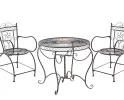 Okrągły metalowy stół w nostalgicznym stylu wykonany z żelaza oraz 2 fotele z podłokietnikami malowany w kolorach patynowanych.