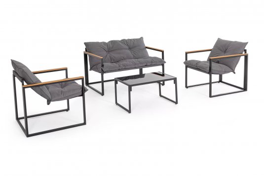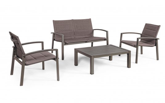 Lekki zestaw kawowy wypoczynkowy na balkon aluminiowy / sofa + 2 fotele i stolik / podłokietniki i blat z kompozytu drewnianego / poduszki z materiału poliestrowego