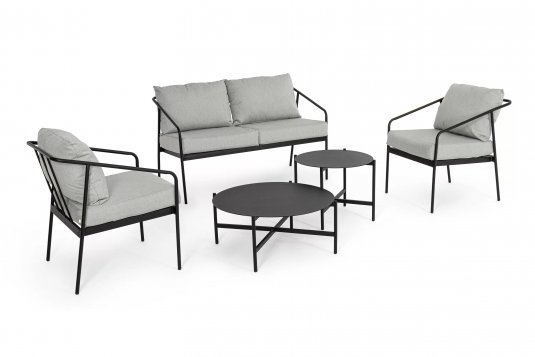 Zestaw 2 foteli wypoczynkowych z podnóżkami i stolikiem kawowym / fotele posiadają małe stoliczki/podłokietniki / aluminium kolor antracyt lub biały / poduszki szare