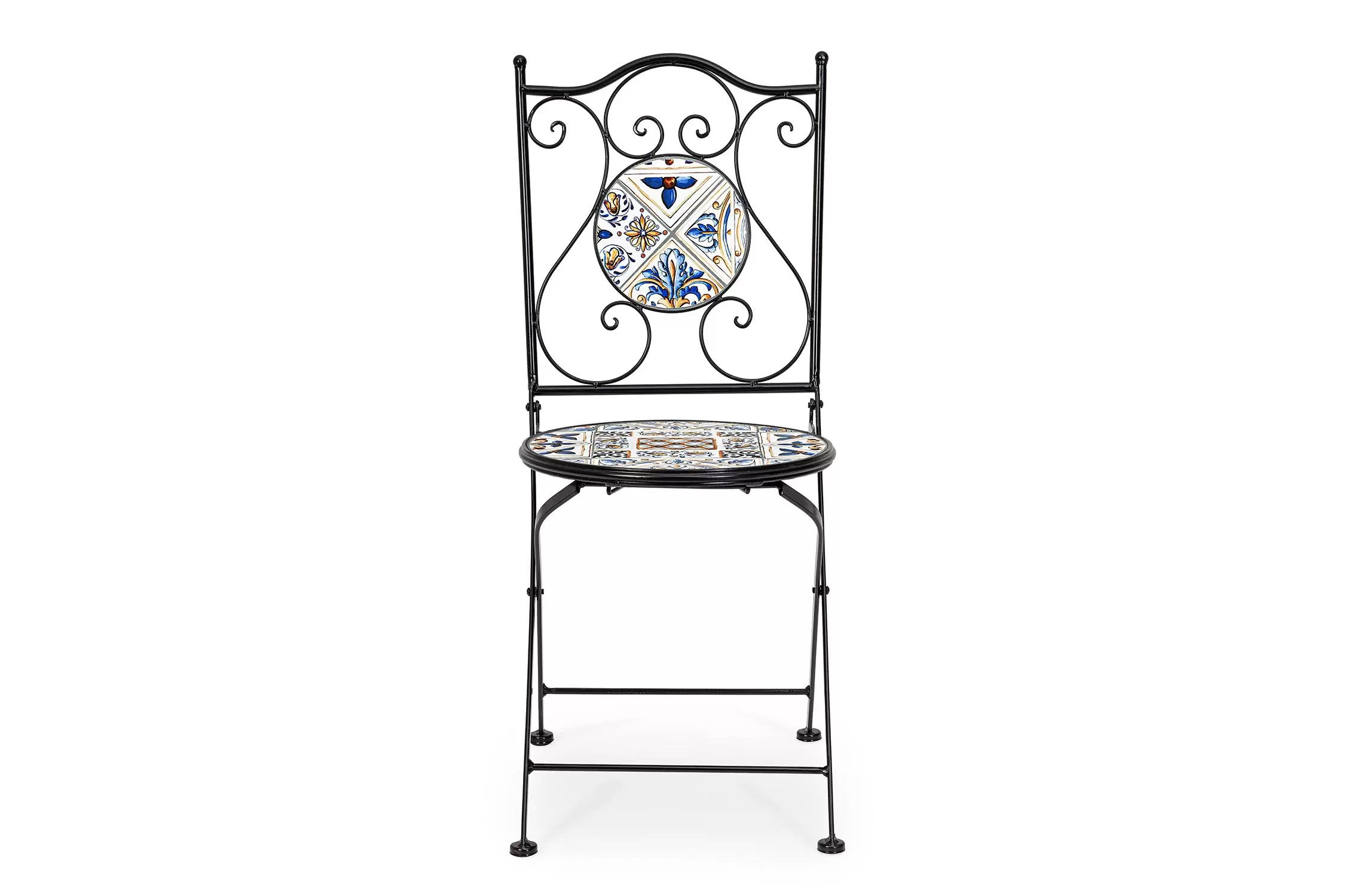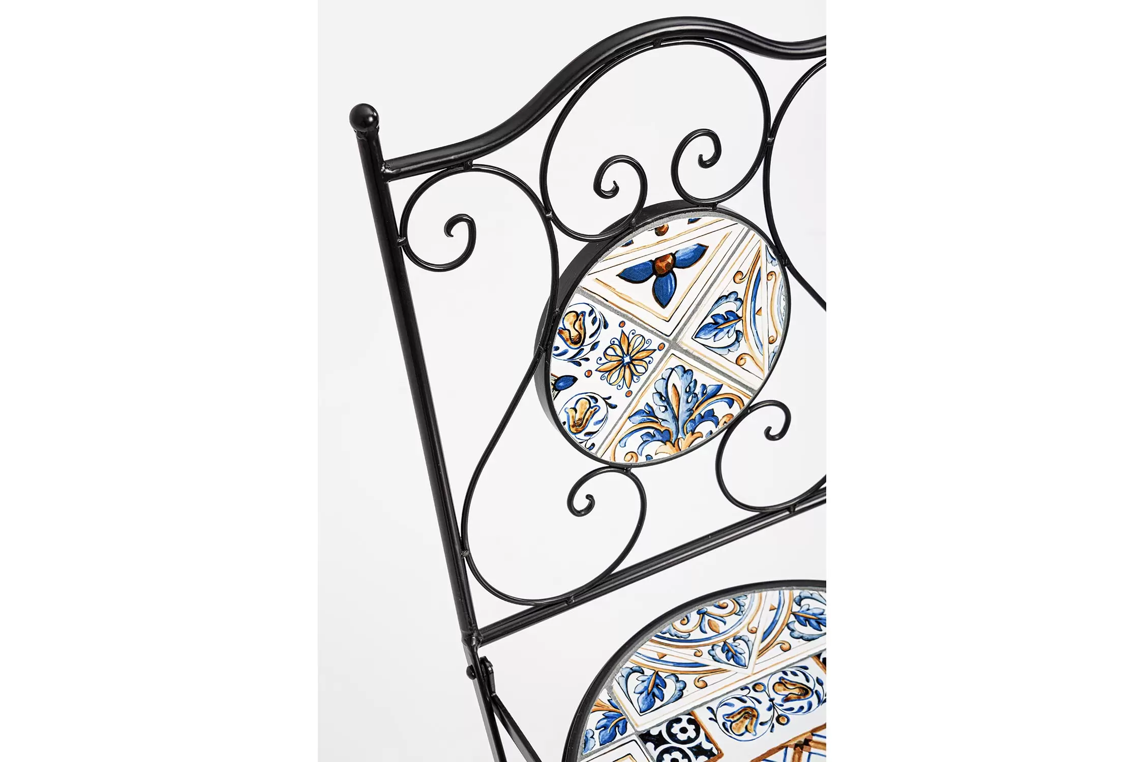 Krzesło stalowe idealne na balkon lub do stylowej kawiarni ze stali malowanej proszkowo. Siedzenie i oparcie ceramiczne w dekoracyjne włoskie wzory.