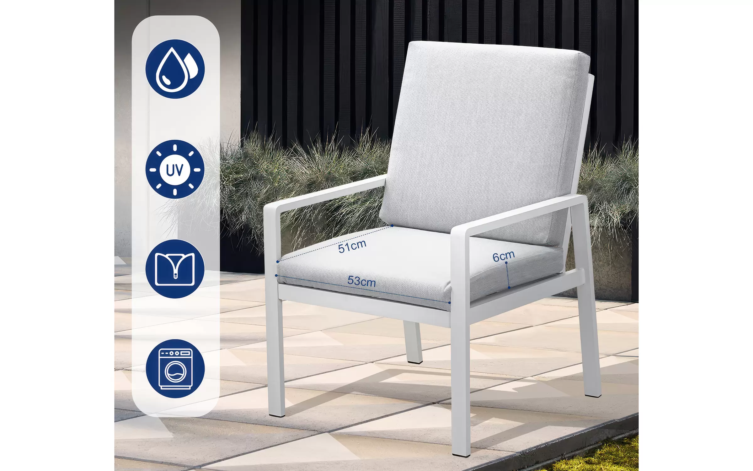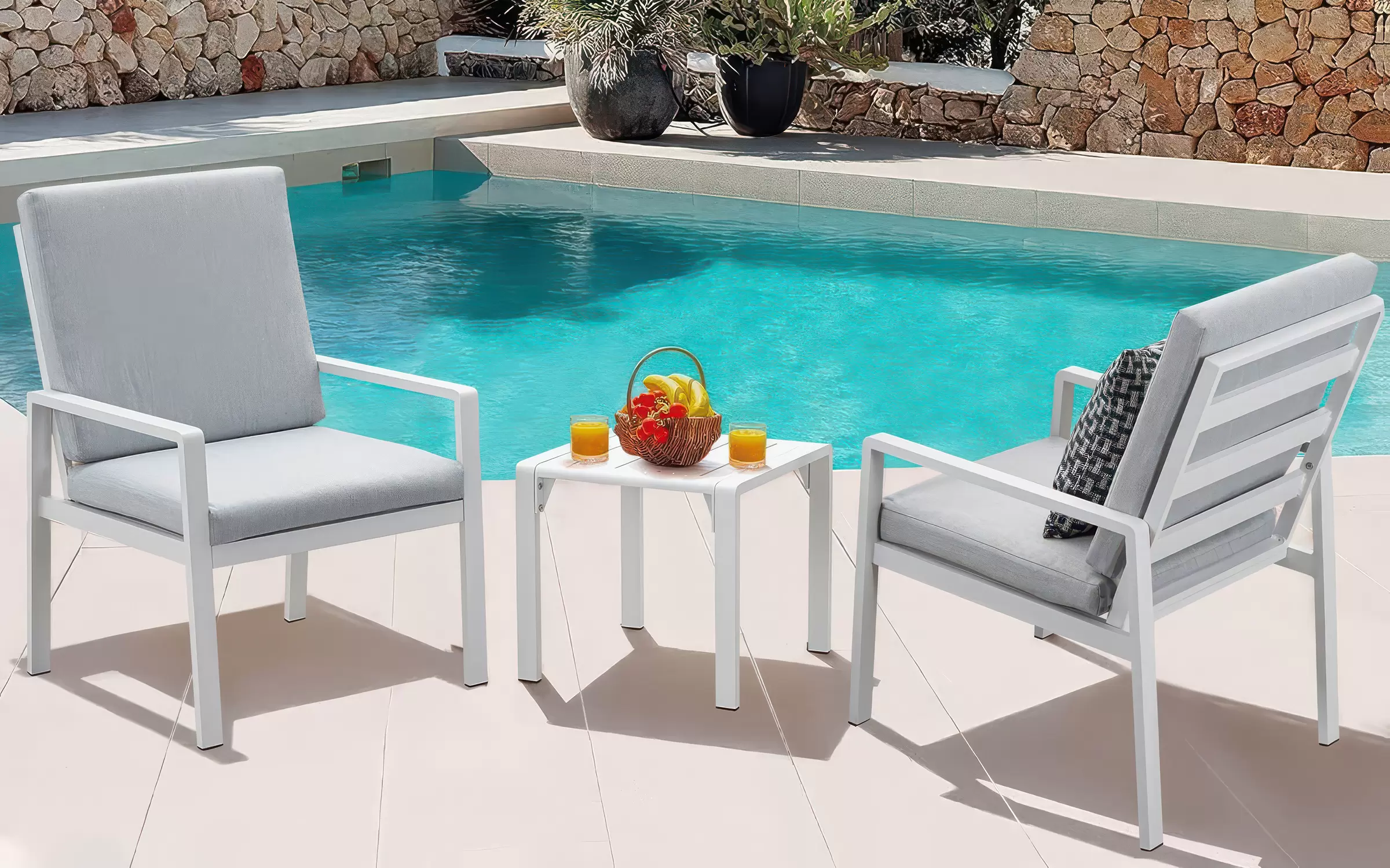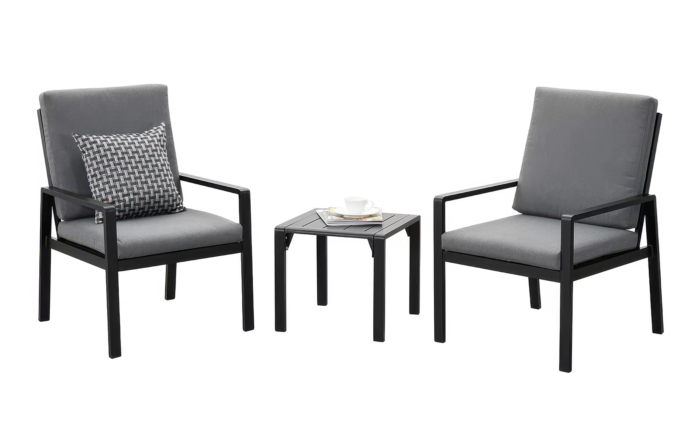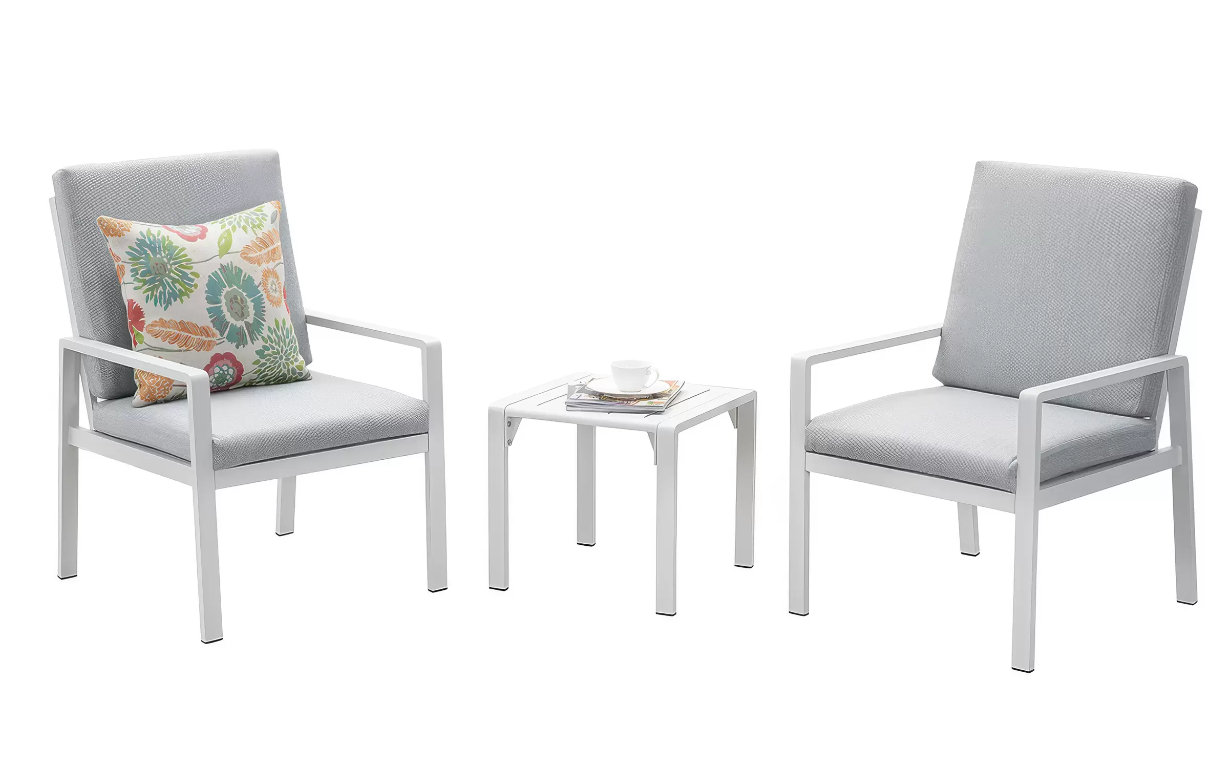 Meble na balkon dla 2 osób wykonany z aluminium. Na fotelach wodoodporne poduszki ze zdejmowanymi poszewkami.