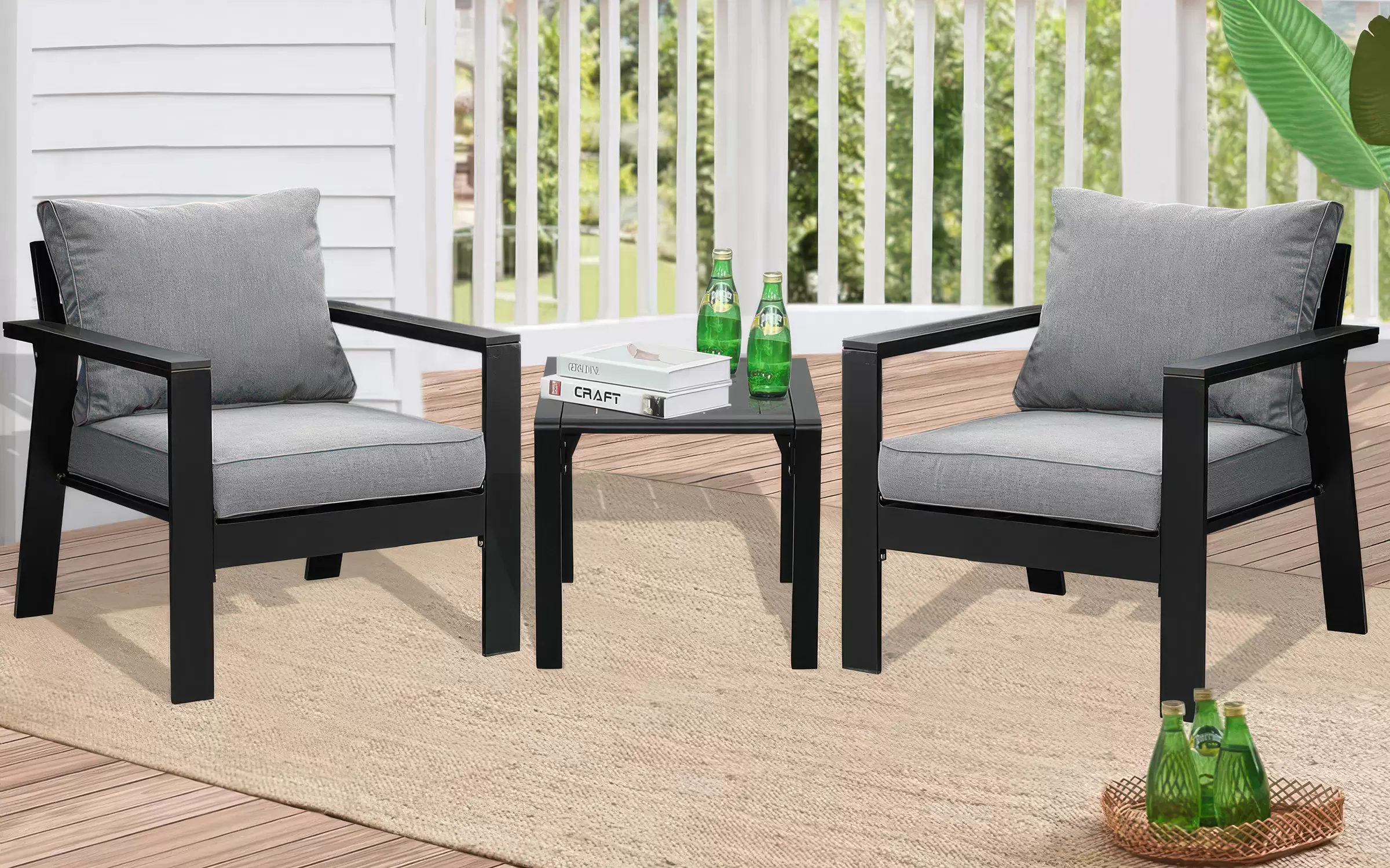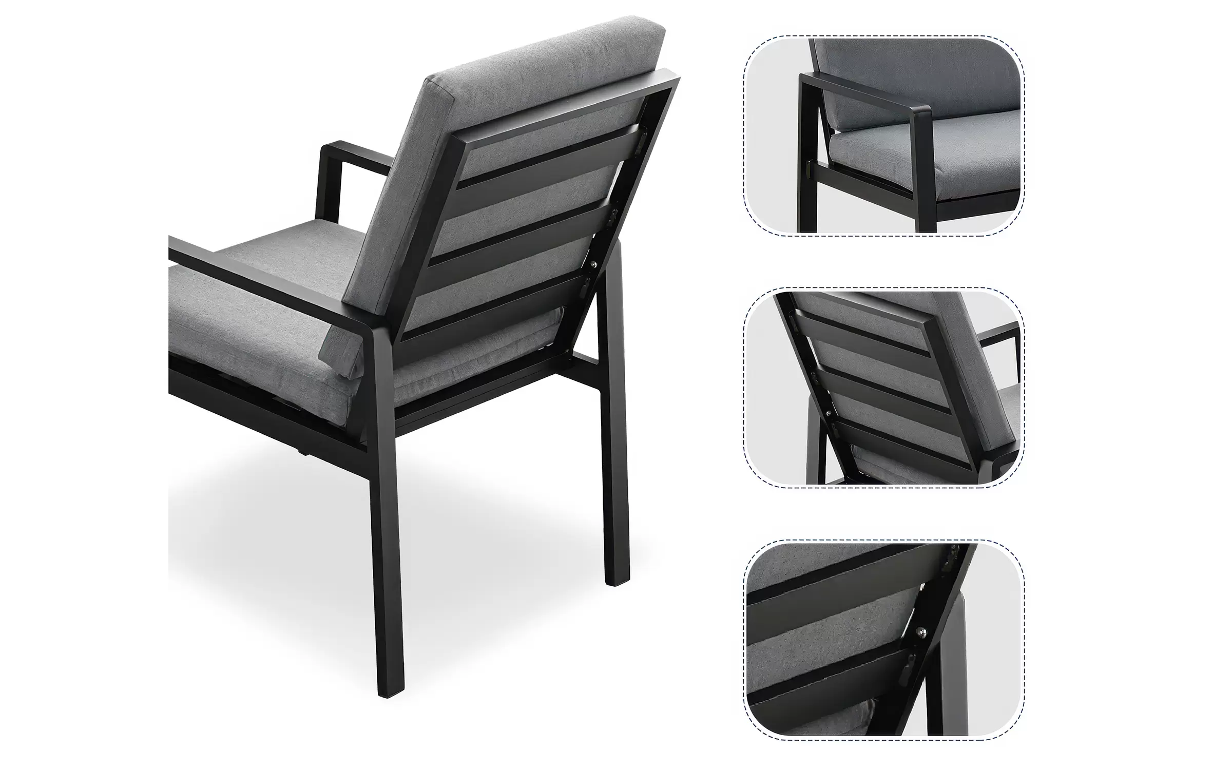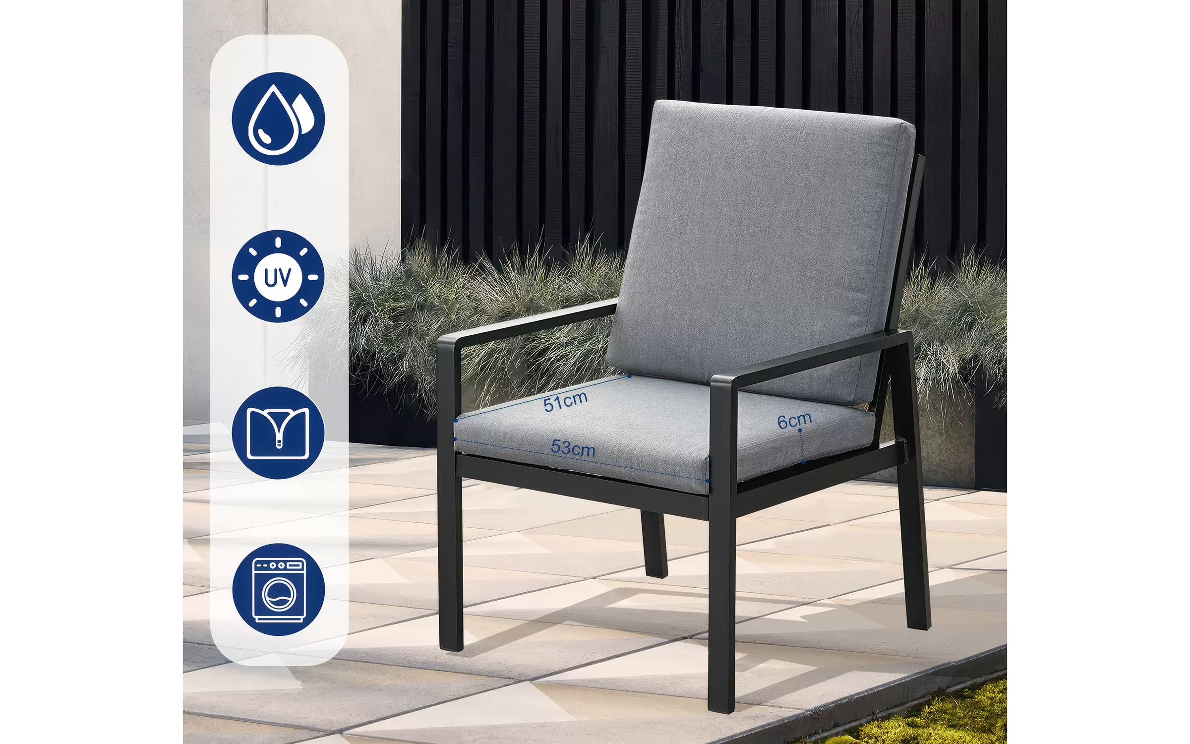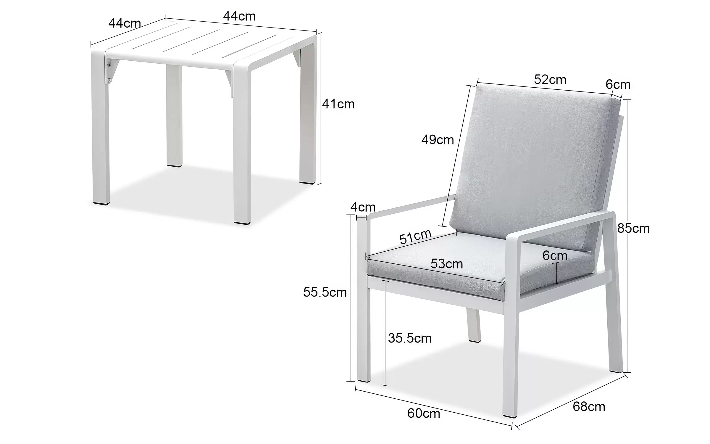 Meble na balkon dla 2 osób wykonany z aluminium. Na fotelach wodoodporne poduszki ze zdejmowanymi poszewkami.