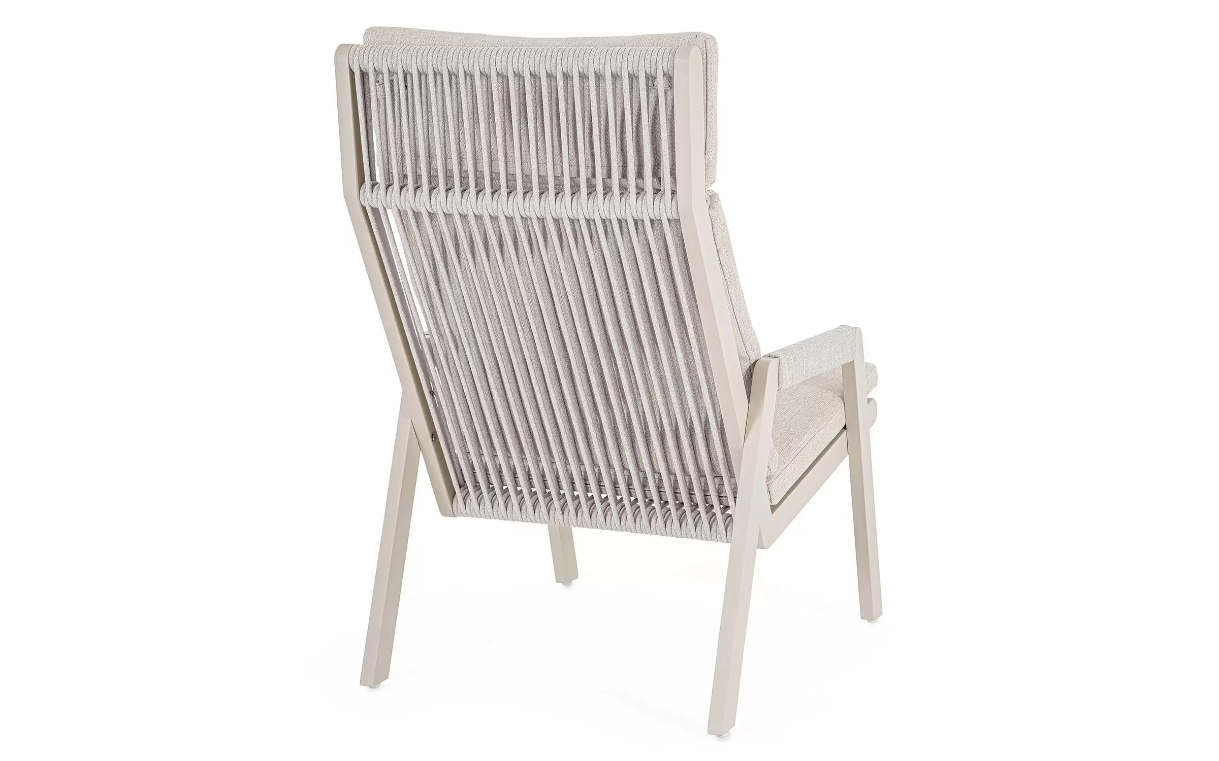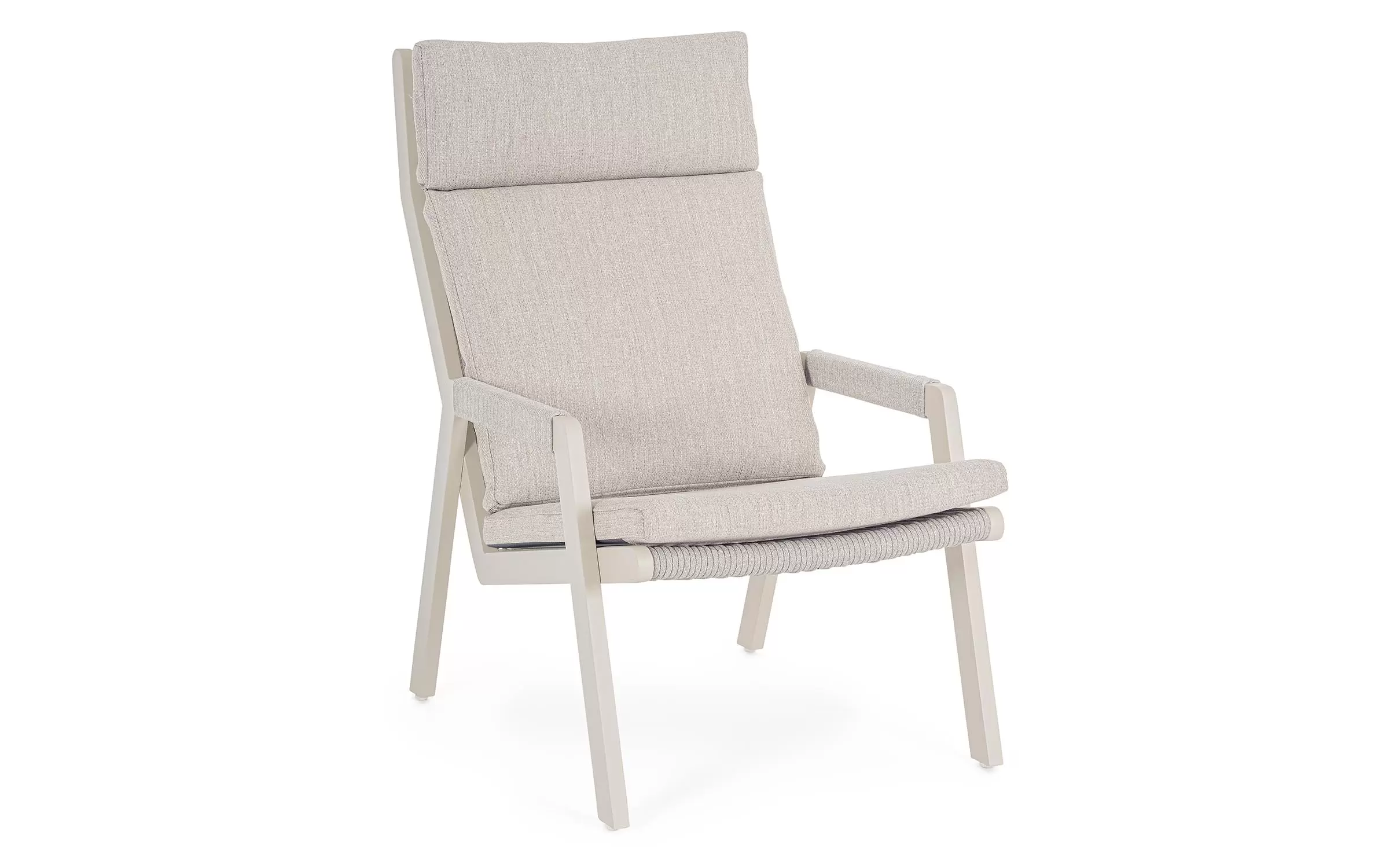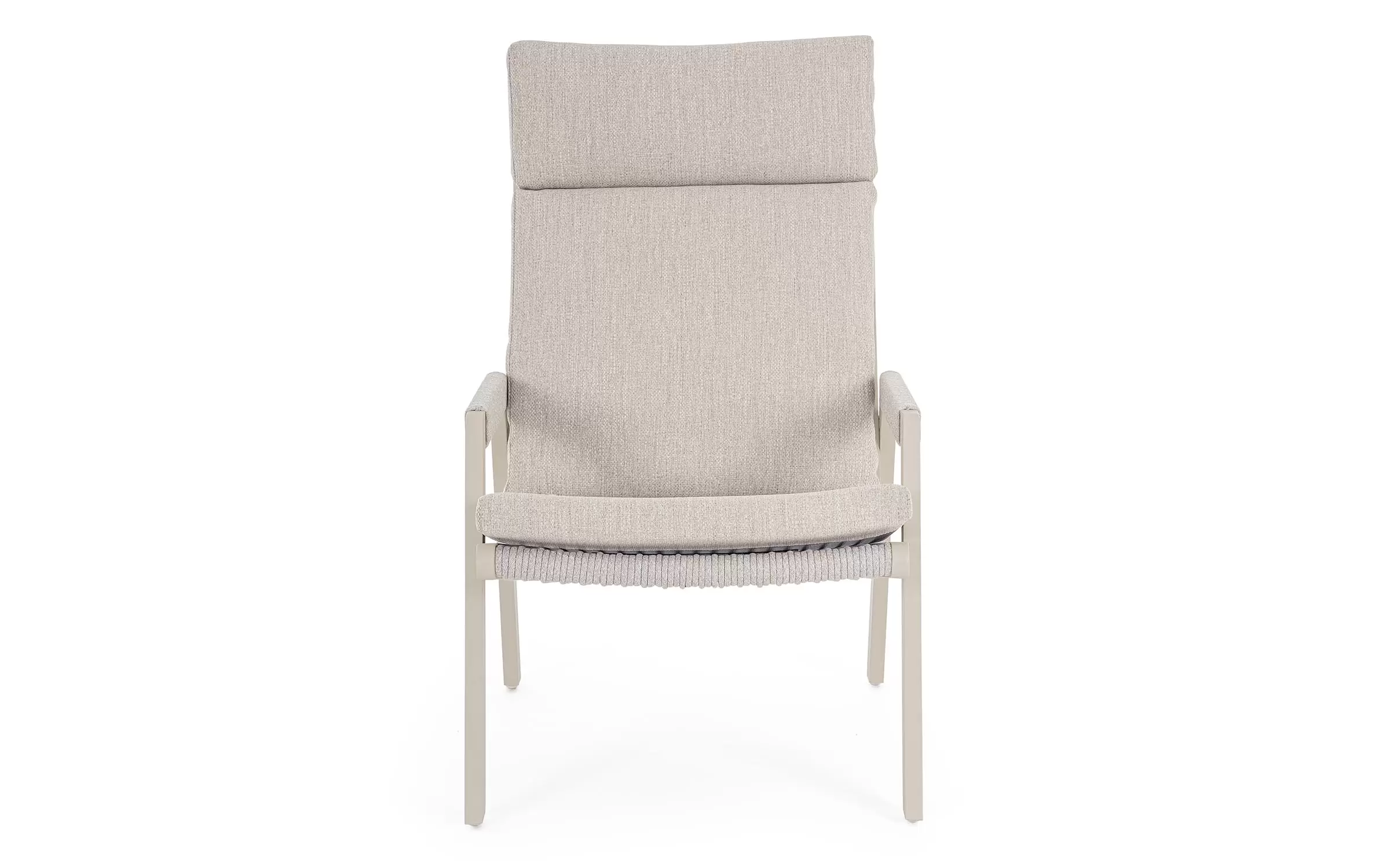 Fotel do wypoczynku na tarasie i w ogrodzie w jasnobeżowym kolorze aluminium z ładną plecionką na siedzeniu, oparciu i podłokietnikach ze sznurka poliestrowego miłego w dotyku.