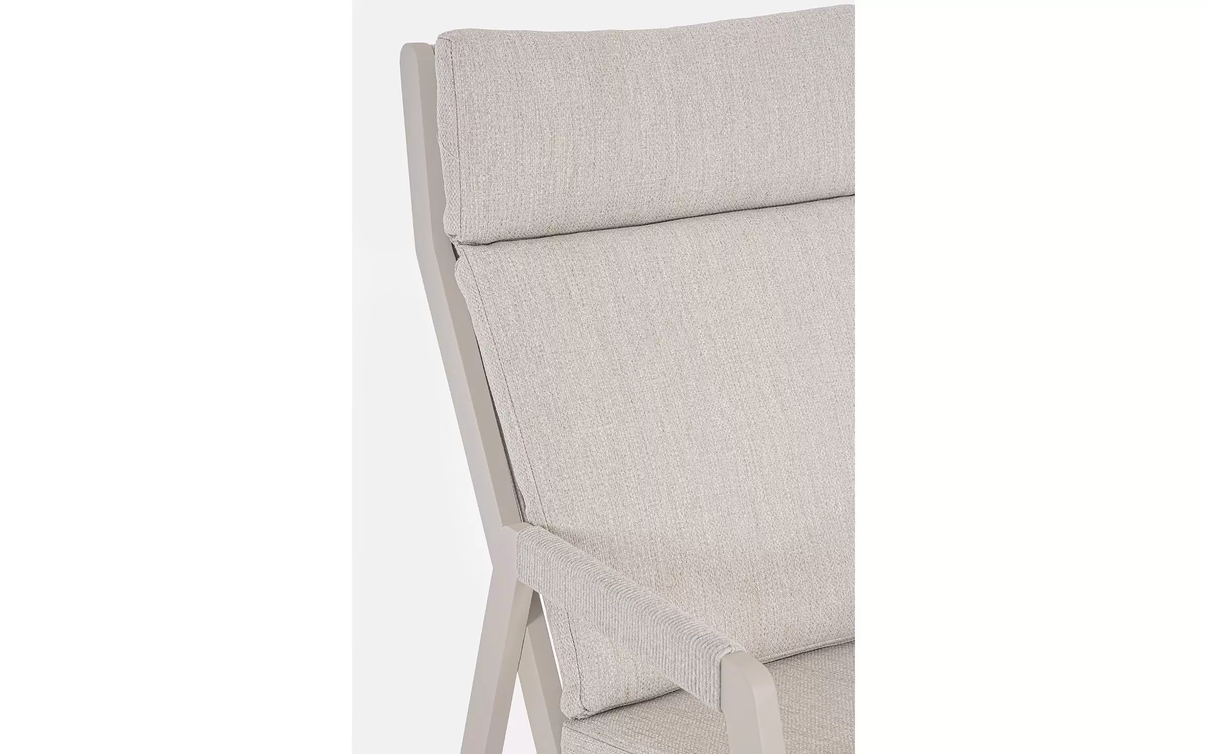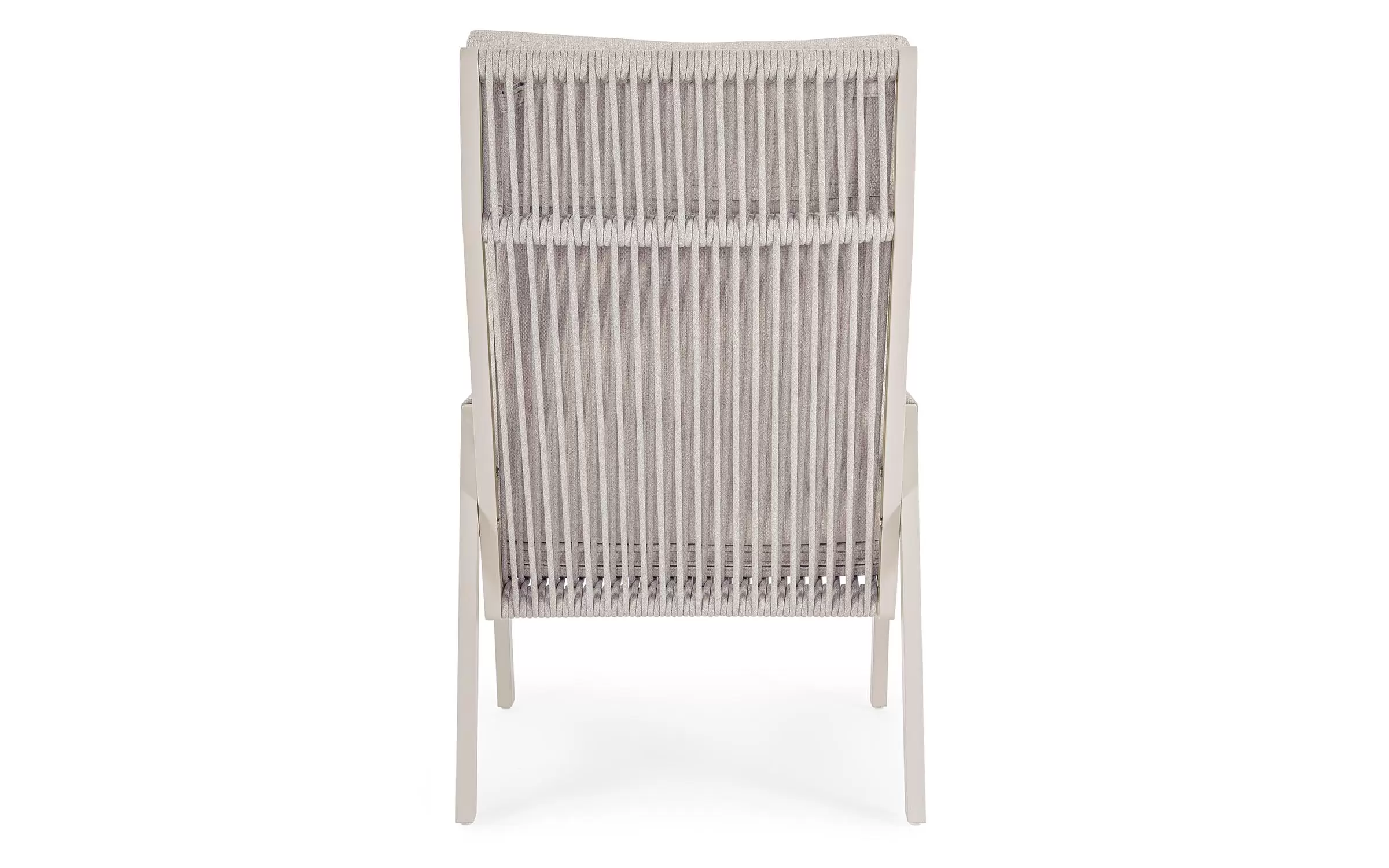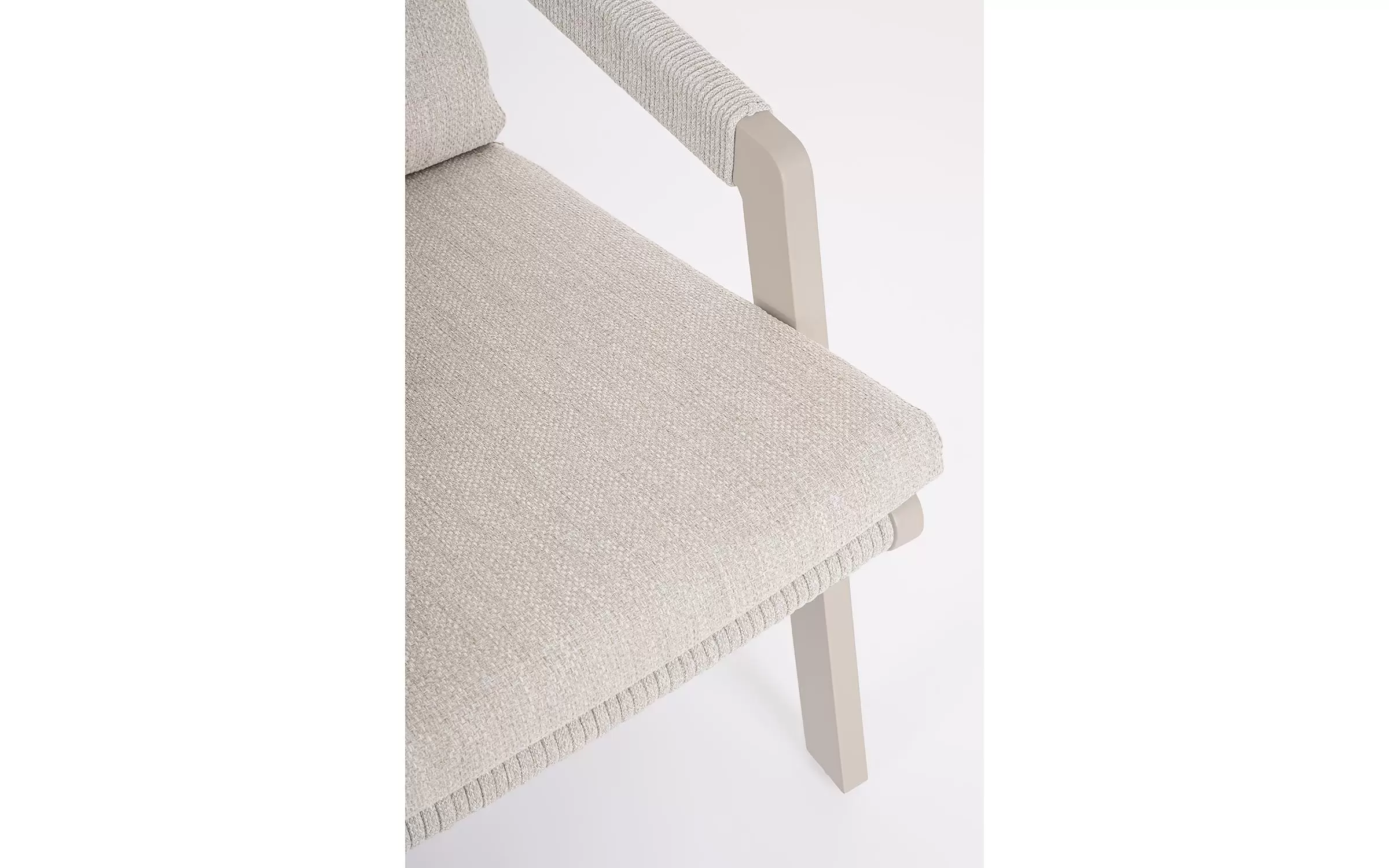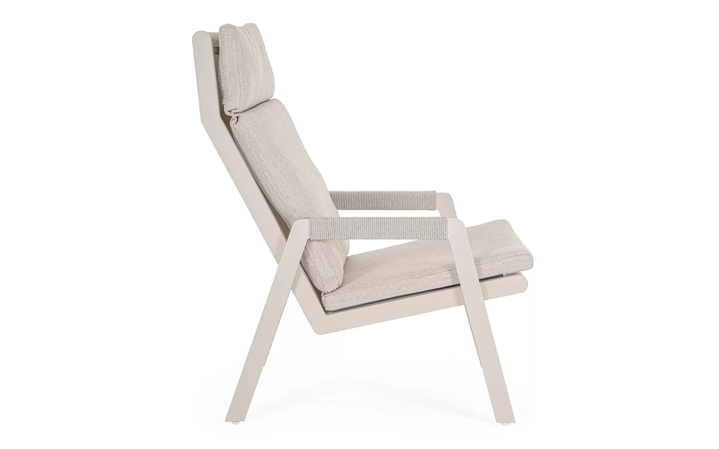 Fotel do wypoczynku na tarasie i w ogrodzie w jasnobeżowym kolorze aluminium z ładną plecionką na siedzeniu, oparciu i podłokietnikach ze sznurka poliestrowego miłego w dotyku.