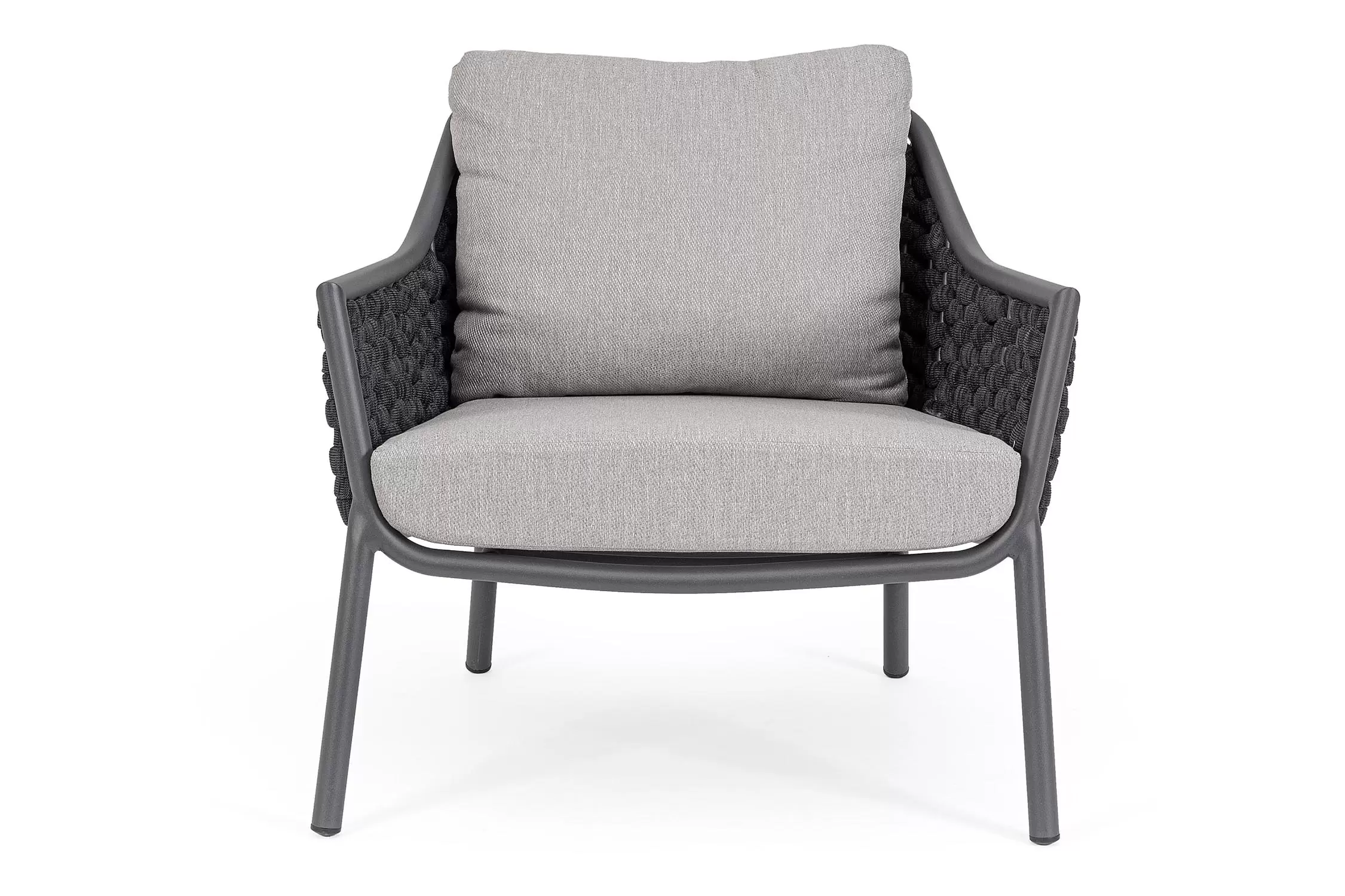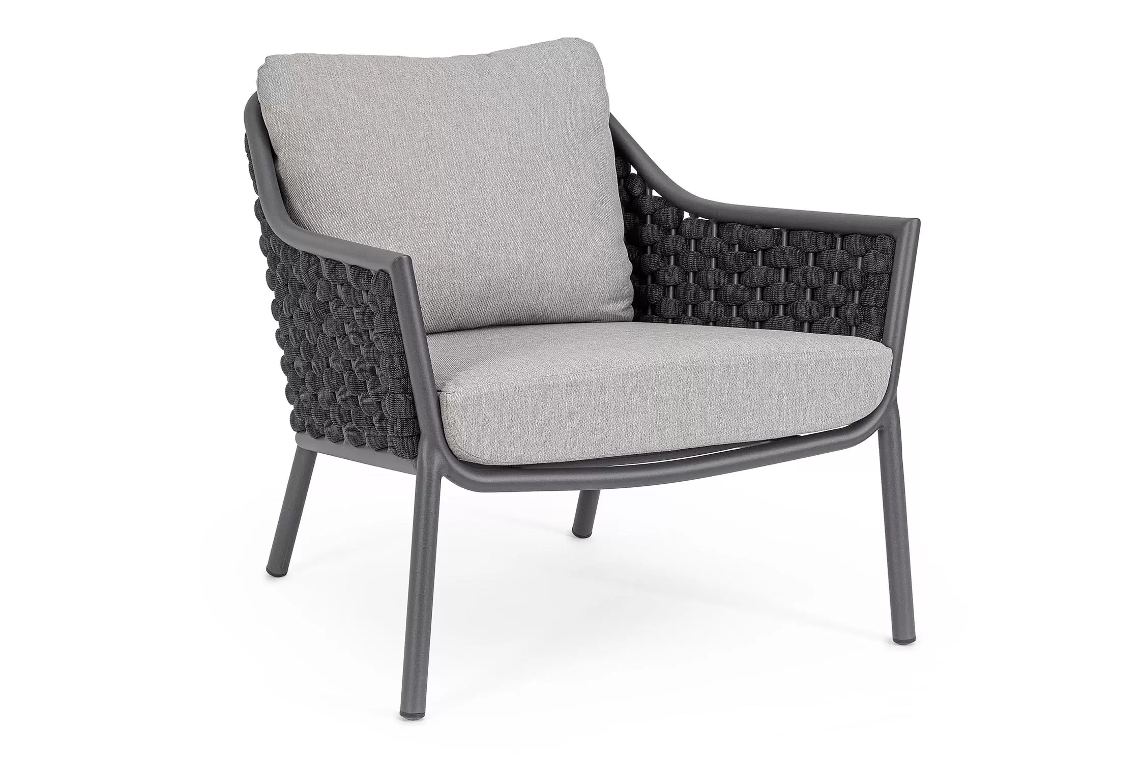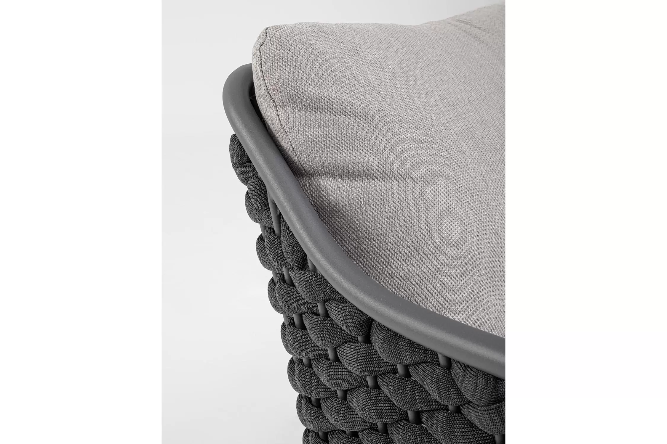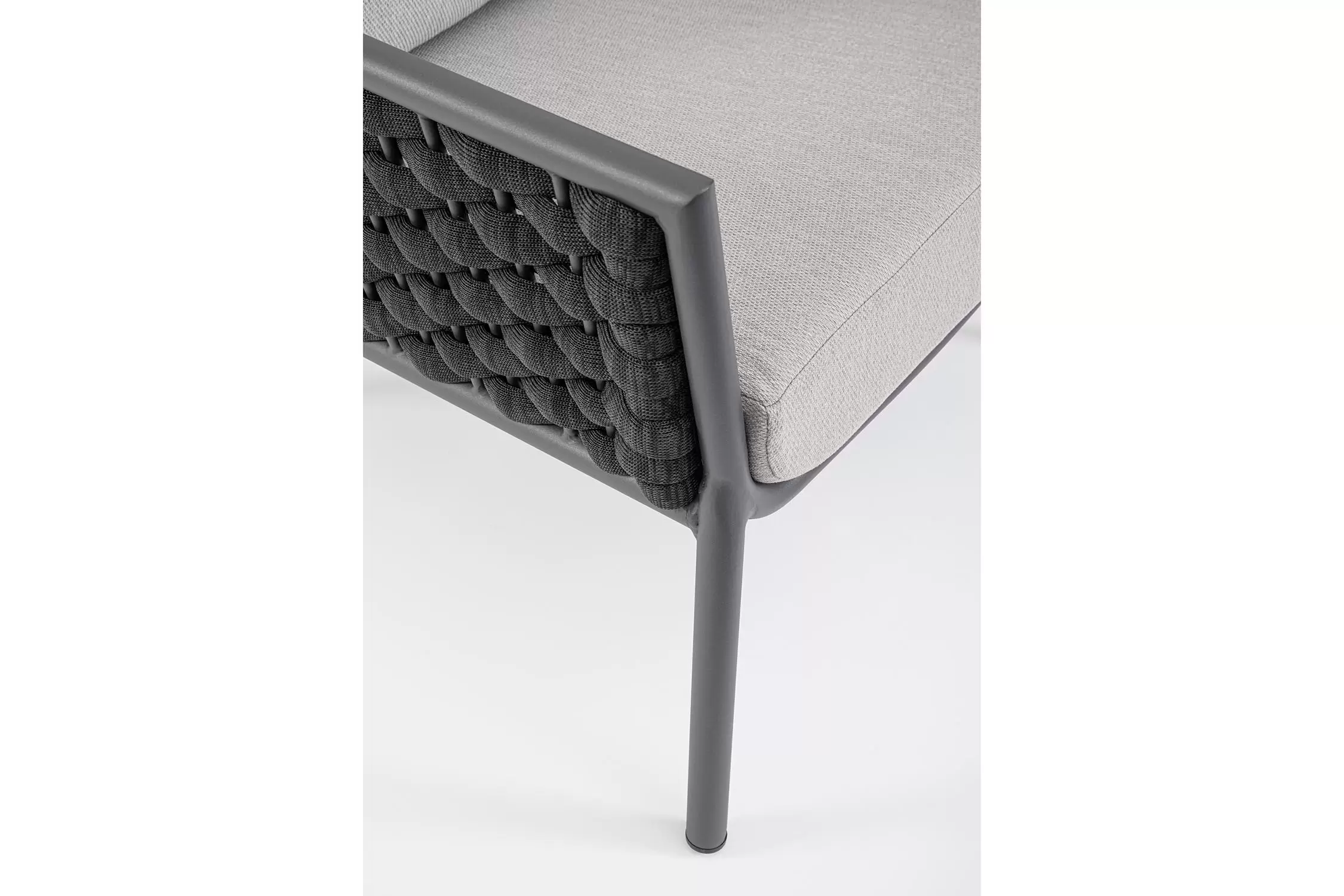 Fotel wypoczynkowy na taras w oryginalnym i co najważniejsze odpornym na warunki atmosferyczne wykonaniu. Okrągły profil podłokietników, wygodne oparcie oraz siedzisko z wygodnymi poduszkami zostało wykonane z wodoodpornej tkaniny Olefin. Materiał, która jest barwioną na wskroś tkaniną akrylową odporną na zabrudzenia, jest również odporna na działanie wody i pleśni. Ciekawą formą urozmaicenia budowy fotela jest zastosowanie warkoczowego splotu po bokach i z tyłu stelaża. Stelaż sofy, a także nogi wykonano z aluminium w malowaniu proszkowym. Wypełnienie poduszek z wysokiej jakości szybkoschnącej pianki tapicerskiej Quick Dry Foam o właściwościach antybakteryjnych. Wytrzymałość materiałów, a także odporność na korozję, umożliwiają zastosowanie zarówno w domu jak i na zewnątrz - w ogrodzie lub na tarasie. Meble należy czyścić nie wykorzystując silnych środków chemicznych.