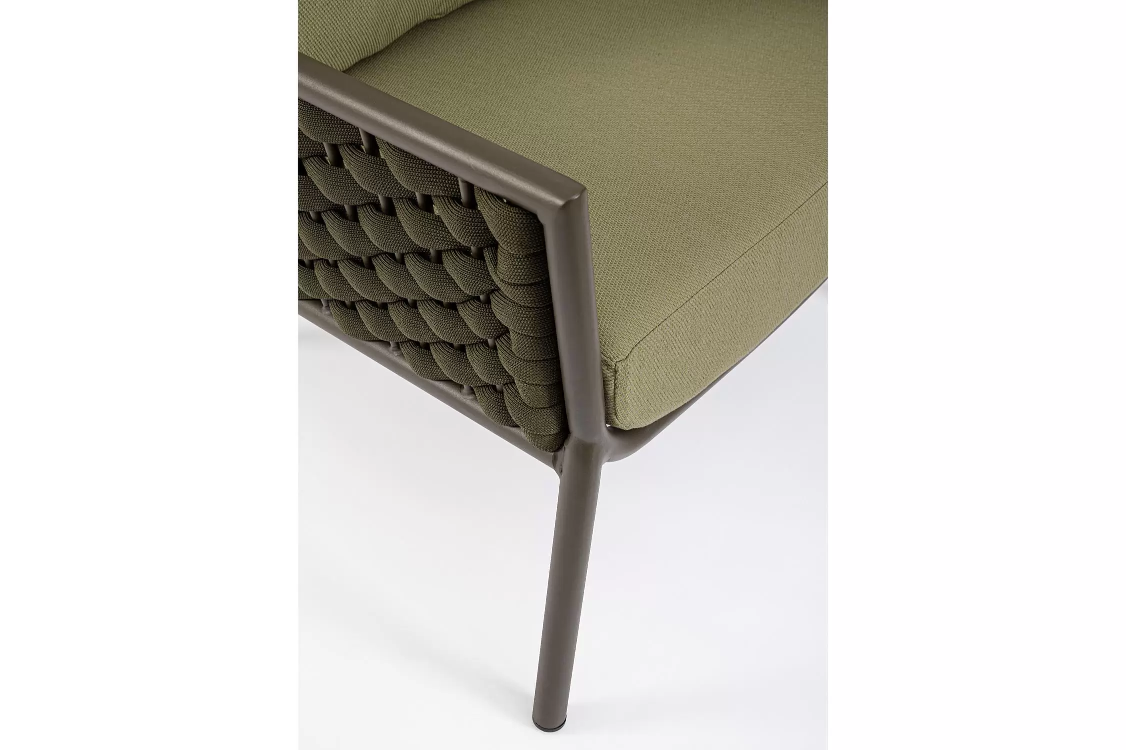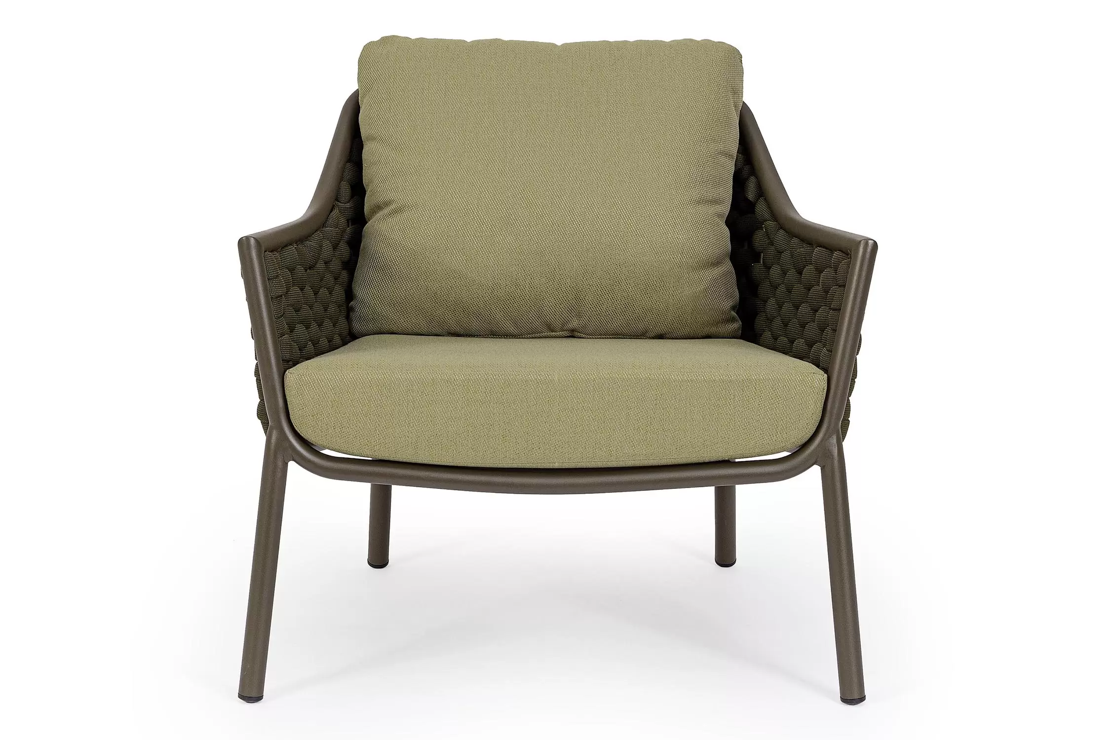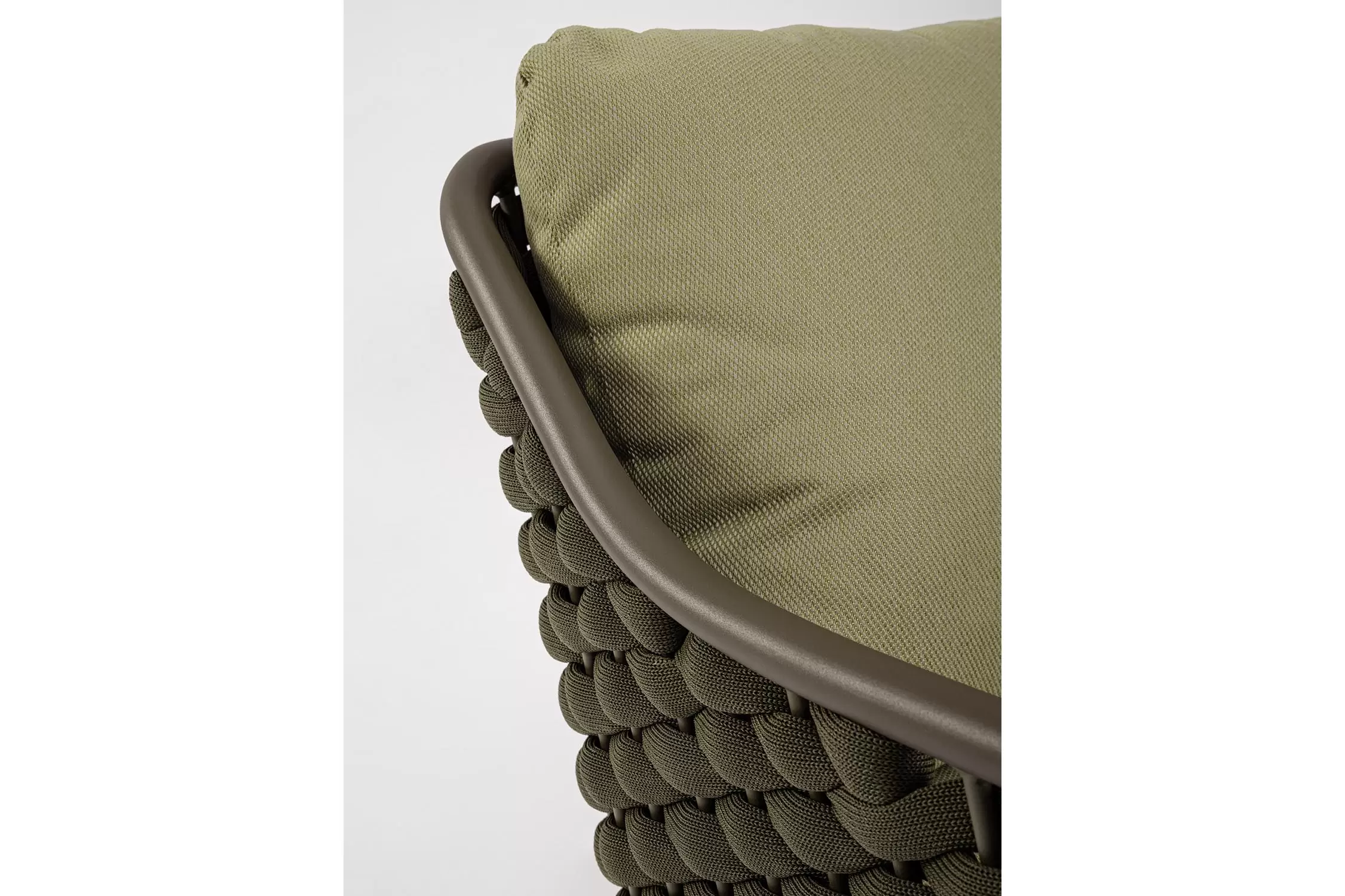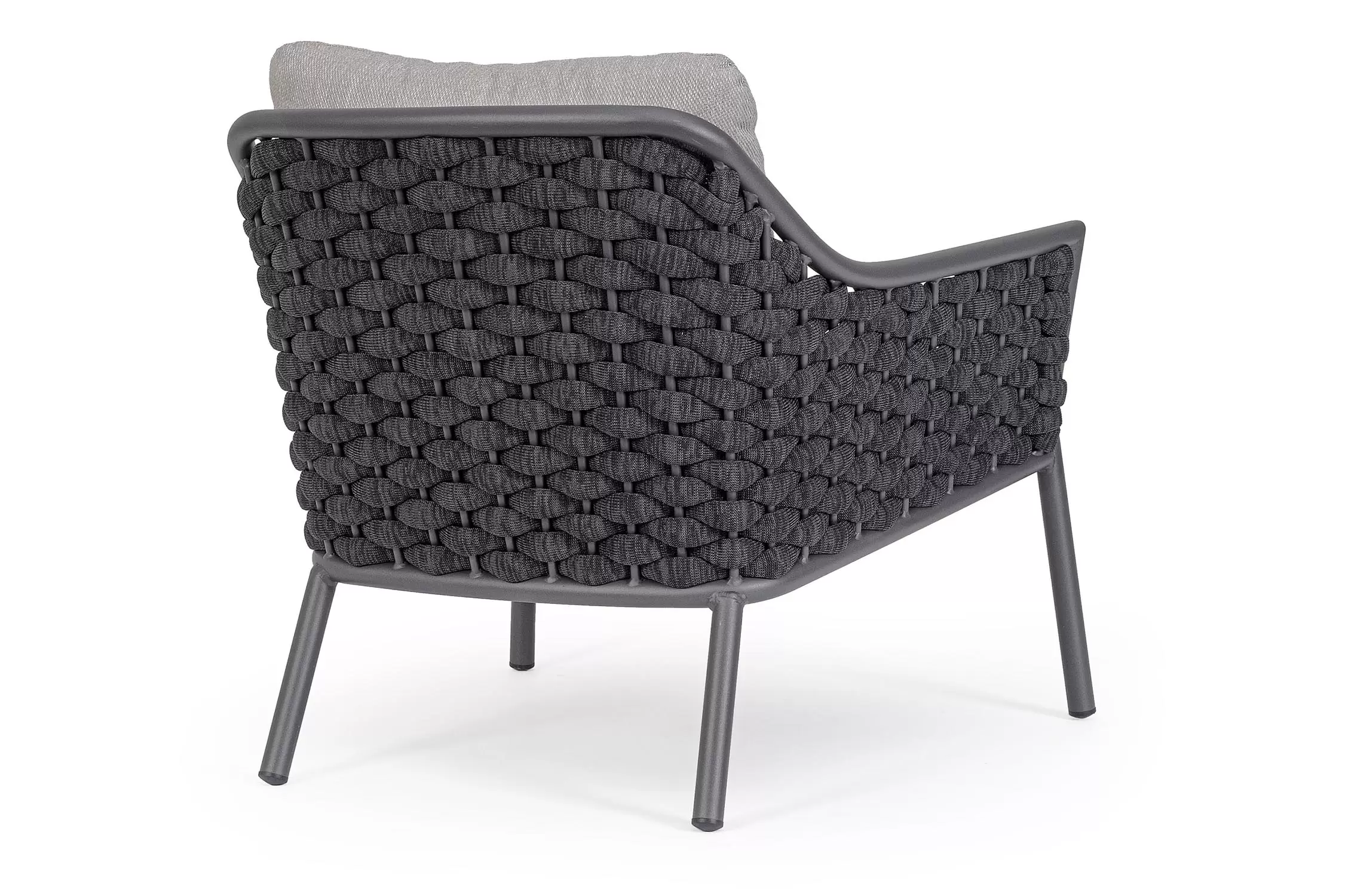 Fotel wypoczynkowy na taras w oryginalnym i co najważniejsze odpornym na warunki atmosferyczne wykonaniu. Okrągły profil podłokietników, wygodne oparcie oraz siedzisko z wygodnymi poduszkami zostało wykonane z wodoodpornej tkaniny Olefin. Materiał, która jest barwioną na wskroś tkaniną akrylową odporną na zabrudzenia, jest również odporna na działanie wody i pleśni. Ciekawą formą urozmaicenia budowy fotela jest zastosowanie warkoczowego splotu po bokach i z tyłu stelaża. Stelaż sofy, a także nogi wykonano z aluminium w malowaniu proszkowym. Wypełnienie poduszek z wysokiej jakości szybkoschnącej pianki tapicerskiej Quick Dry Foam o właściwościach antybakteryjnych. Wytrzymałość materiałów, a także odporność na korozję, umożliwiają zastosowanie zarówno w domu jak i na zewnątrz - w ogrodzie lub na tarasie. Meble należy czyścić nie wykorzystując silnych środków chemicznych.
