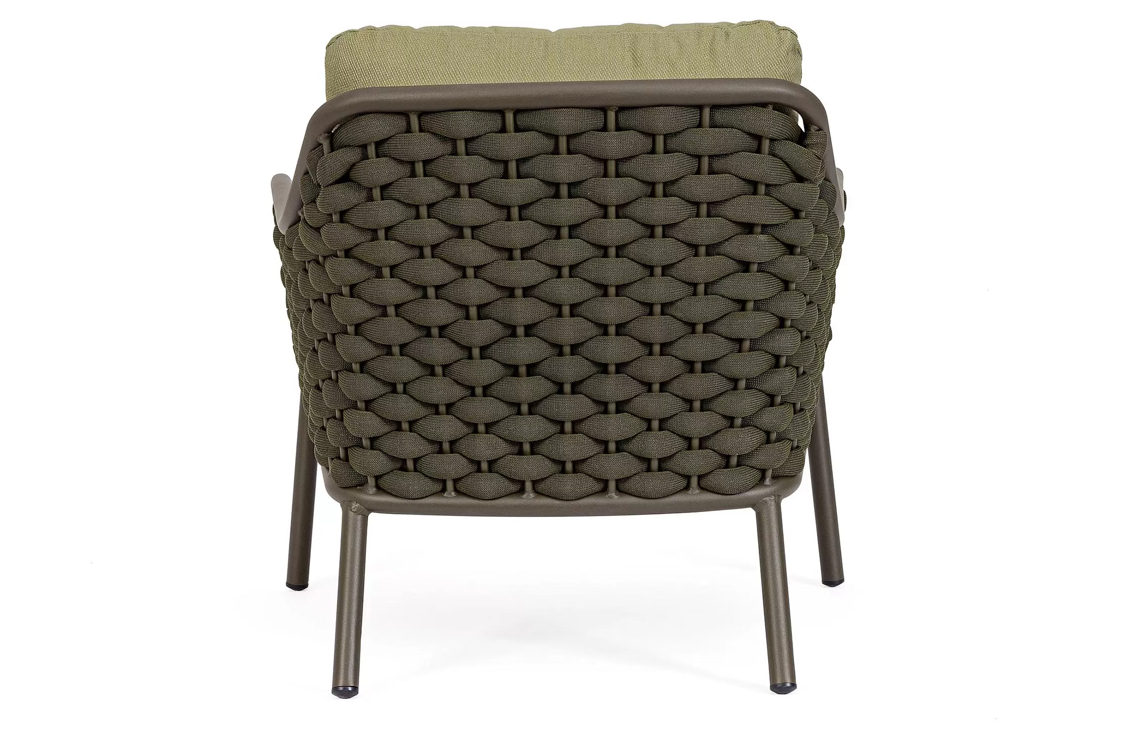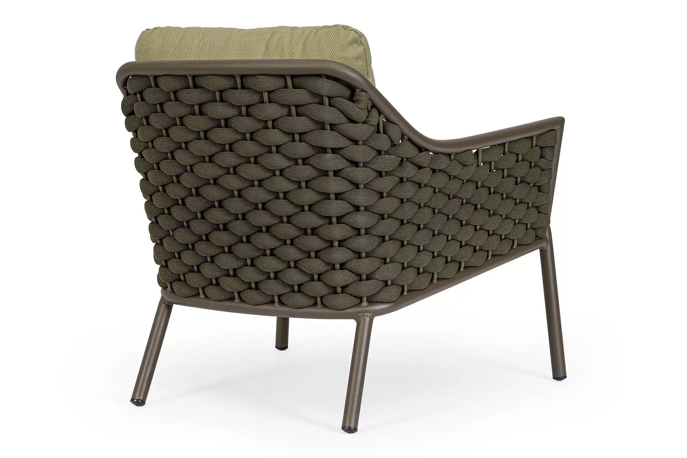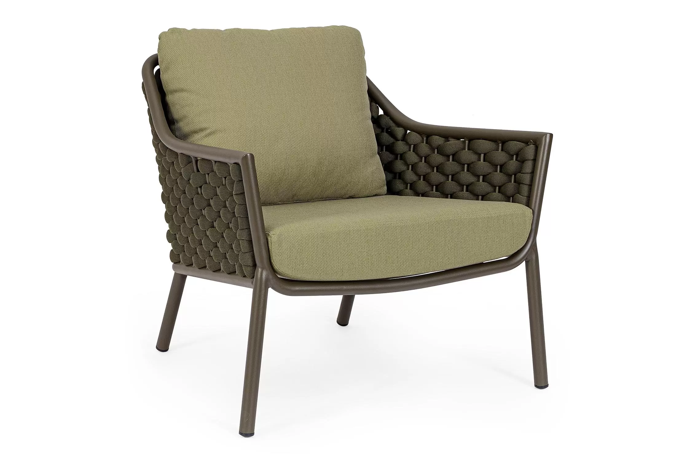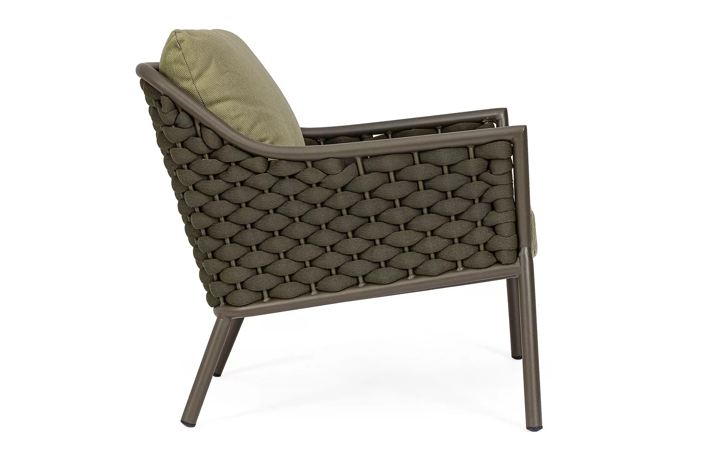 Fotel wypoczynkowy na taras w oryginalnym i co najważniejsze odpornym na warunki atmosferyczne wykonaniu. Okrągły profil podłokietników, wygodne oparcie oraz siedzisko z wygodnymi poduszkami zostało wykonane z wodoodpornej tkaniny Olefin. Materiał, która jest barwioną na wskroś tkaniną akrylową odporną na zabrudzenia, jest również odporna na działanie wody i pleśni. Ciekawą formą urozmaicenia budowy fotela jest zastosowanie warkoczowego splotu po bokach i z tyłu stelaża. Stelaż sofy, a także nogi wykonano z aluminium w malowaniu proszkowym. Wypełnienie poduszek z wysokiej jakości szybkoschnącej pianki tapicerskiej Quick Dry Foam o właściwościach antybakteryjnych. Wytrzymałość materiałów, a także odporność na korozję, umożliwiają zastosowanie zarówno w domu jak i na zewnątrz - w ogrodzie lub na tarasie. Meble należy czyścić nie wykorzystując silnych środków chemicznych.