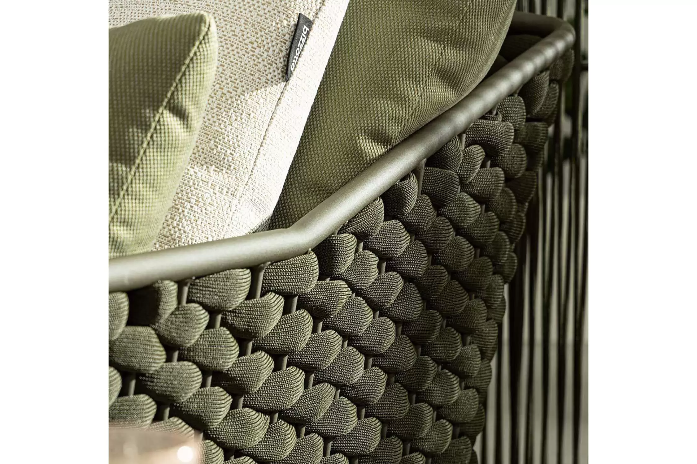 Boki i oparcie oplecione liną przyjemną w dotyku z wyplenieniem z polietylenu.