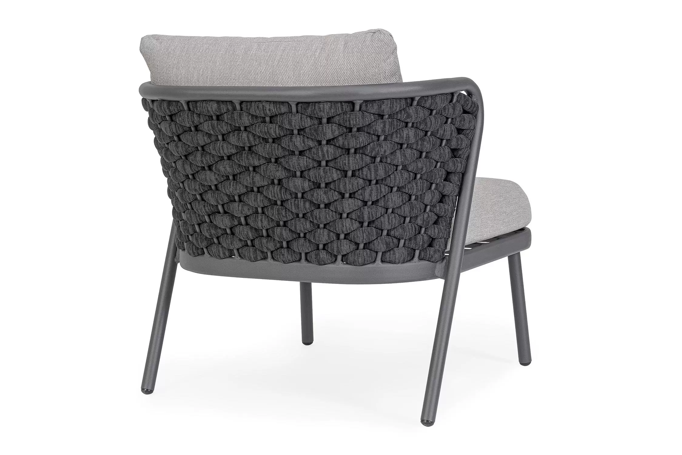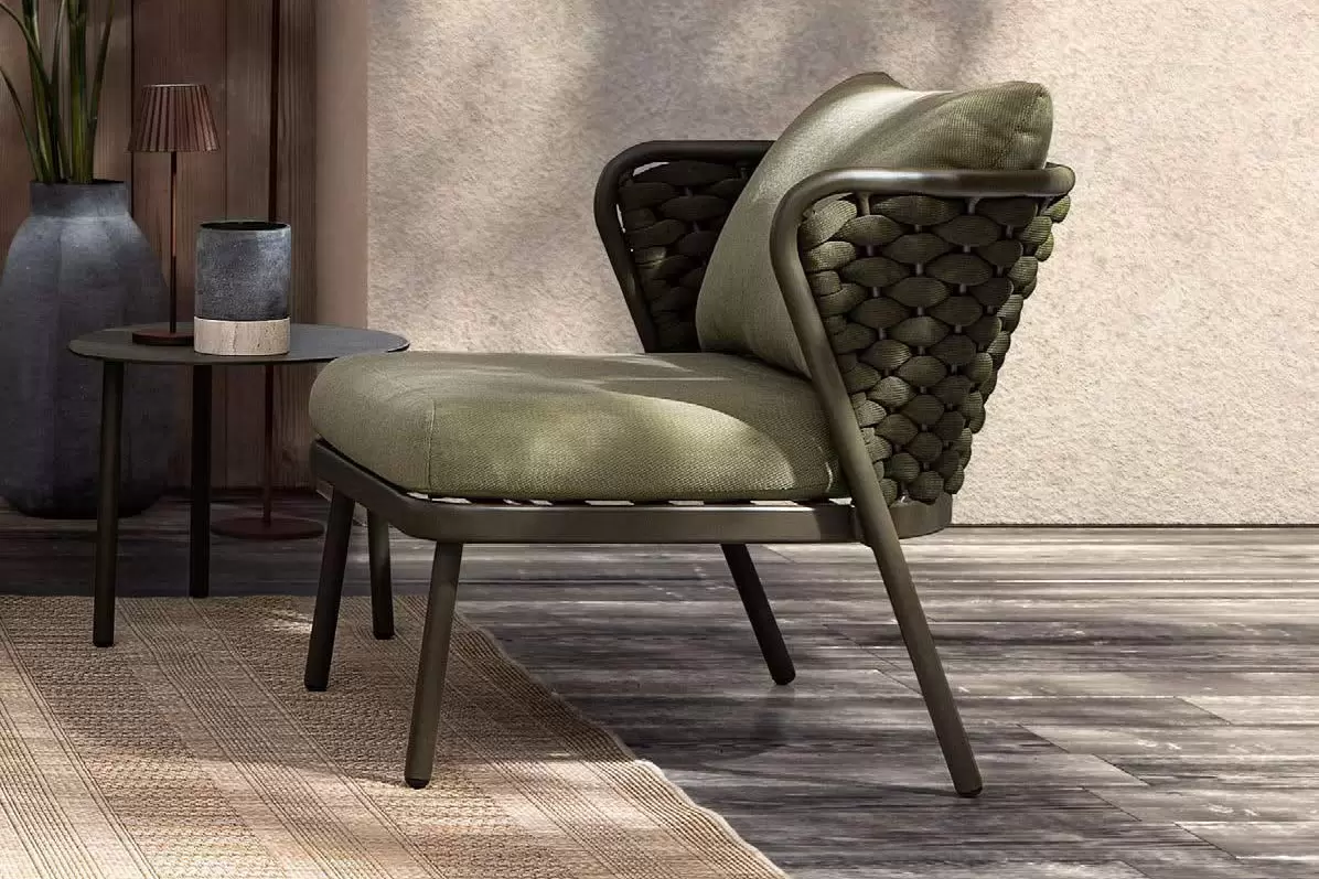 Fotel wypoczynkowy na taras w oryginalnym i co najważniejsze odpornym na warunki atmosferyczne wykonaniu. Delikatnie wygięte "skrzydełka', wygodne oparcie oraz siedzisko z wygodnymi poduszkami wykonanymi z wodoodpornej tkaniny Olefin. Materiał, która jest barwioną na wskroś tkaniną akrylową odporną na zabrudzenia, jest również odporna na działanie wody i pleśni. Ciekawą formą urozmaicenia budowy sofy jest zastosowanie warkoczowego splotu po bokach i z tyłu stelaża. Stelaż sofy, a także nogi wykonano z aluminium w malowaniu proszkowym. Wypełnienie poduszek z wysokiej jakości szybkoschnącej pianki tapicerskiej Quick Dry Foam o właściwościach antybakteryjnych. Wytrzymałość materiałów, a także odporność na korozję, umożliwiają zastosowanie zarówno w domu jak i na zewnątrz - w ogrodzie lub na tarasie. Meble należy czyścić nie wykorzystując silnych środków chemicznych.