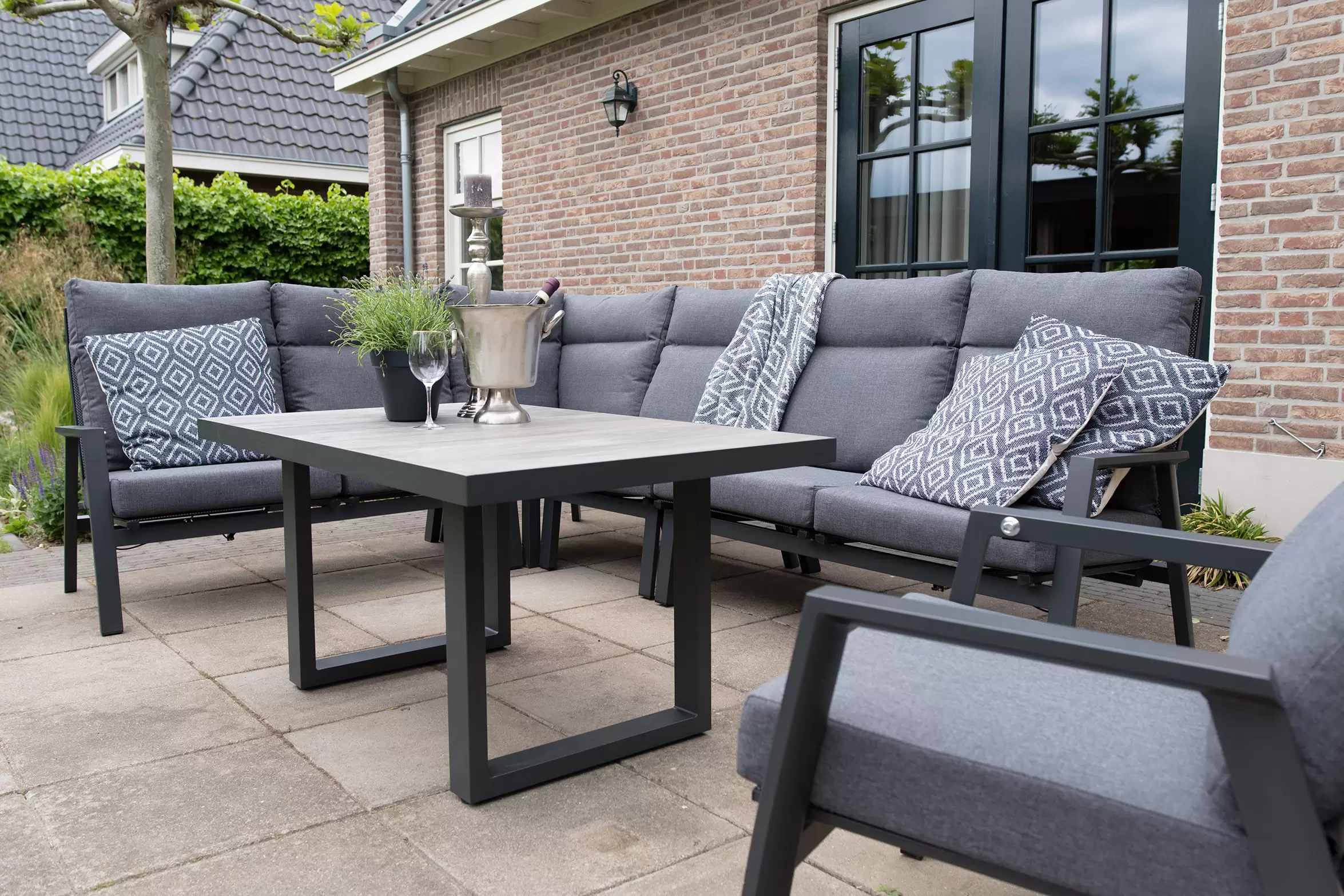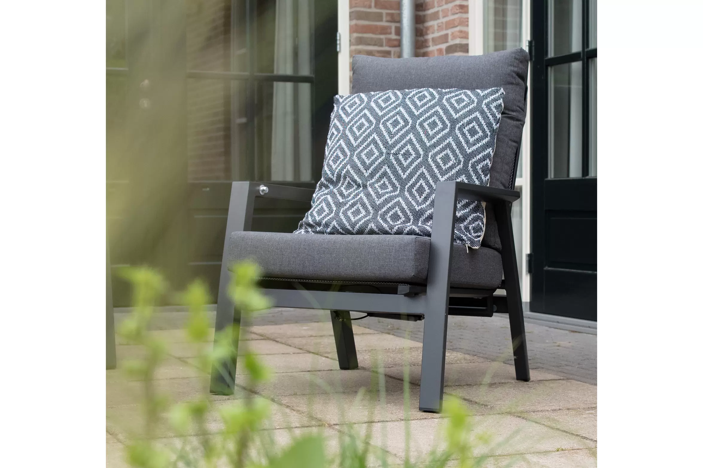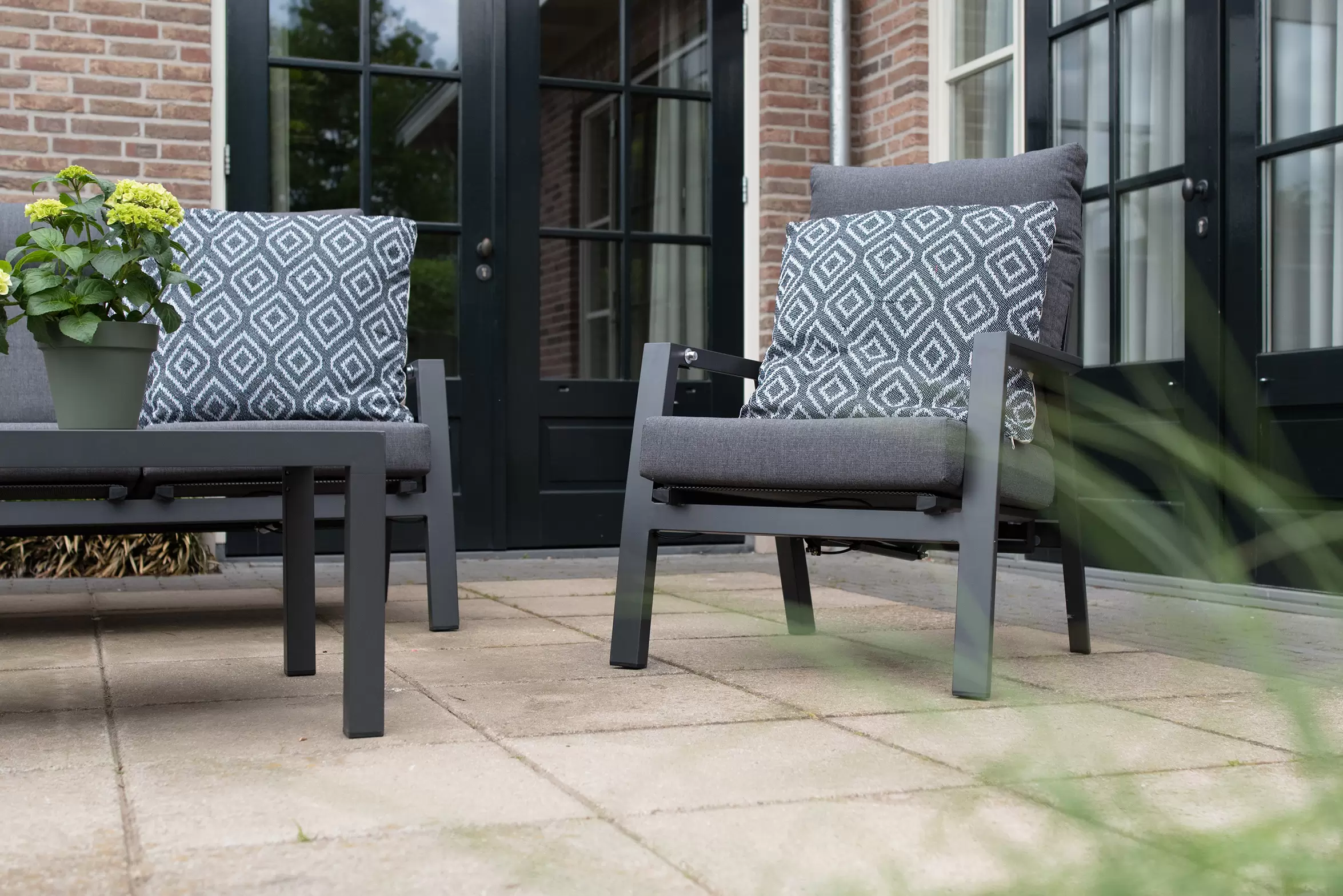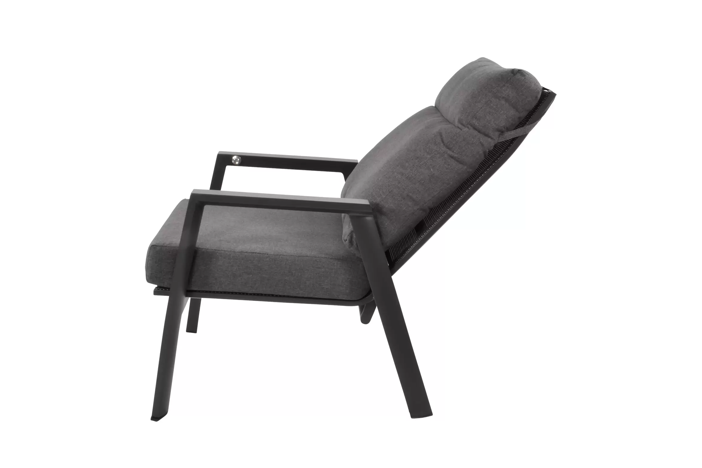Kolekcja modułowych mebli ogrodowych aluminiowych w kolorze ciemnoszarym OHIO z wysokimi i pochylanymi(!) oparciami.