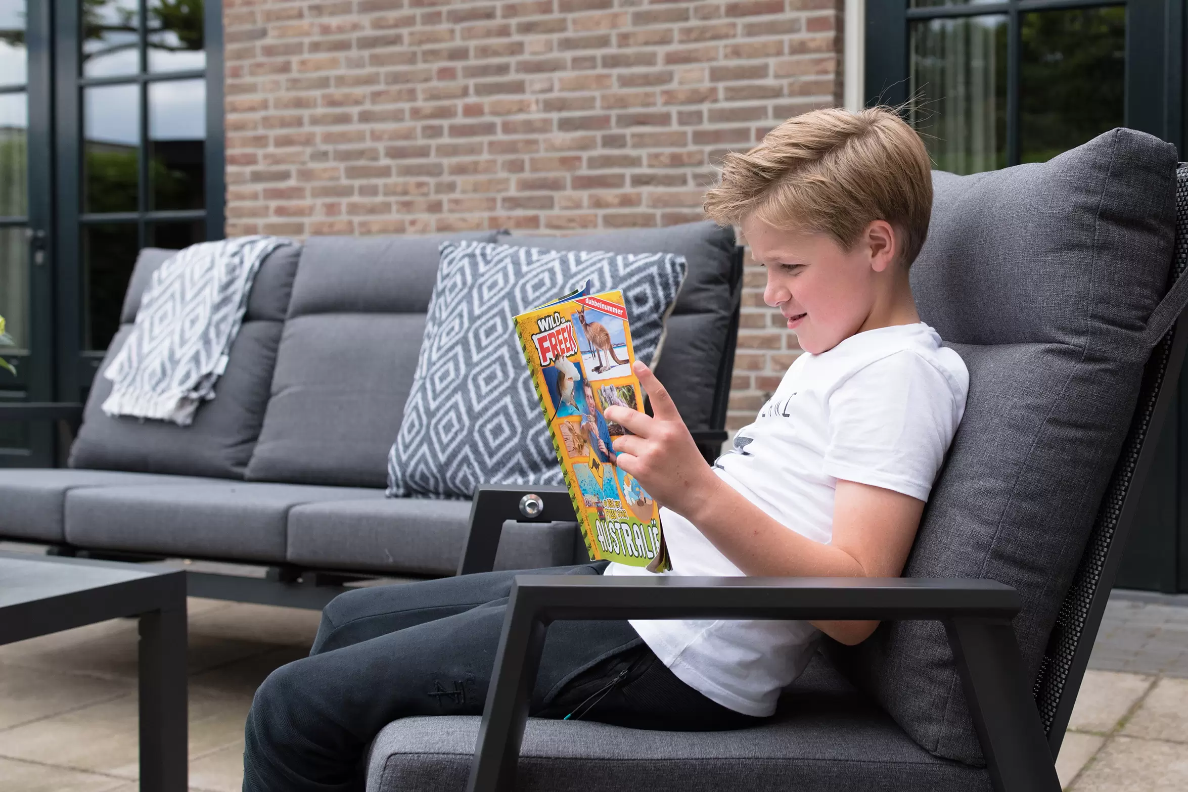 Aluminiowa konstrukcja malowana proszkowo w kolorze ciemnoszarym. Na siedzisku i oparciu pod poduszkami gęsta tekstylina.