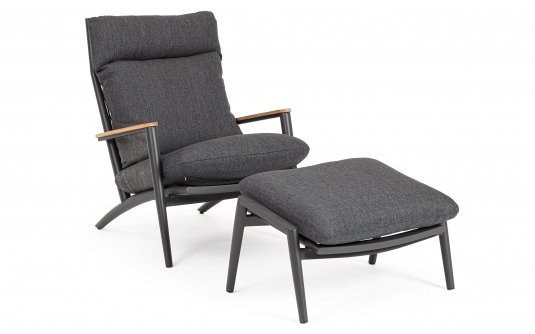 Wysoki fotel ogrodowy z pochylanym oparciem ogrodowy ciemnoszary aluminiowy oraz psujący do niego podnóżek / grube poduszki wodoodporne z poszewkami Olefin szare