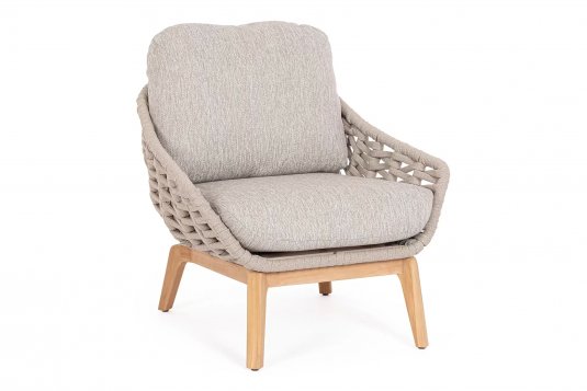Fotel do ogrodowego patio i do wnętrz o nowoczesnej konstrukcji z drewna teakowego / lina polipropylenowa i Olefinowe poduszki w beżu / Fotel 79,5 cm szerokości