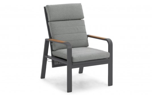 Fotel wypoczynkowy aluminiowy z płynnie odchylanym oparciem / wstawki teak w podłokietnikach / poduszka wodoodporna z przeszyciami / opcjonalny podnóżek