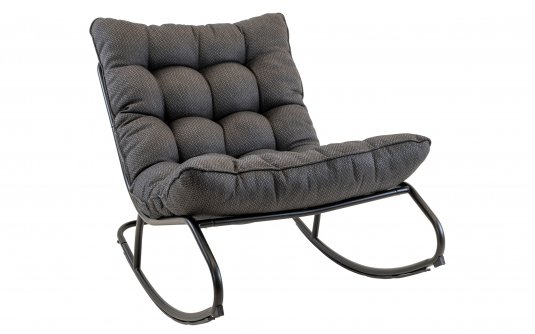 Nowoczesny fotel bujany wypoczynkowy o lekkiej stalowej konstrukcji czarny mat / gruba przytulna poduszka z obiciem z materiału Olefin
