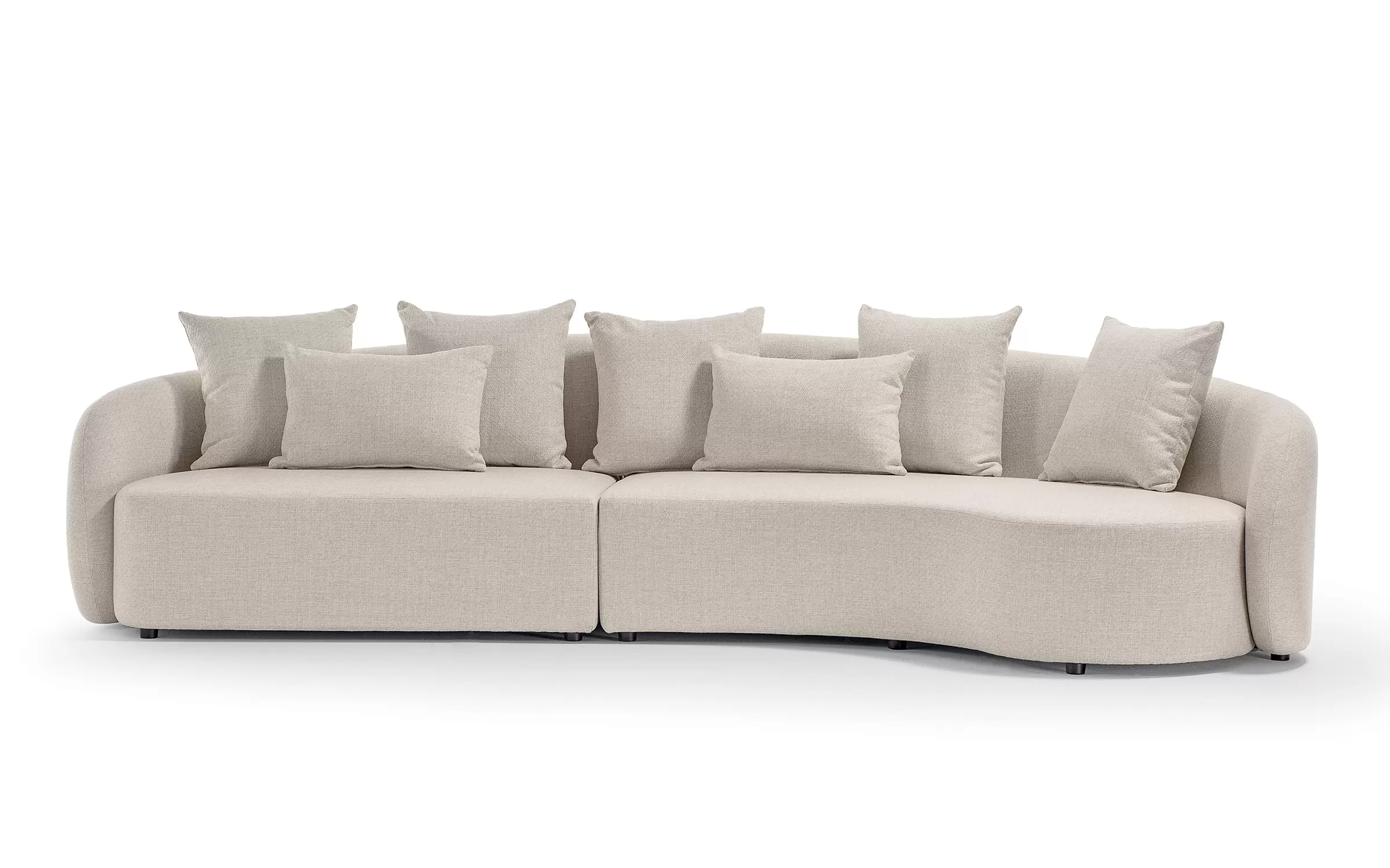 Sercem sofy złożonej z 2 elementów jest obszerne, miękkie siedzisko oraz otulające oparcie, które wraz z puszystymi poduszkami tworzą wyjątkowo przytulny azyl na tarasie lub przy basenie. Zastosowane materiały tapicerskie o szlachetnej strukturze są w pełni przystosowane do warunków zewnętrznych – wykazują wysoką odporność na wilgoć oraz promieniowanie UV, zachowując swoją miękkość przez lata.