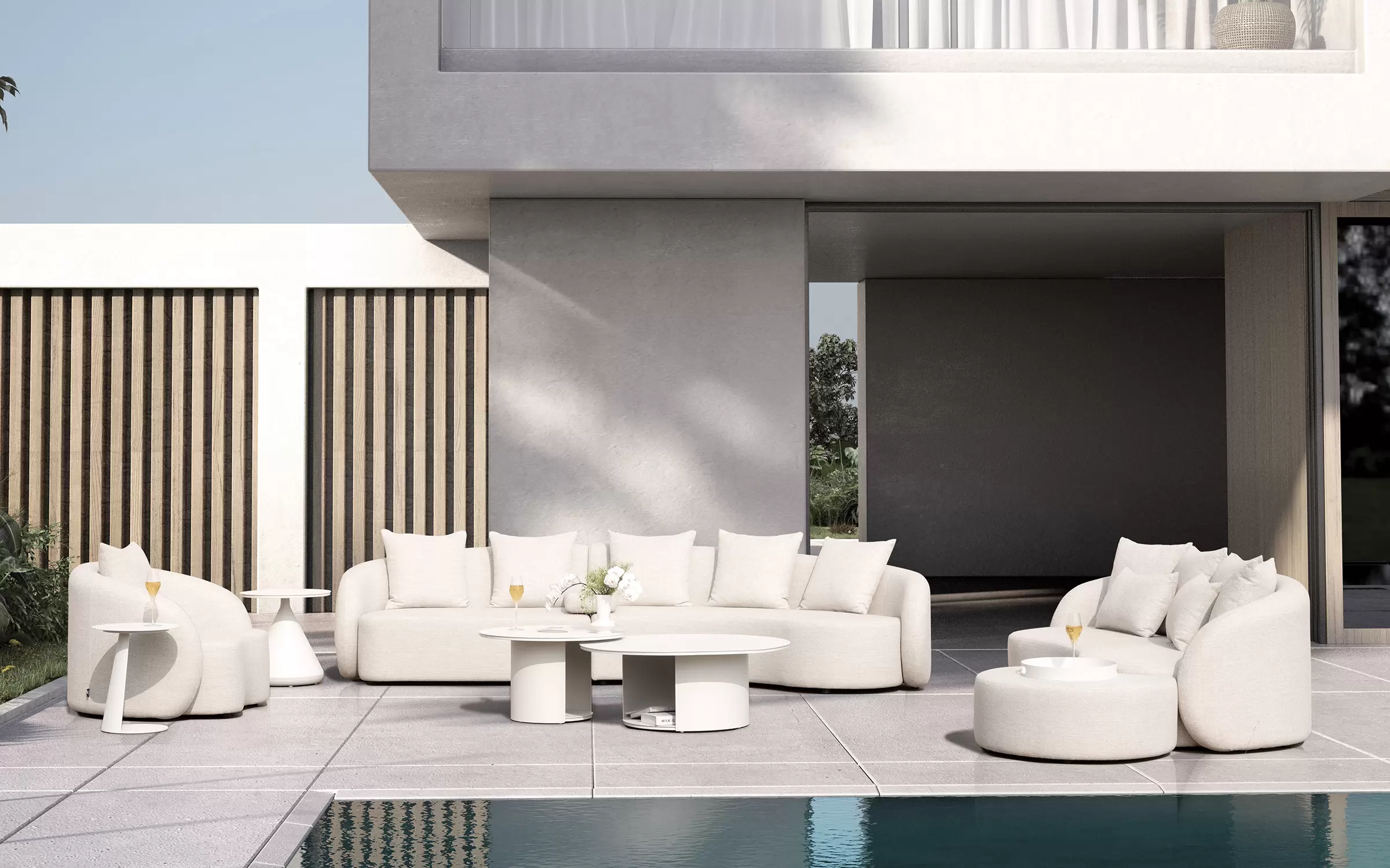 COSY Sofa na taras marki Grattoni to symbol elegancji na tarasie, która redefiniuje pojęcie wypoczynku pod gołym niebem. Jej organiczna, zaokrąglona sylwetka nie tylko przyciąga wzrok nowoczesnym designem, ale też naturalnie wpisuje się w każdą zieloną przestrzeń.