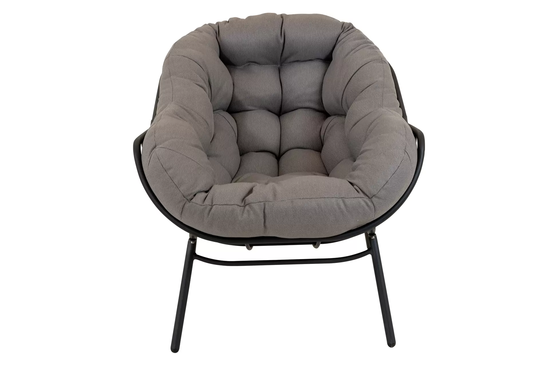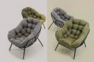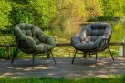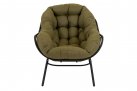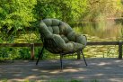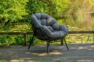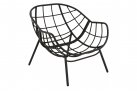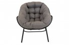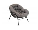 Nowoczesny fotel wypoczynkowy o lekkiej aluminiowej konstrukcji malowanej proszkowo na kolor czarny matowy. Kubełkowe siedzisko z obfitą poduszką z materiału Olefin.