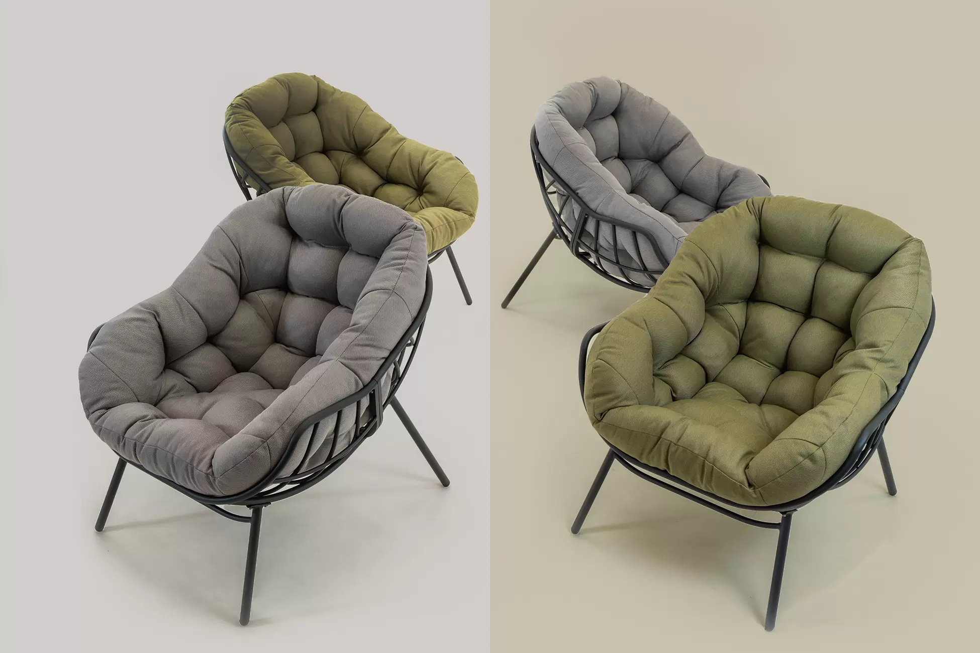 Materiał na obicie tapicerki składa się z tkaniny 270g/m² Olefin. Poszewki zdejmowane na siedzisku i oparciu.