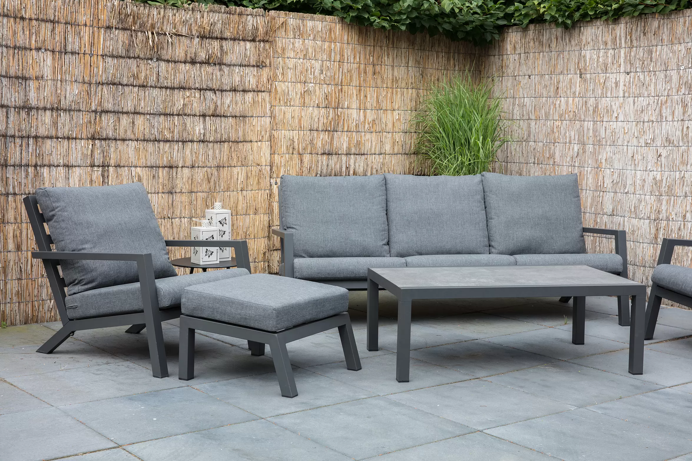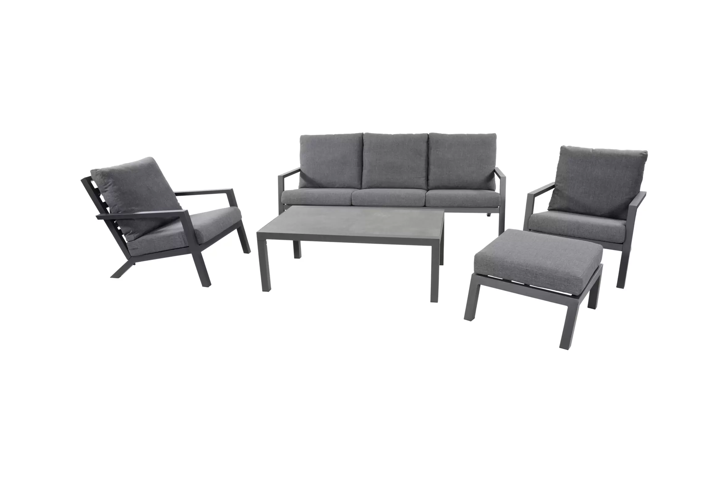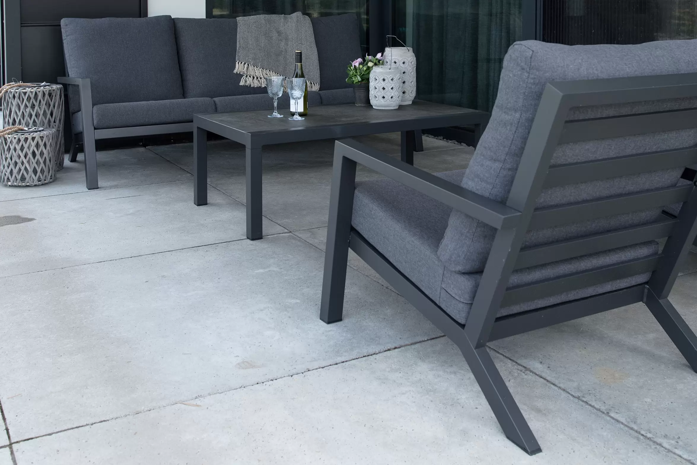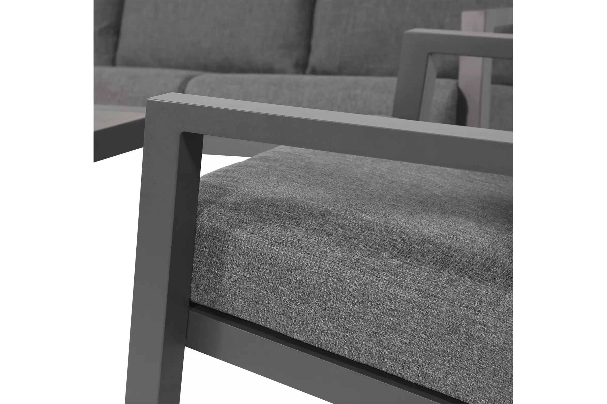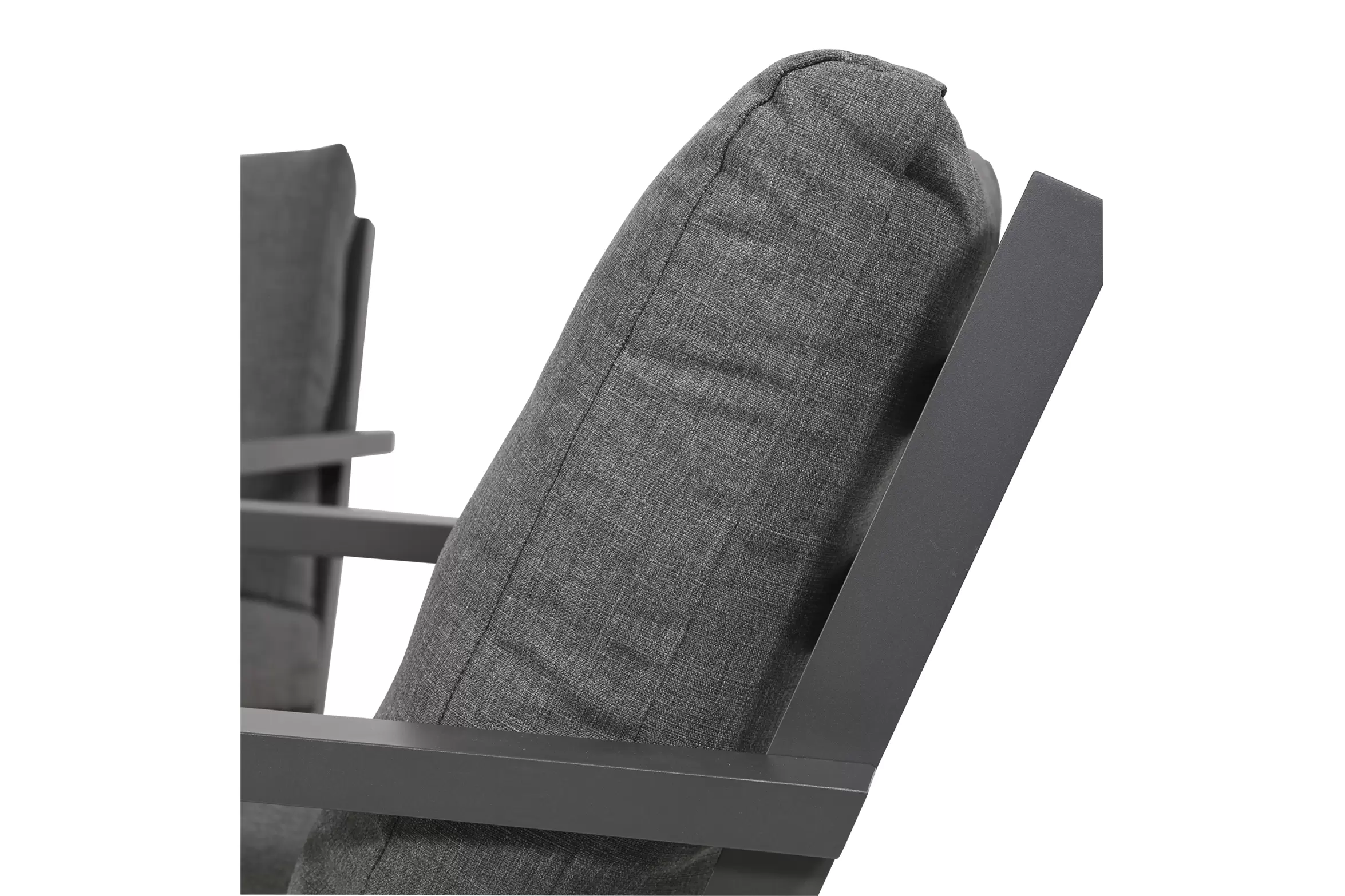 Aluminiowa konstrukcja malowana proszkowo w kolorze ciemnoszarym. Konstrukcja częściowo skręcana. Na siedzisku pod poduszkami