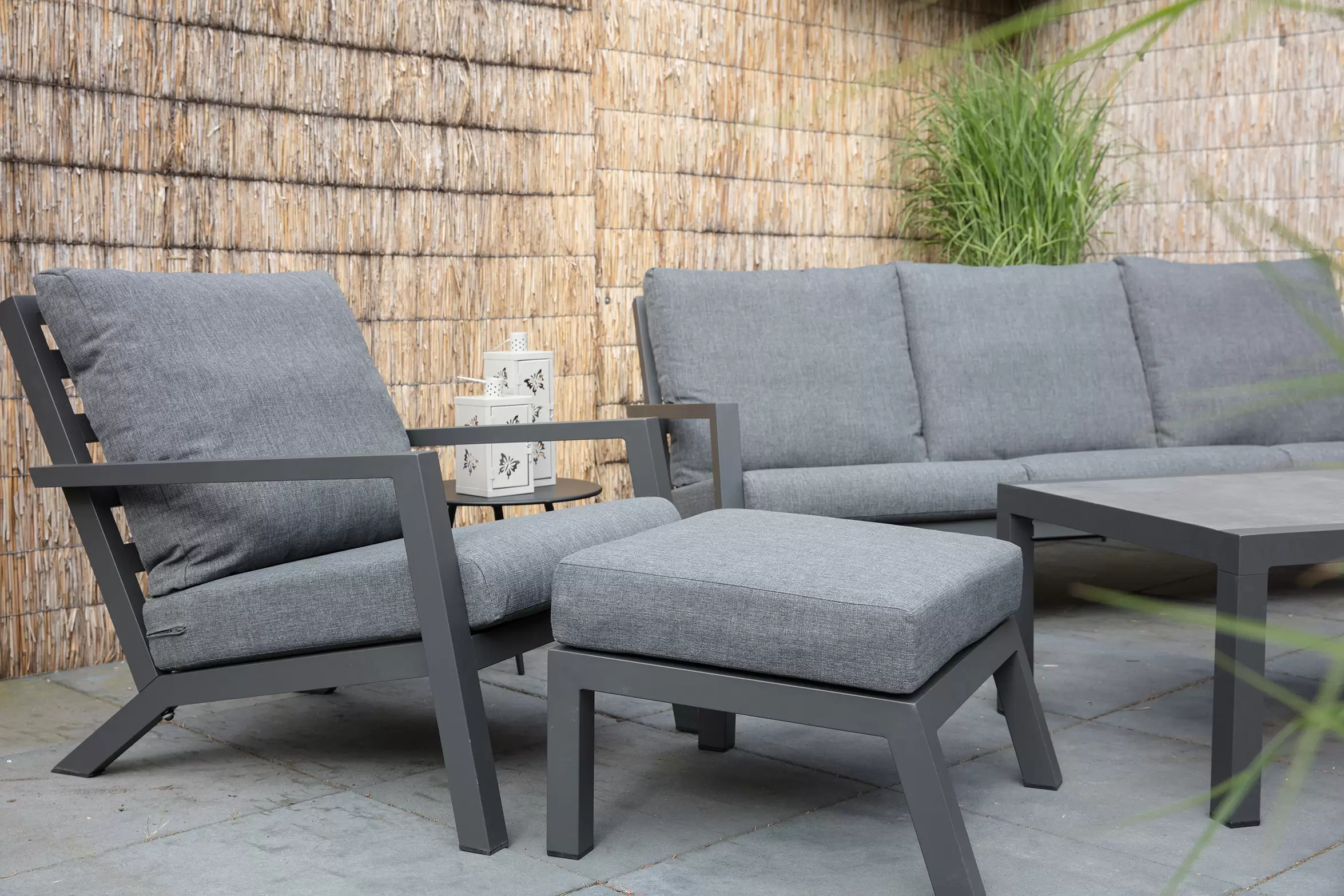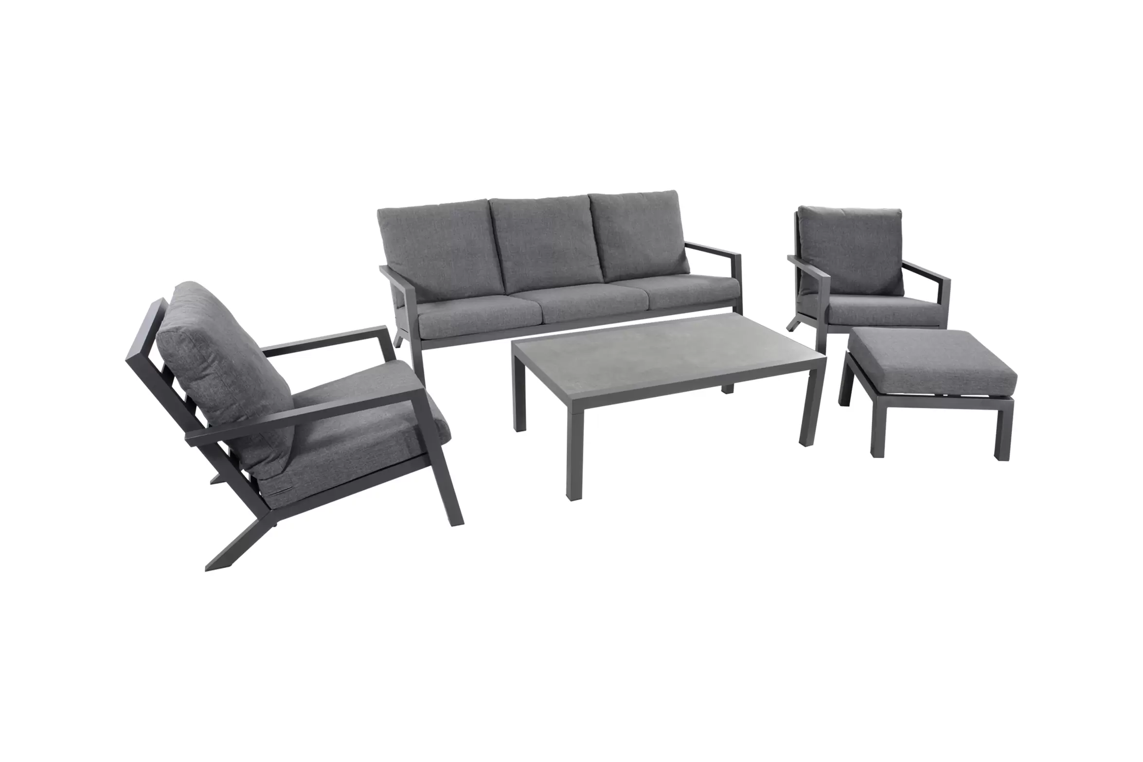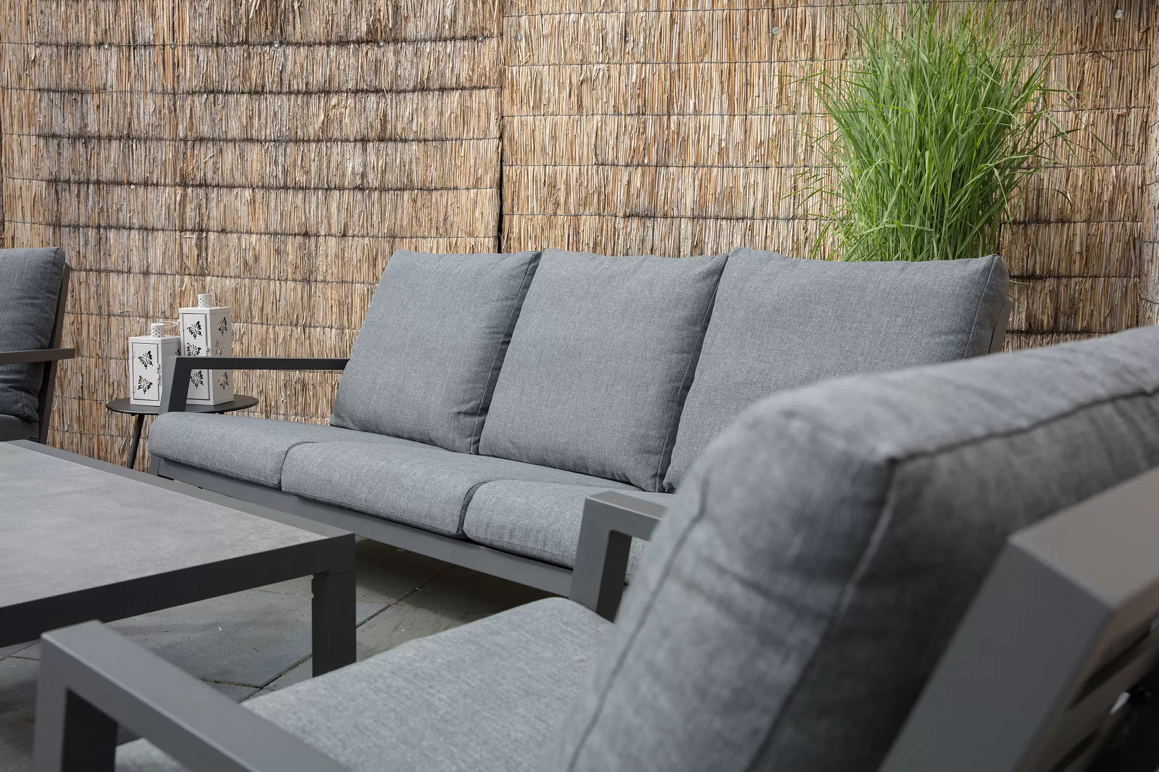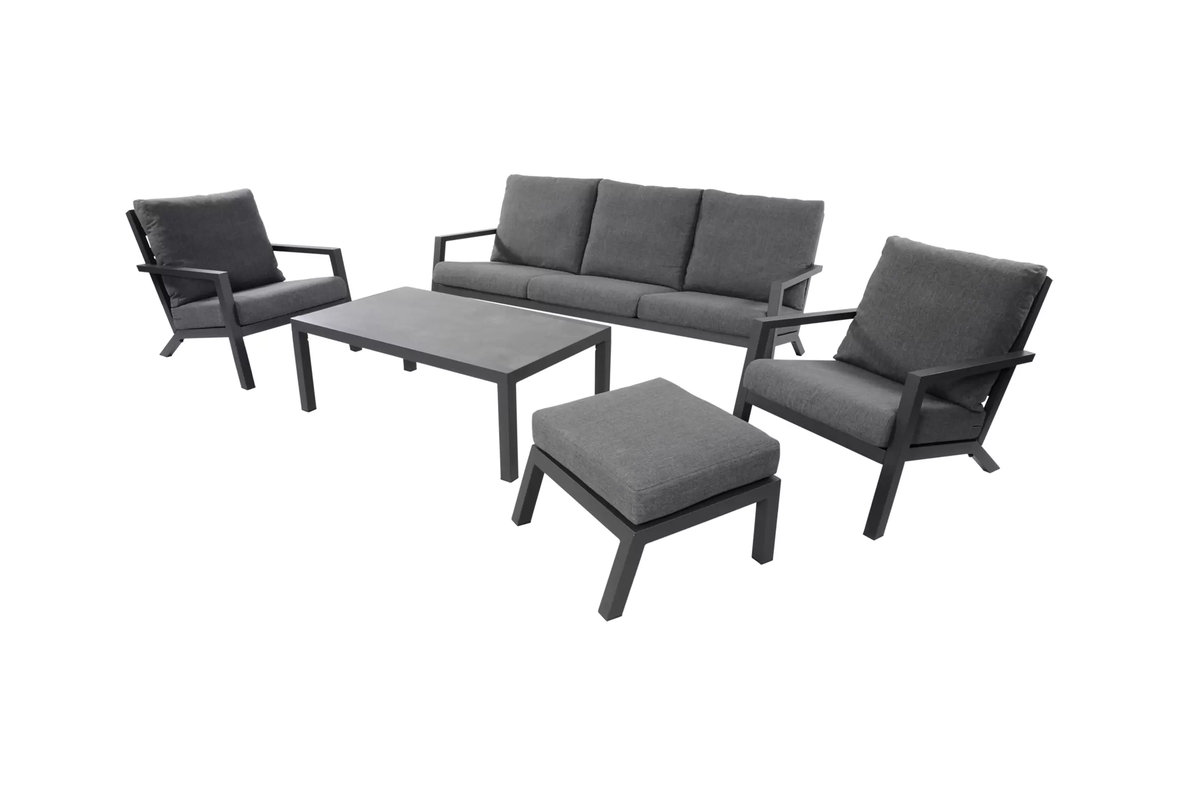 Meble wypoczynkowe są dostarczane z wodoodporną tapicerką siedziska i oparcia. Grubość poduszek siedziska: 12 cm.